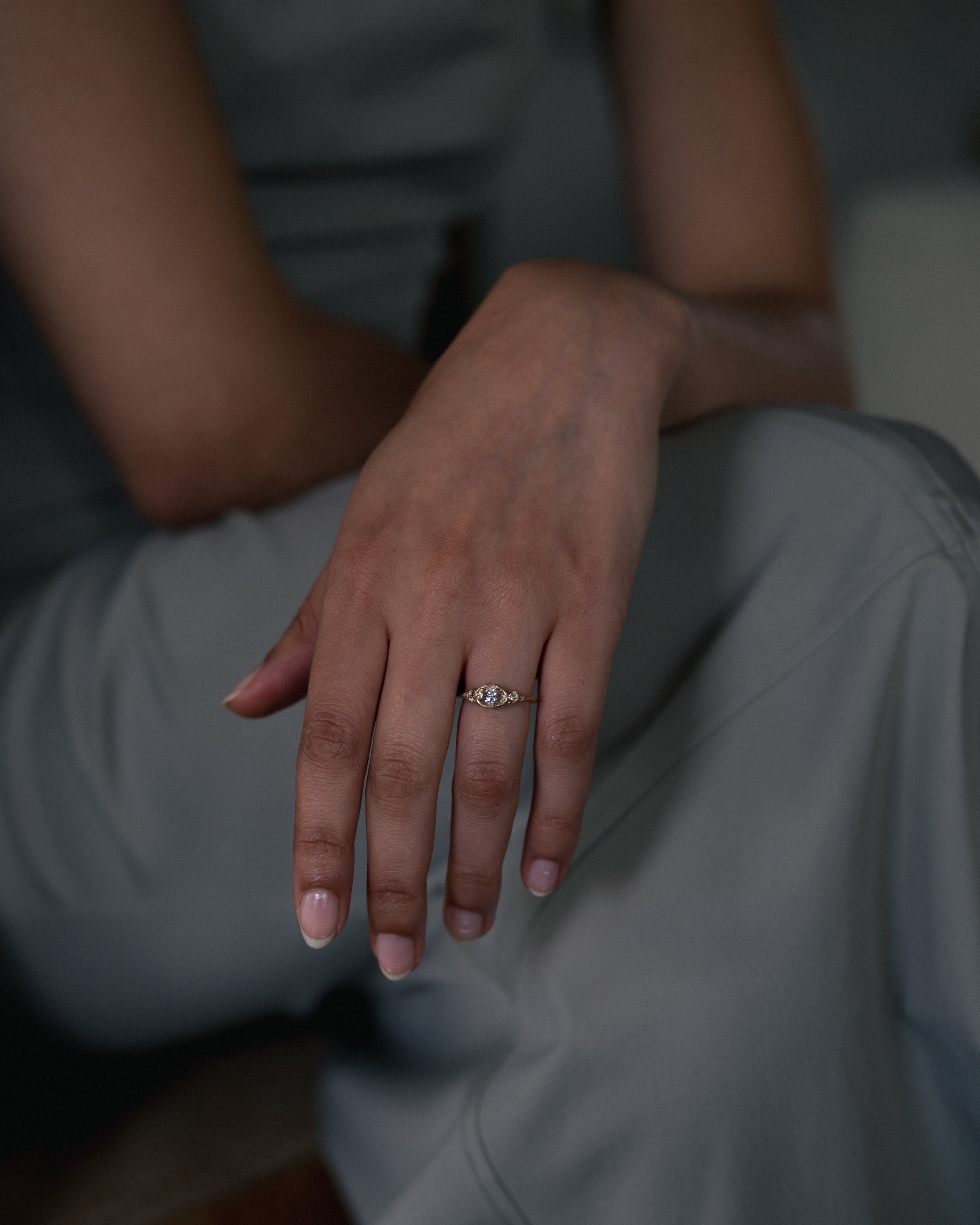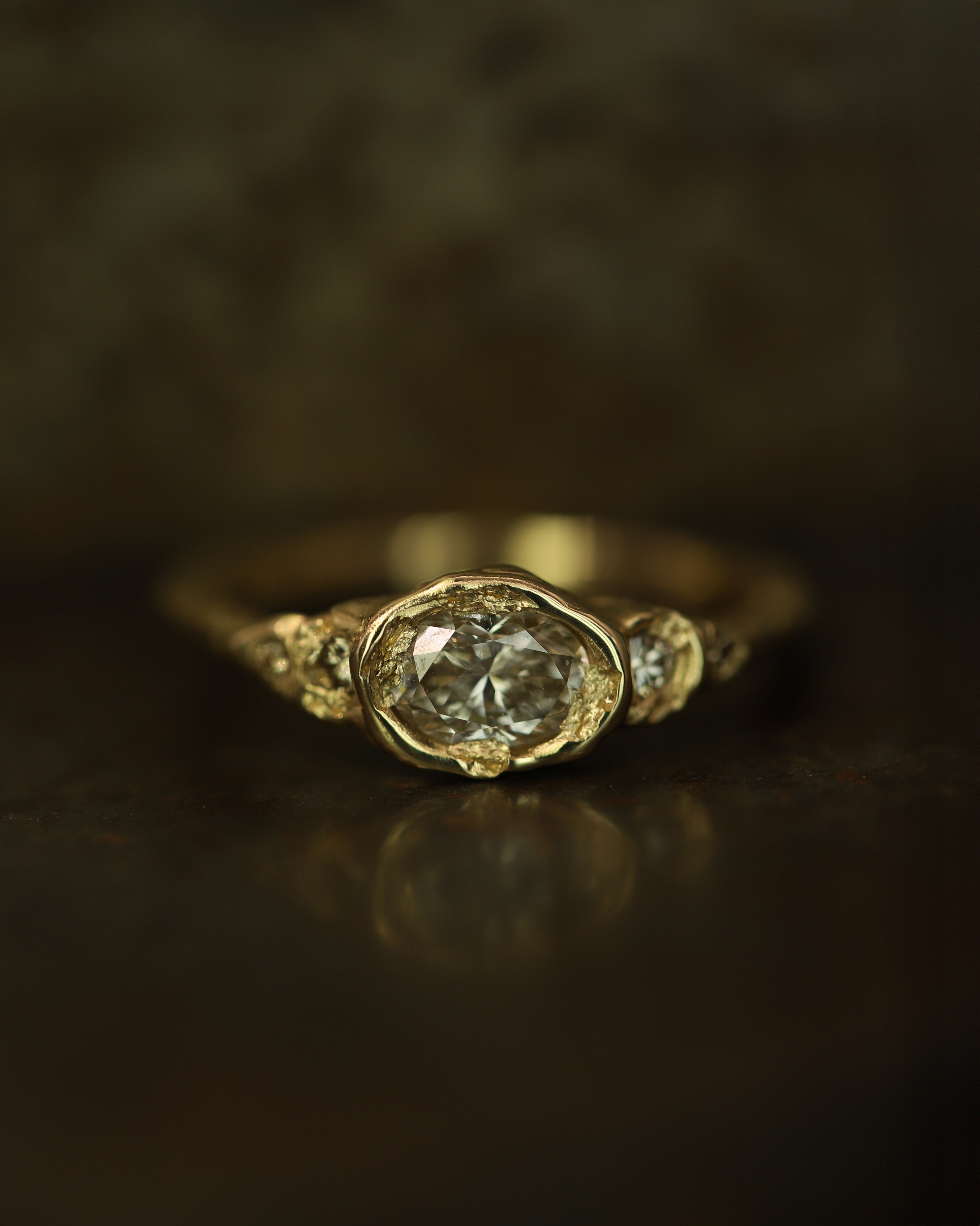 The Armach 1.2ct Oval & Round Five Stone Diamond Organic Engagement Ring features a single honey-hued champagne diamond at its centre surrounded by round diamonds, set in softly textured gold. Perfect as an alternative engagement ring; worn solo, or stacked with other styles.