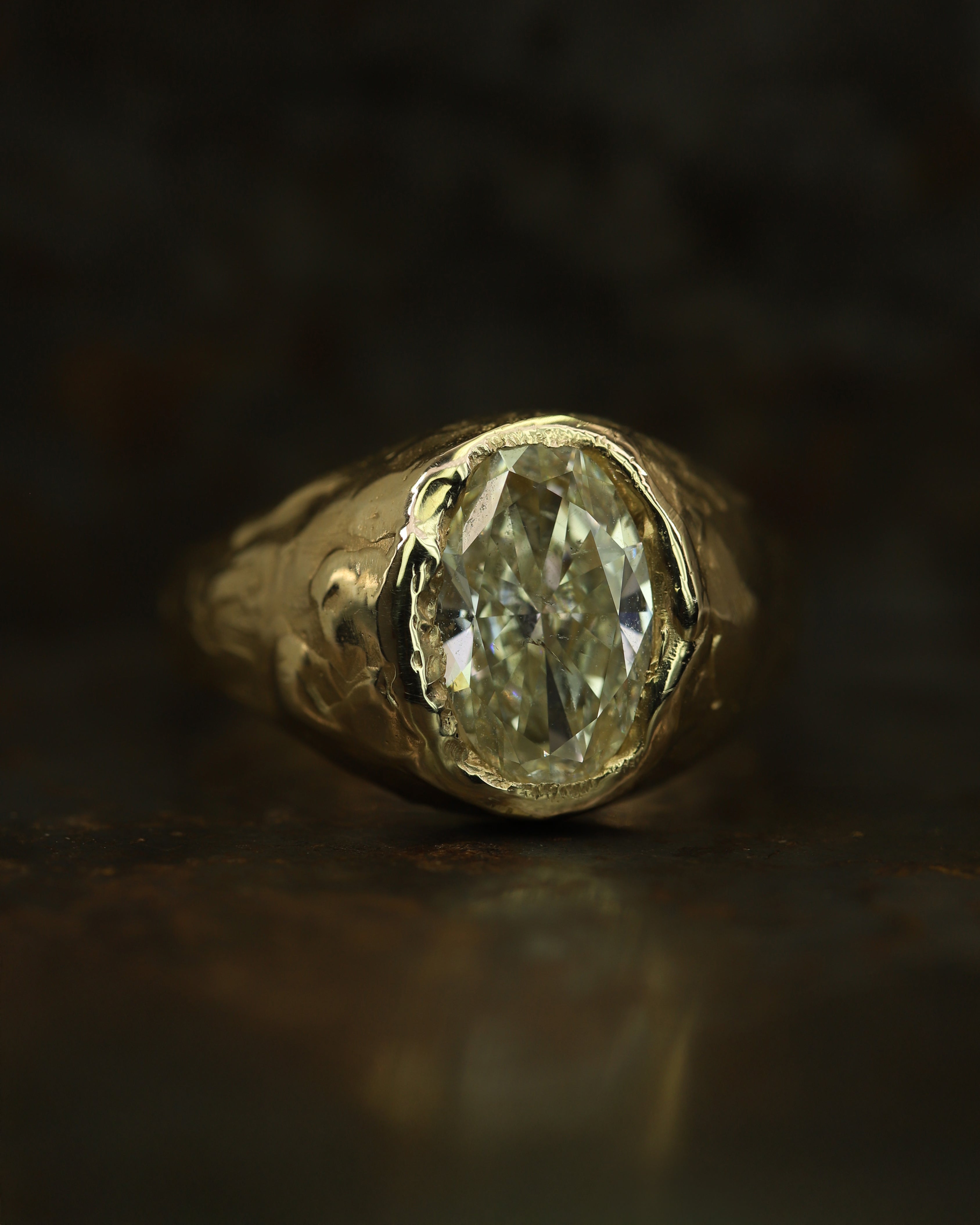 The Armach 2.8ct Oval Lemon Diamond Organic Engagement Signet Ring is inspired by the medieval jewellery hoards which have been found across Scotland.