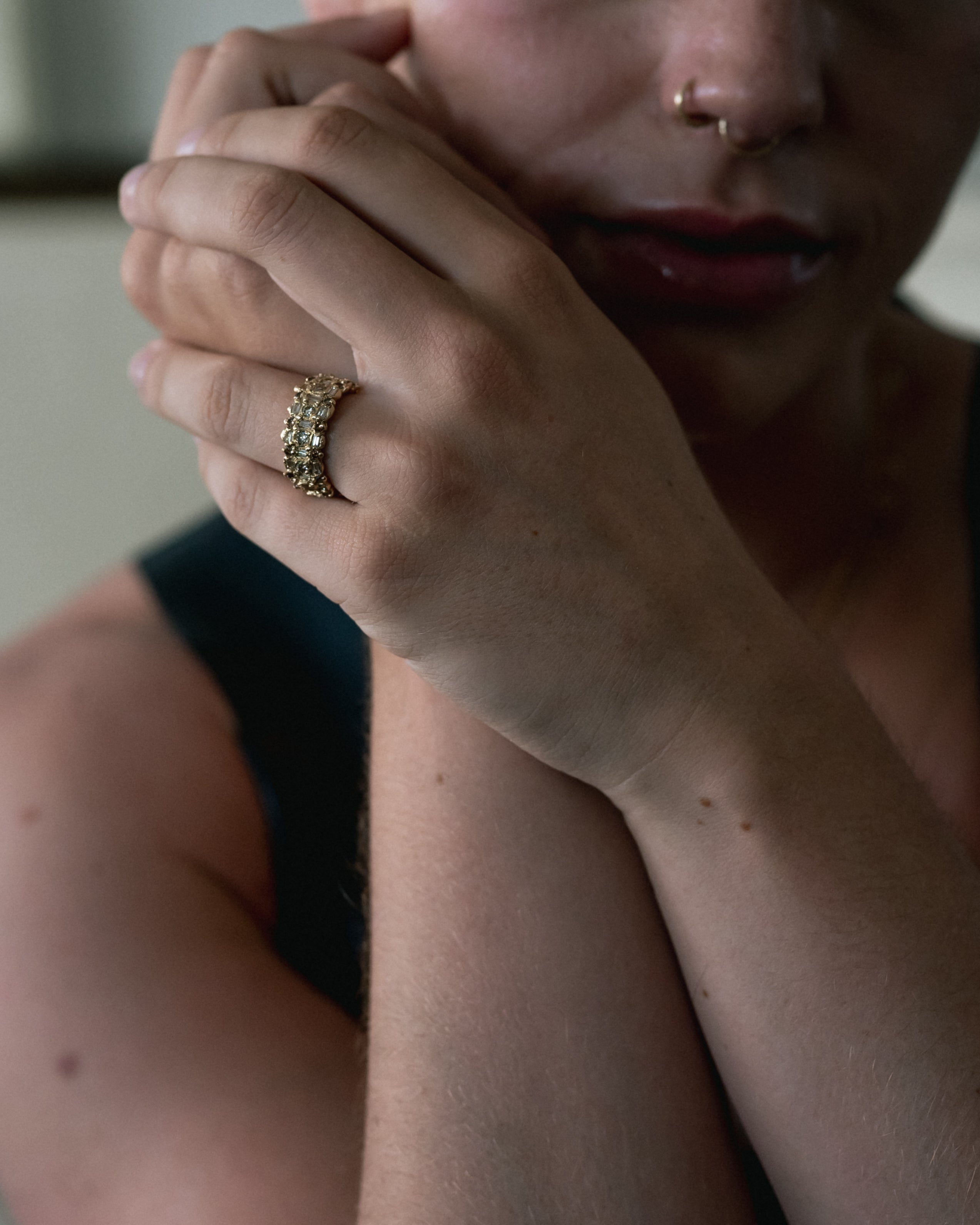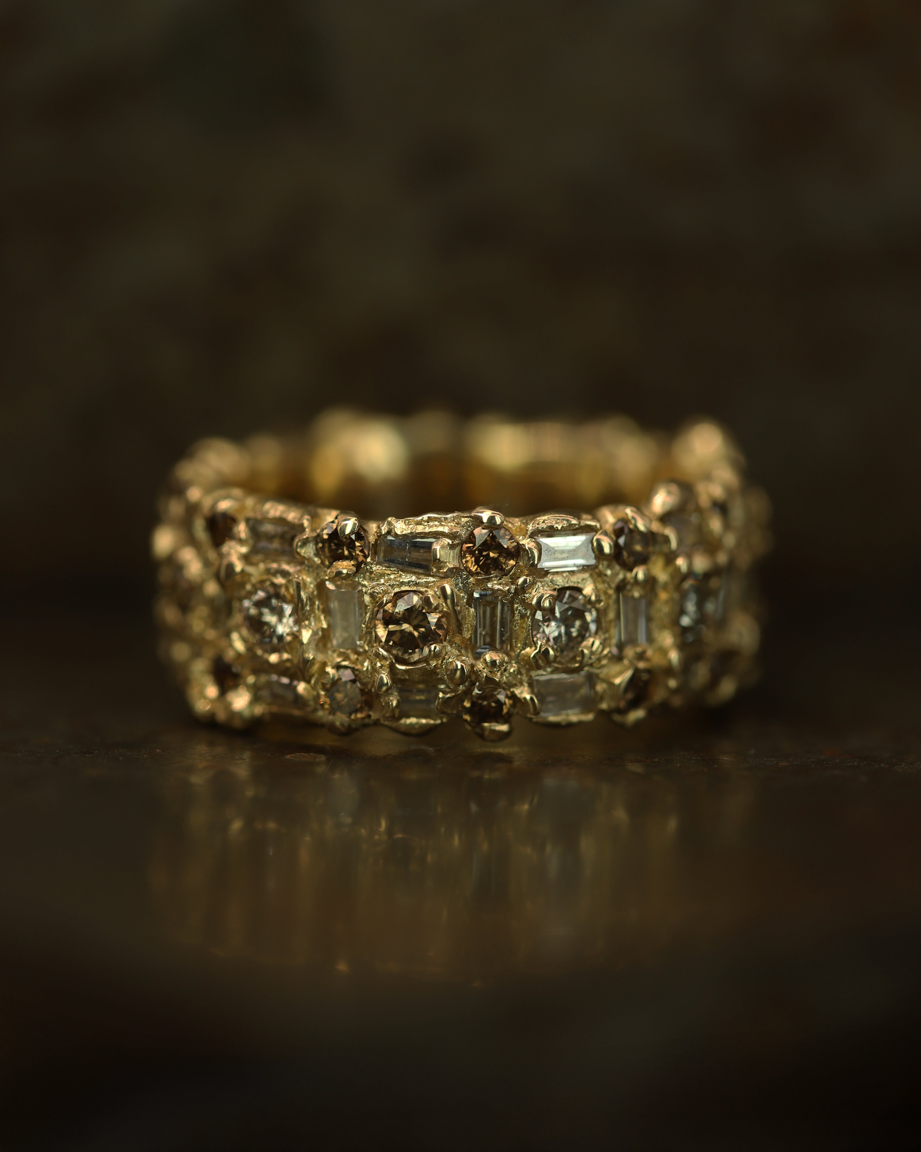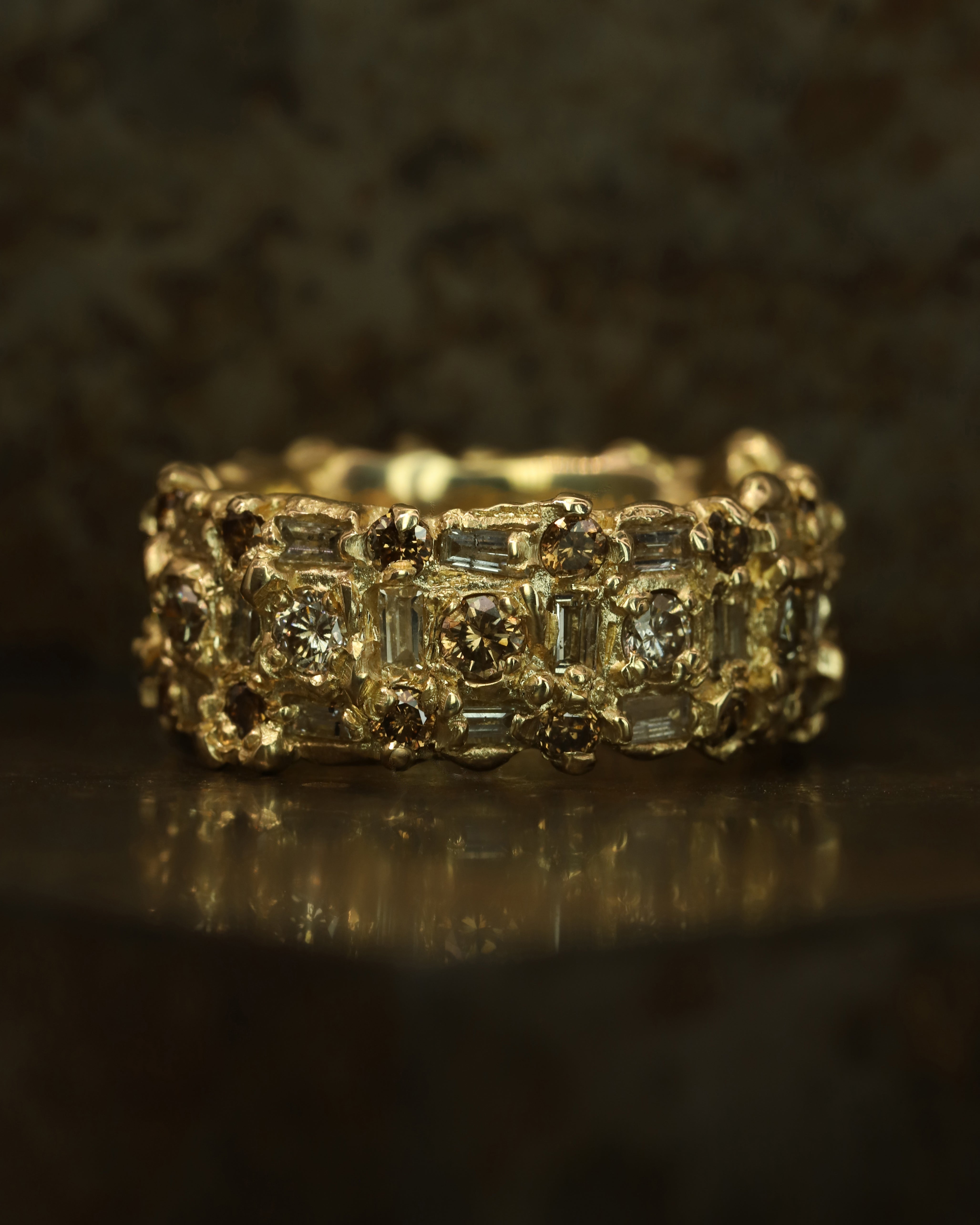 The Armach Diamond Eternity Ring IV is inspired by the medieval jewellery hoards which have been found across Scotland. Honey-hued diamonds flow into one another, organically set as though they have just been excavated. Perfect as an alternative wedding ring, eternity ring or everyday ring. Wear solo or stack up with other rings in the collection.