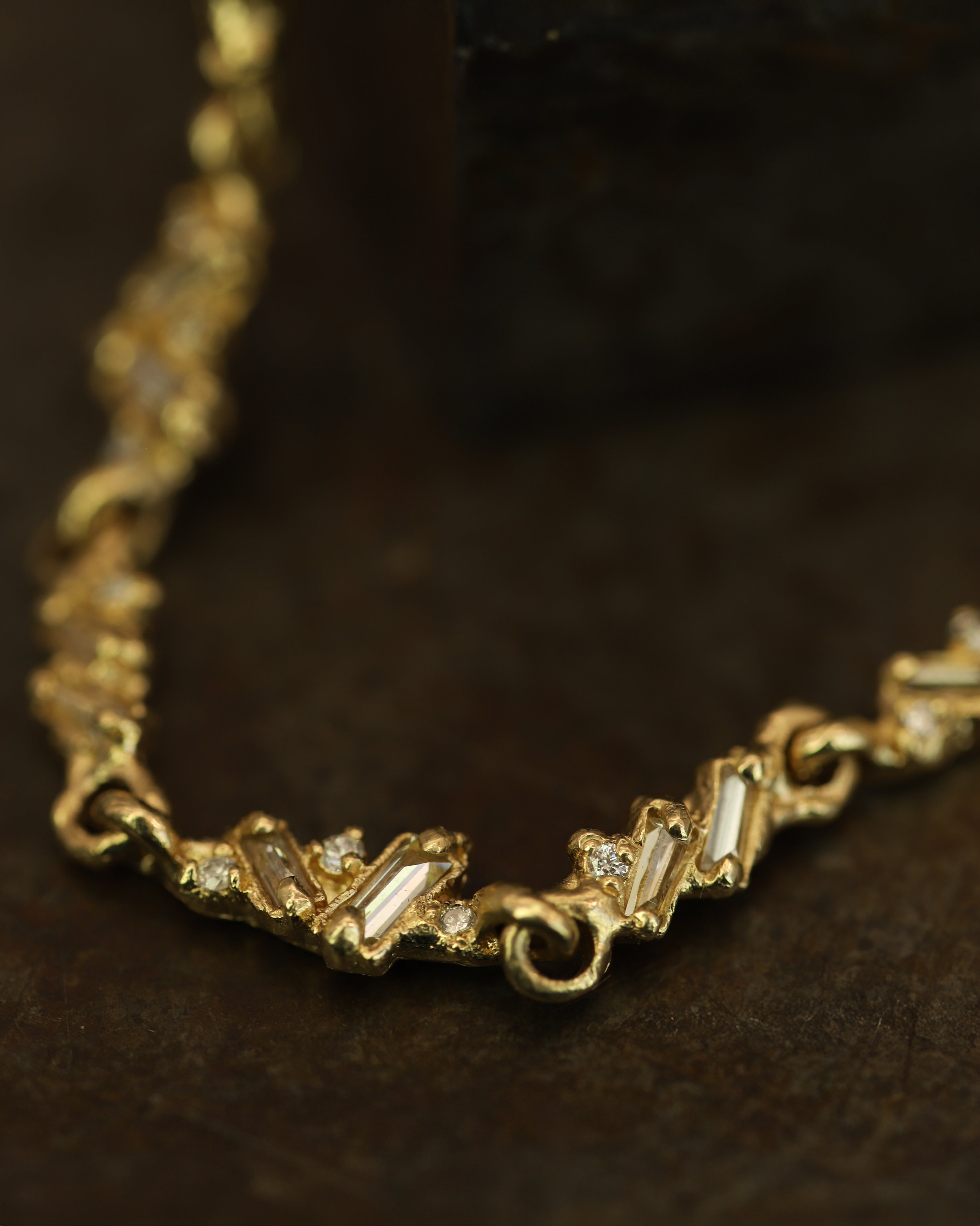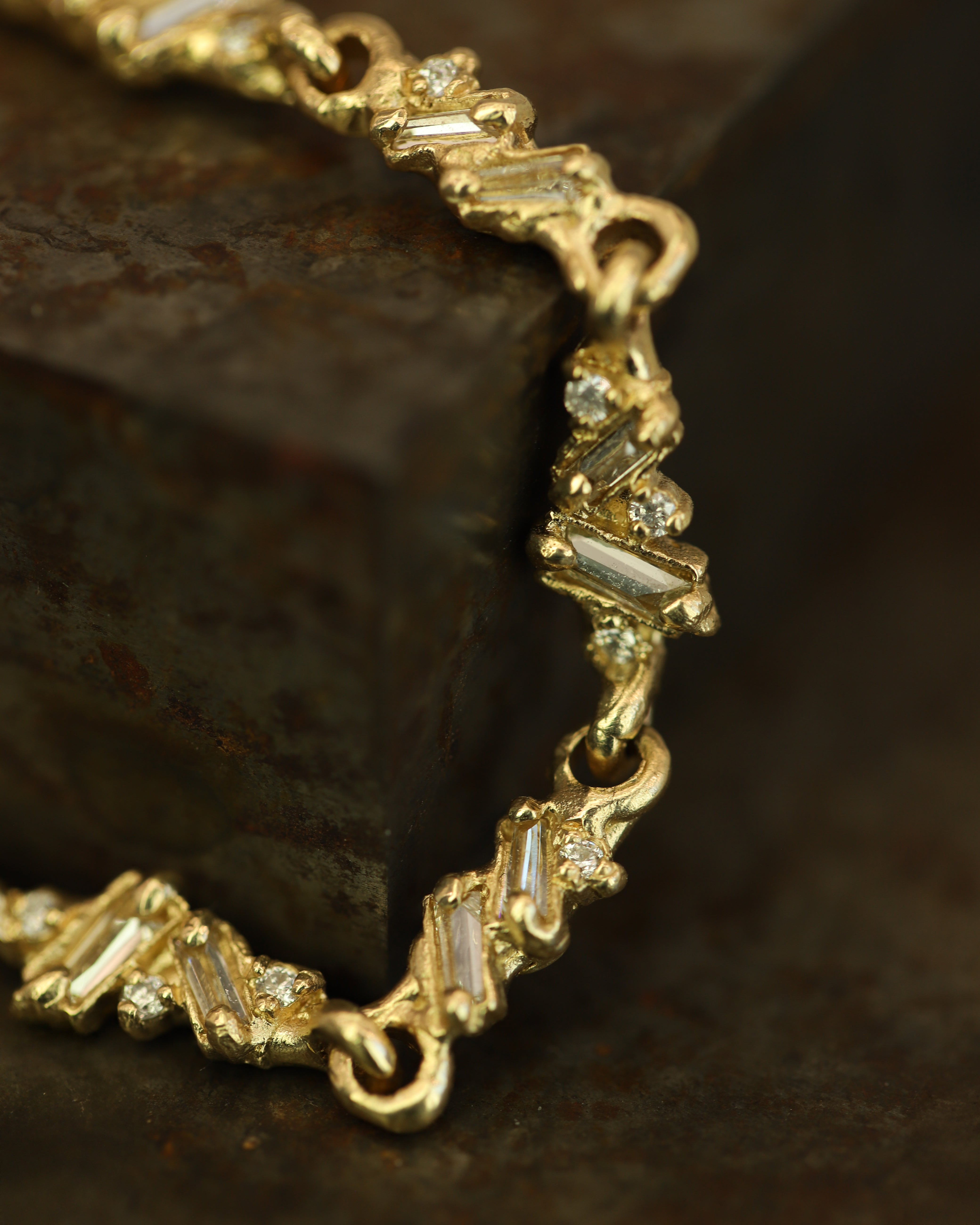 The Armach Mixed Diamond Scatter Bracelet V is the alternative take on the traditional diamond bracelet; baguette and round diamonds are organically set in molten yellow gold.