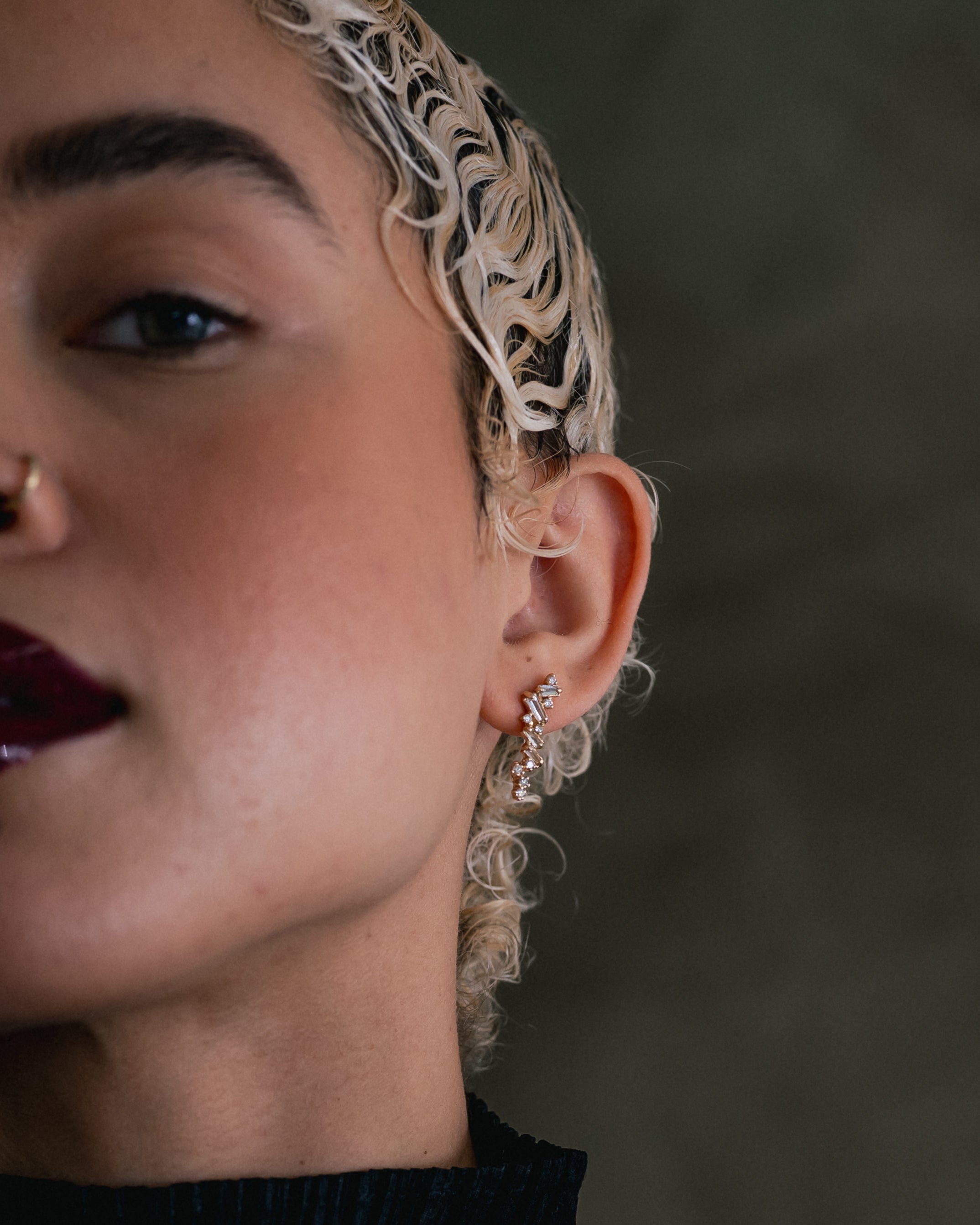 Intricately detailed, the subtle texture of the earrings catch in the light, contrasting with the baguette and brilliant cut diamonds. Wear solo, or pair with smaller studs in the collection for a fully curated ear.