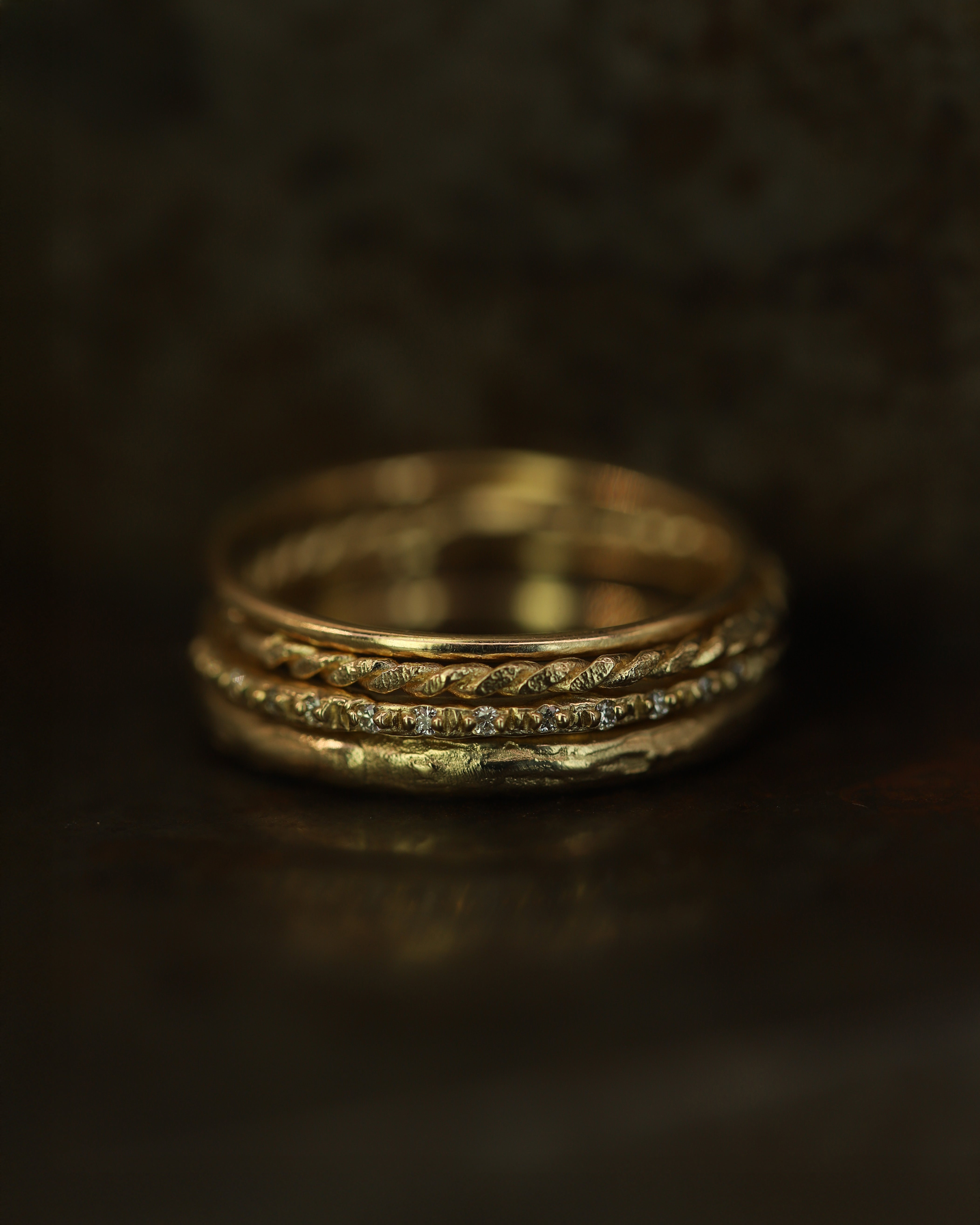 These pieces are made for couples looking for something less conventional, whether it’s an organic engagement ring, a distinctive eternity band, or a textured wedding ring. With a colour palette drawn from the Scottish landscape, created to reflect the natural tones of sunsets, and shifting autumn skies; warm, earthy, and quietly dramatic.