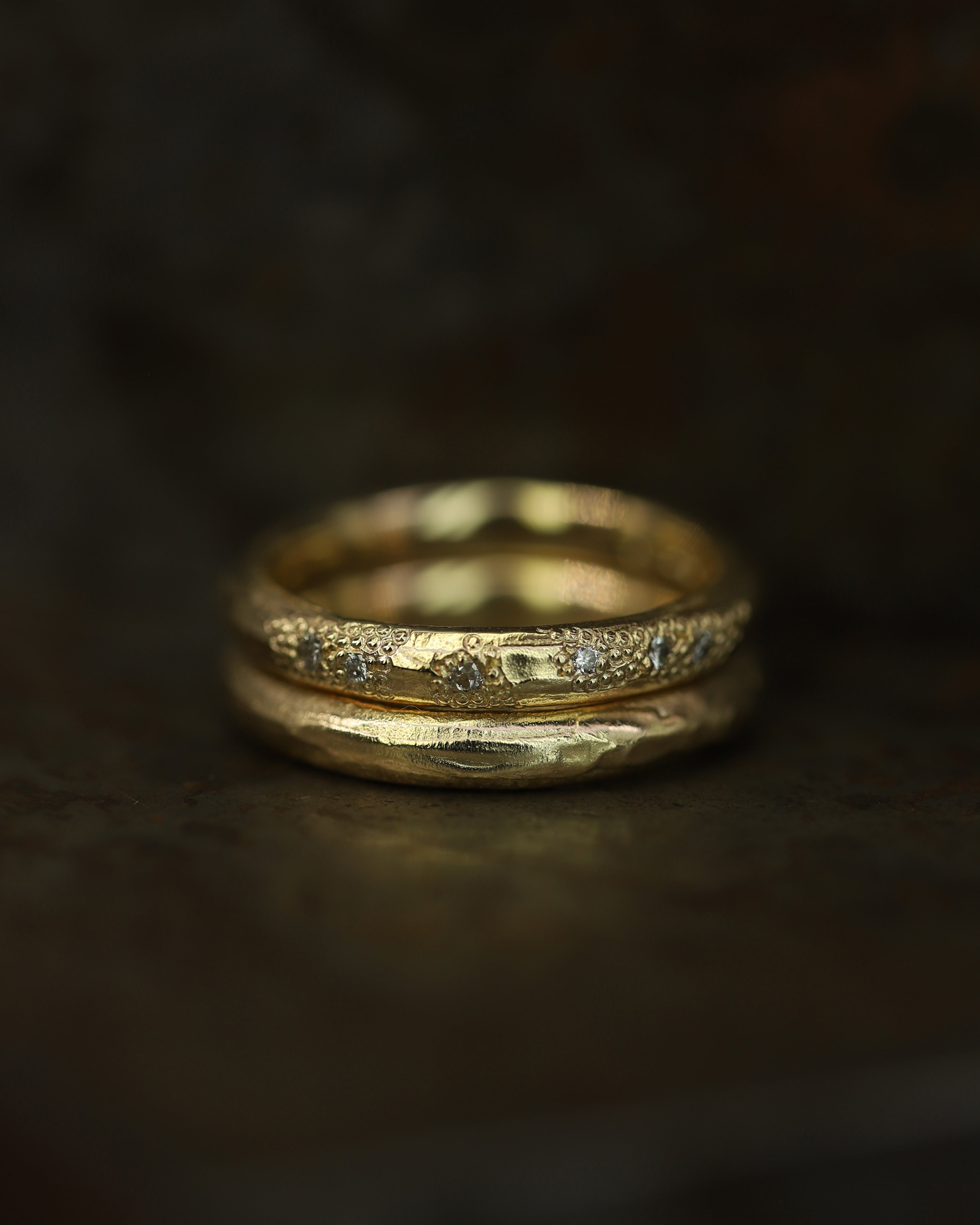 These pieces are made for couples looking for something less conventional, whether it’s an organic engagement ring, a distinctive eternity band, or a textured wedding ring. With a colour palette drawn from the Scottish landscape, created to reflect the natural tones of sunsets, and shifting autumn skies; warm, earthy, and quietly dramatic.
