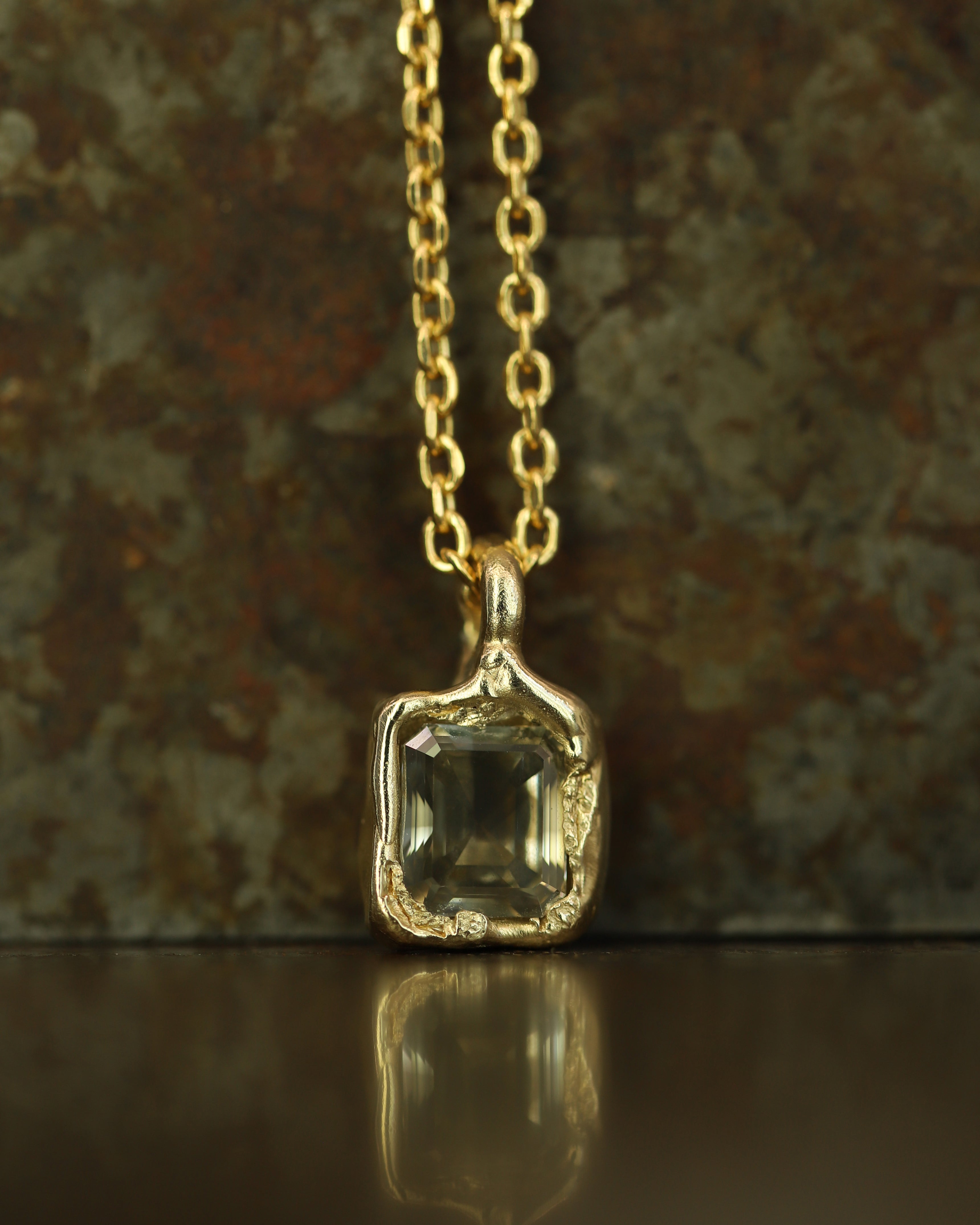 Lightweight and easy to wear, the subtle textures of the gold catches in the light; contrasting with the deep green diamond. Wear solo, or pair with other pieces in the collection. The perfect statement pendant necklace.