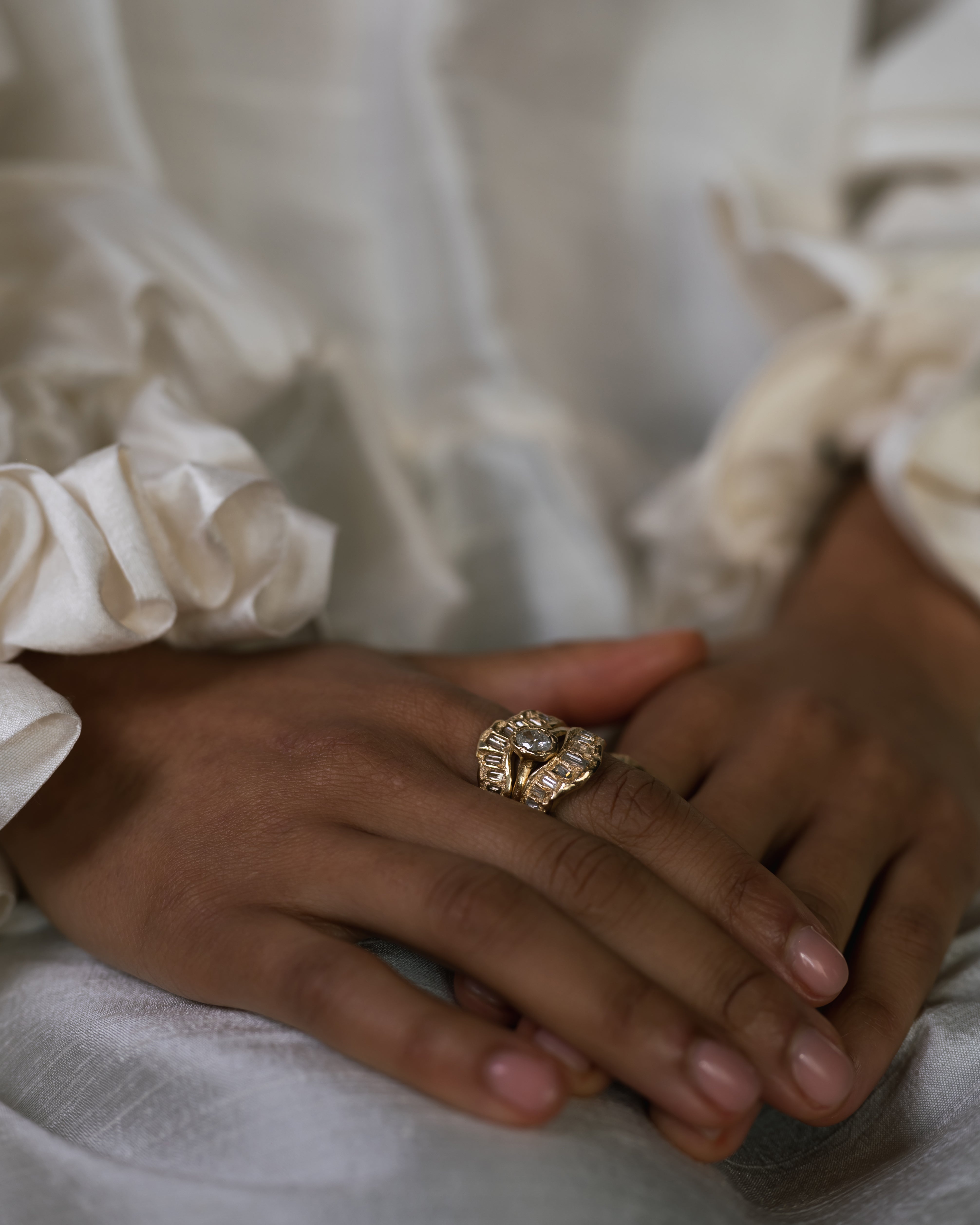Legacy draws on the feeling of uncovering something precious - light catching on a surface, a glint of something rare. The collection features reverse-set baguette diamonds in soft yellow and champagne shades, designed to reflect light in subtle, surprising ways.