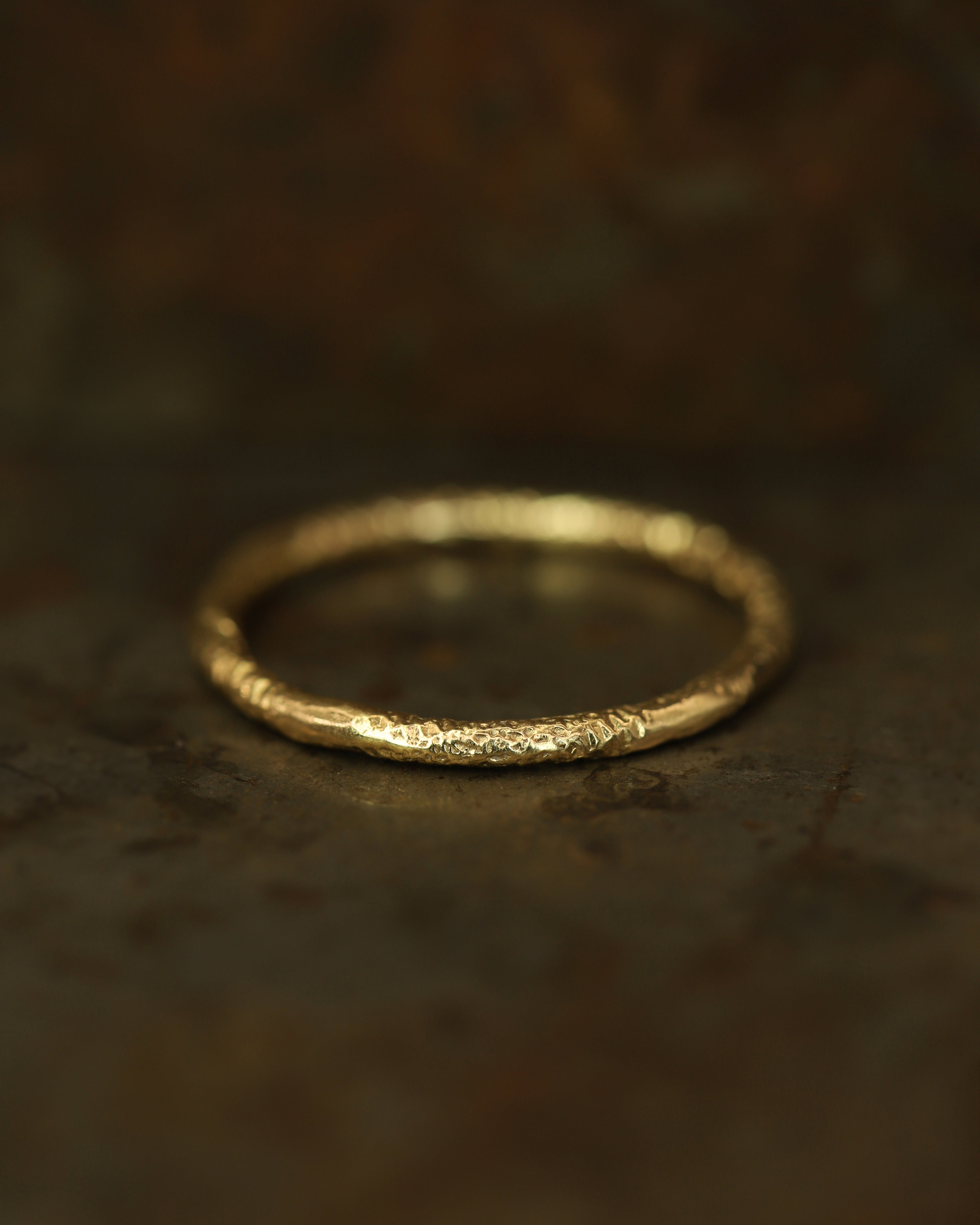 The XIX 1.3mm Gold Organic Wedding Band is inspired by the medieval jewellery hoards which have been found across Scotland. A round profile band with an organic, textured finish. Perfect as an alternative wedding ring, or worn stacked up with other bands.