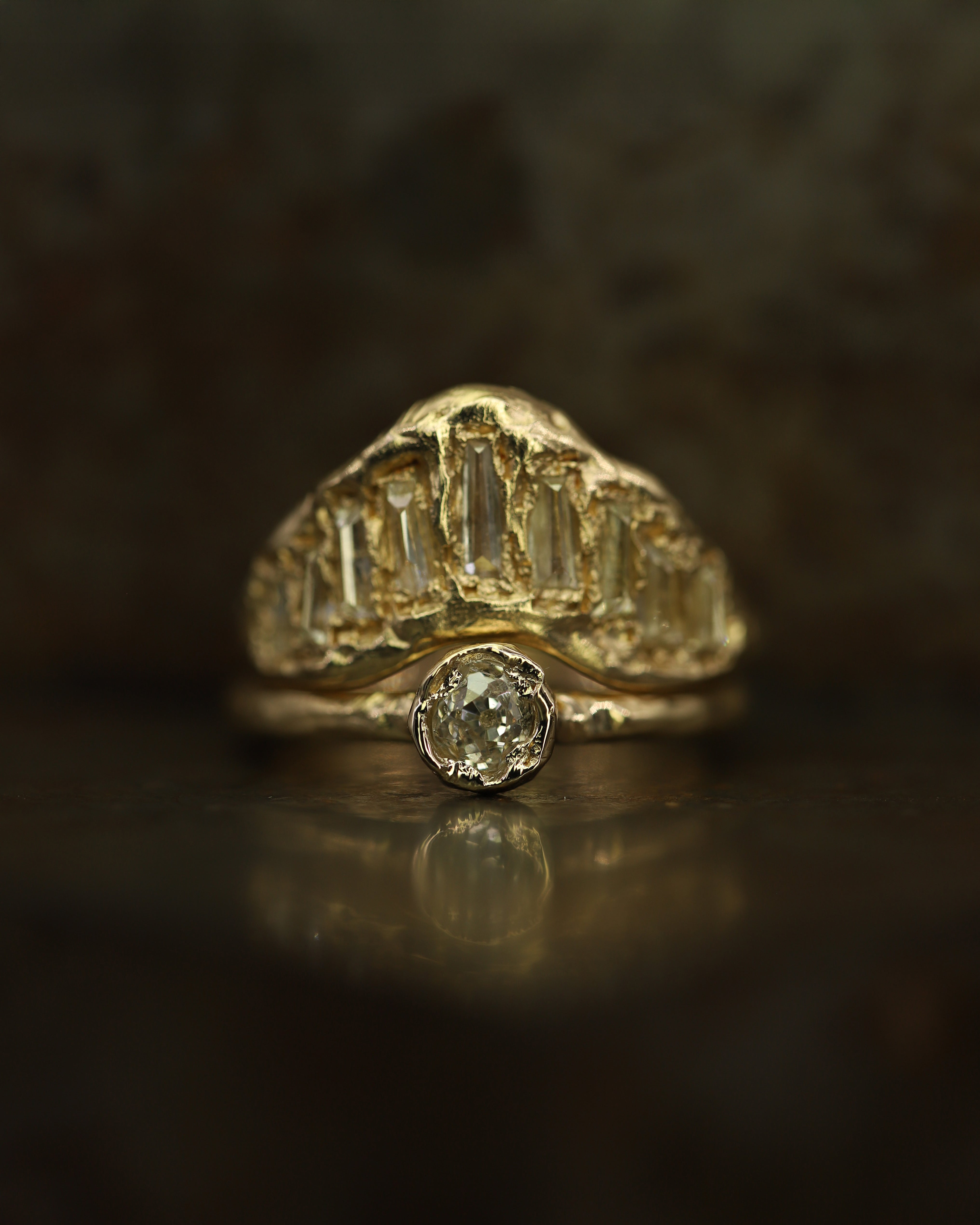 The softly distressed texture of the ring band contrasts with the old cut diamond facets. This would make a stunning alternative engagement ring, or statement ring. Pair with organic wedding bands from the collection.