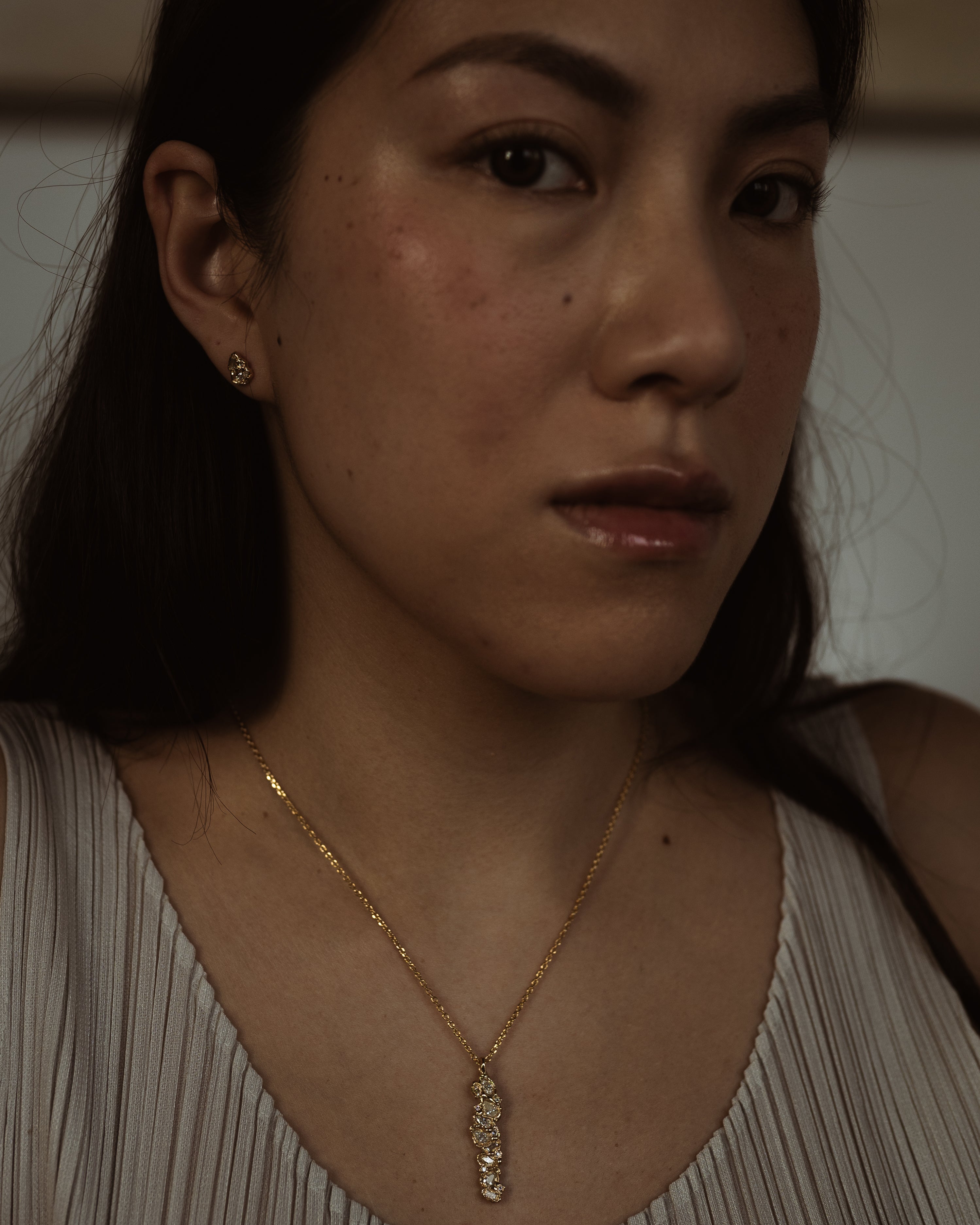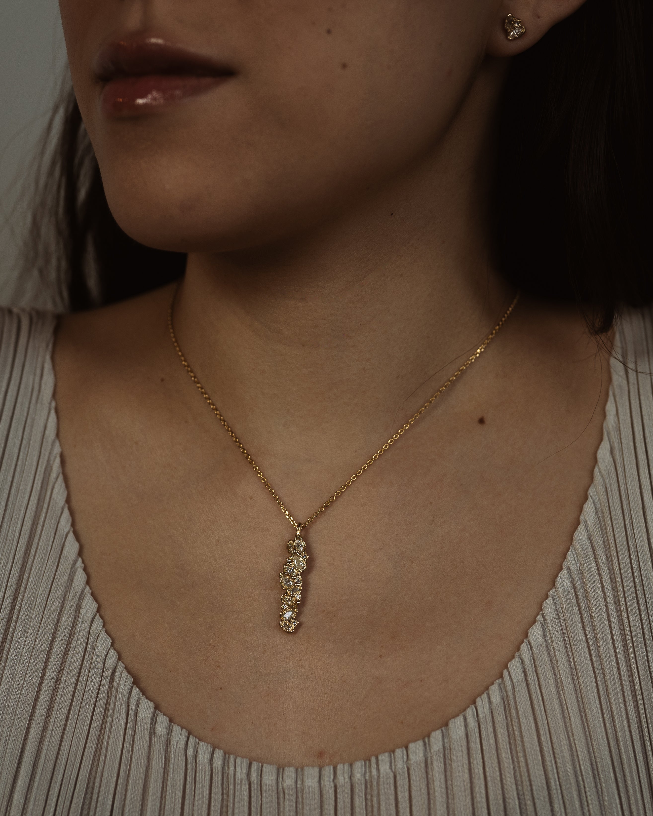 These stones are paired with icy white diamonds, scattered like flecks of treasure in textured, molten gold, to create jewellery that feels tactile and storied, combining Ellis’ erosive aesthetic with a refined sense of discovery.