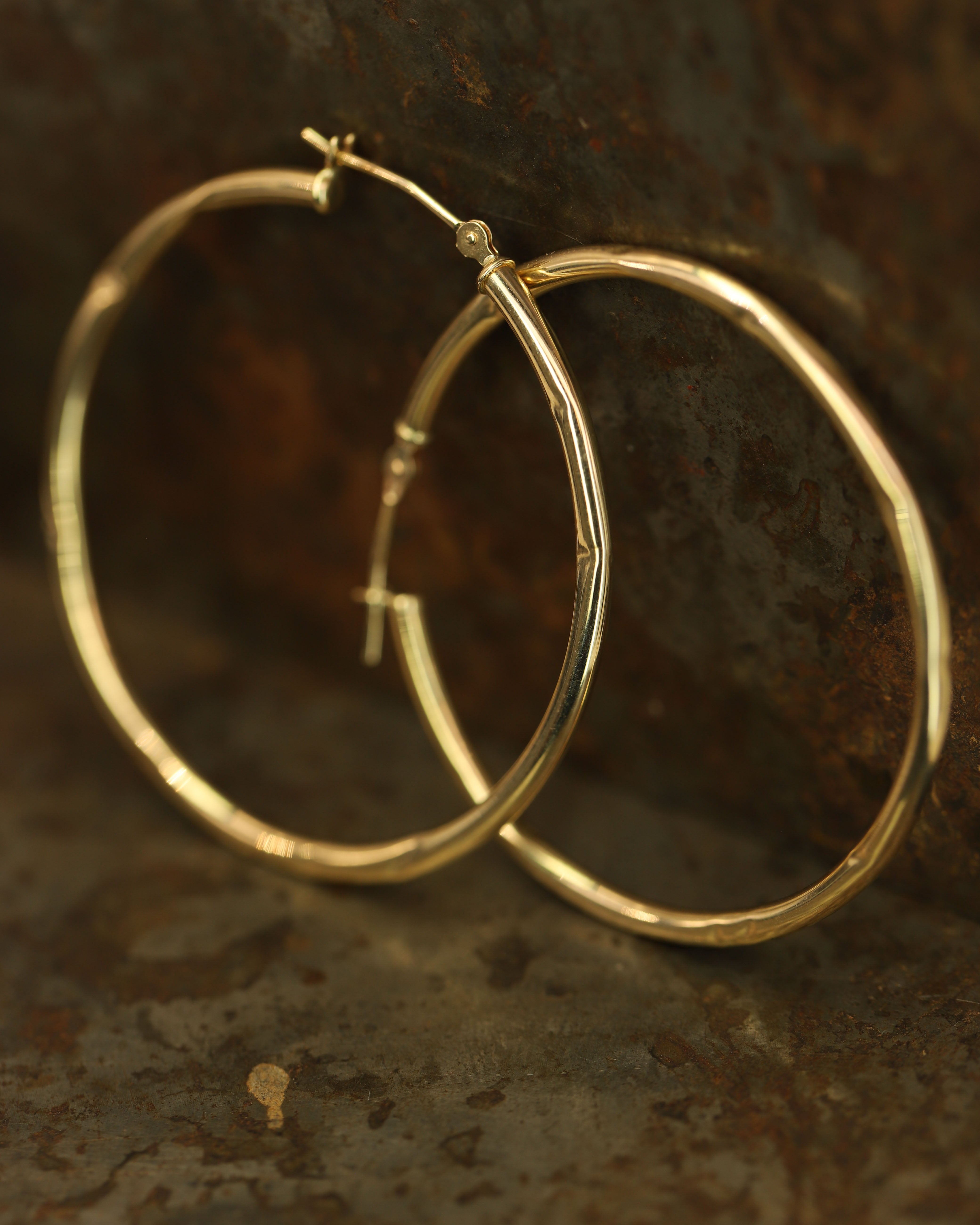 Part of the Origins collection, they are wider than the hammered hoops, but due to their hollow interior they are lightweight and easy to wear. Their hammered / crushed texture gives them an alternative take on the classic hoop. Perfect as everyday hoop earrings. Wear solo, or pair with smaller studs or hoops in the collection.