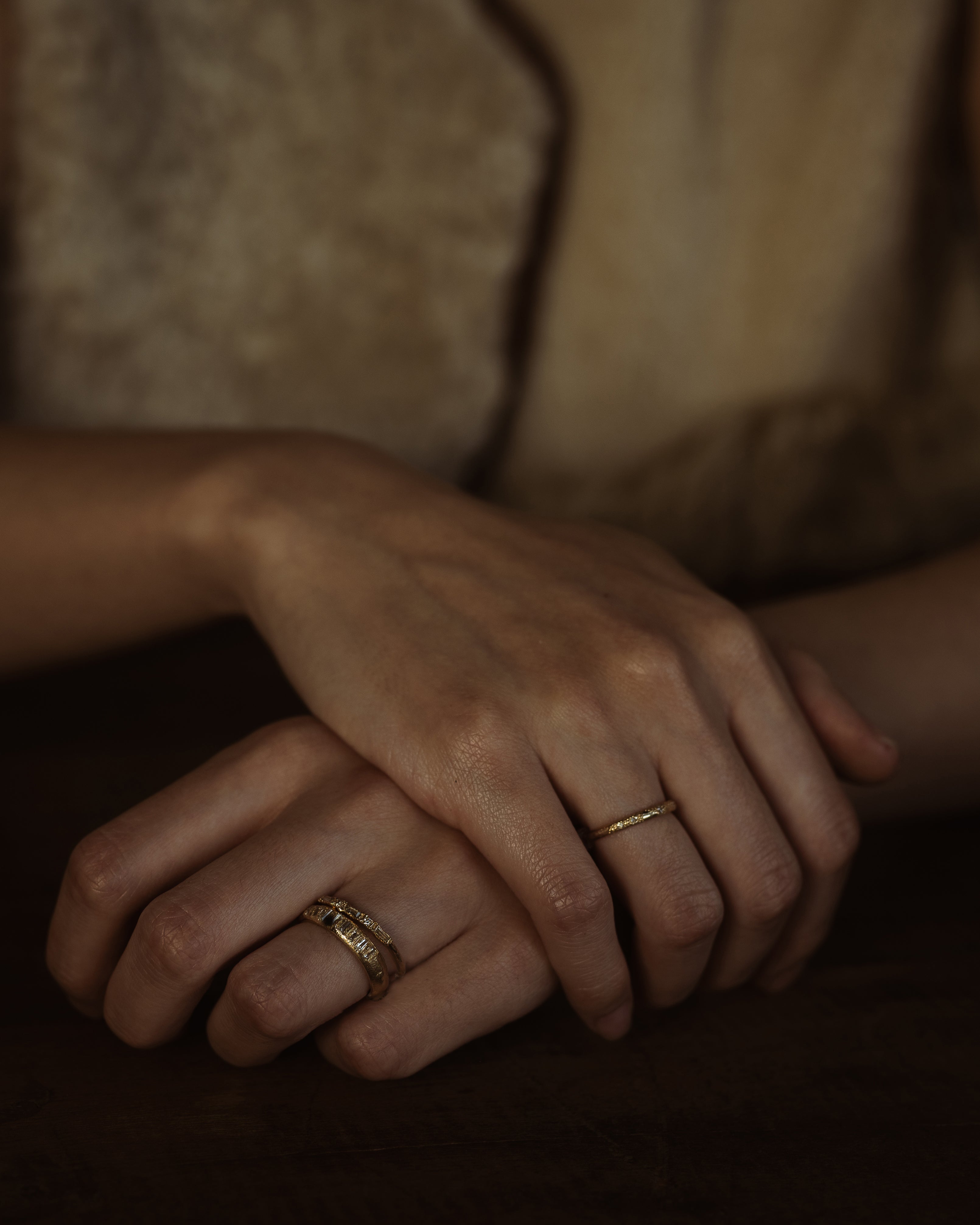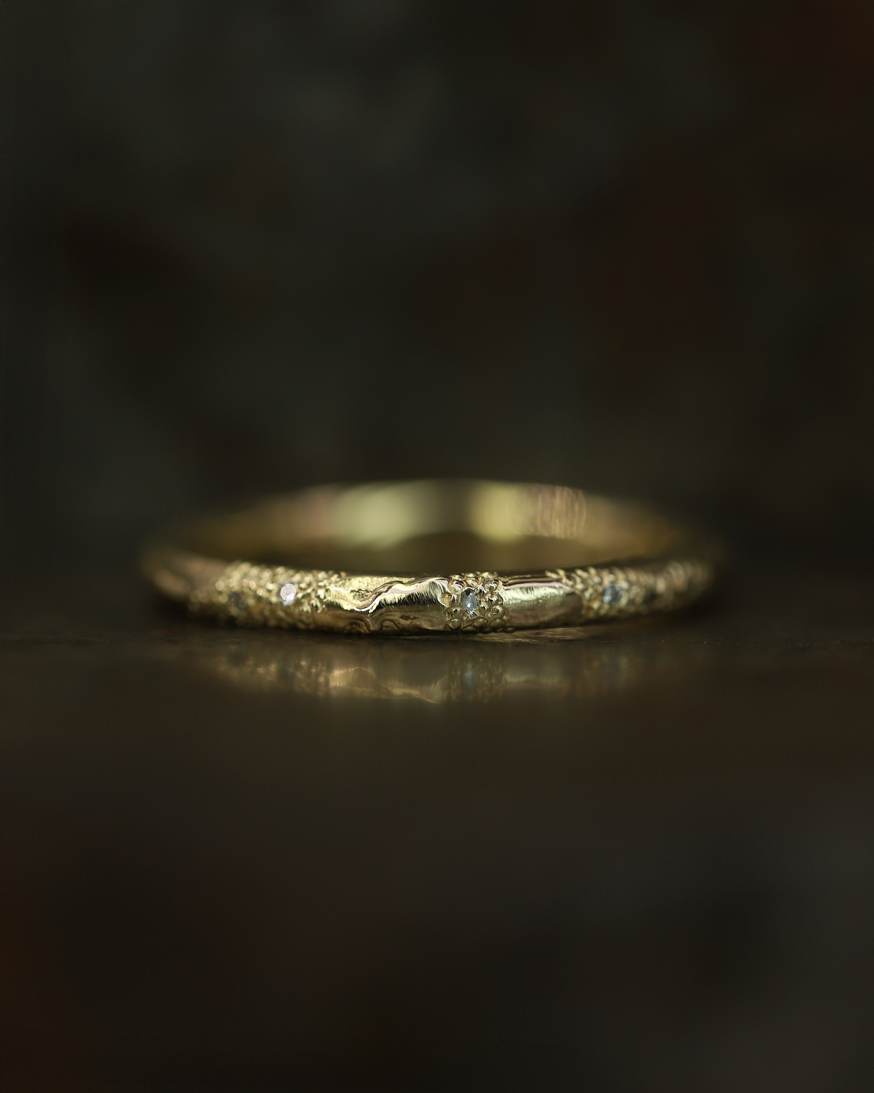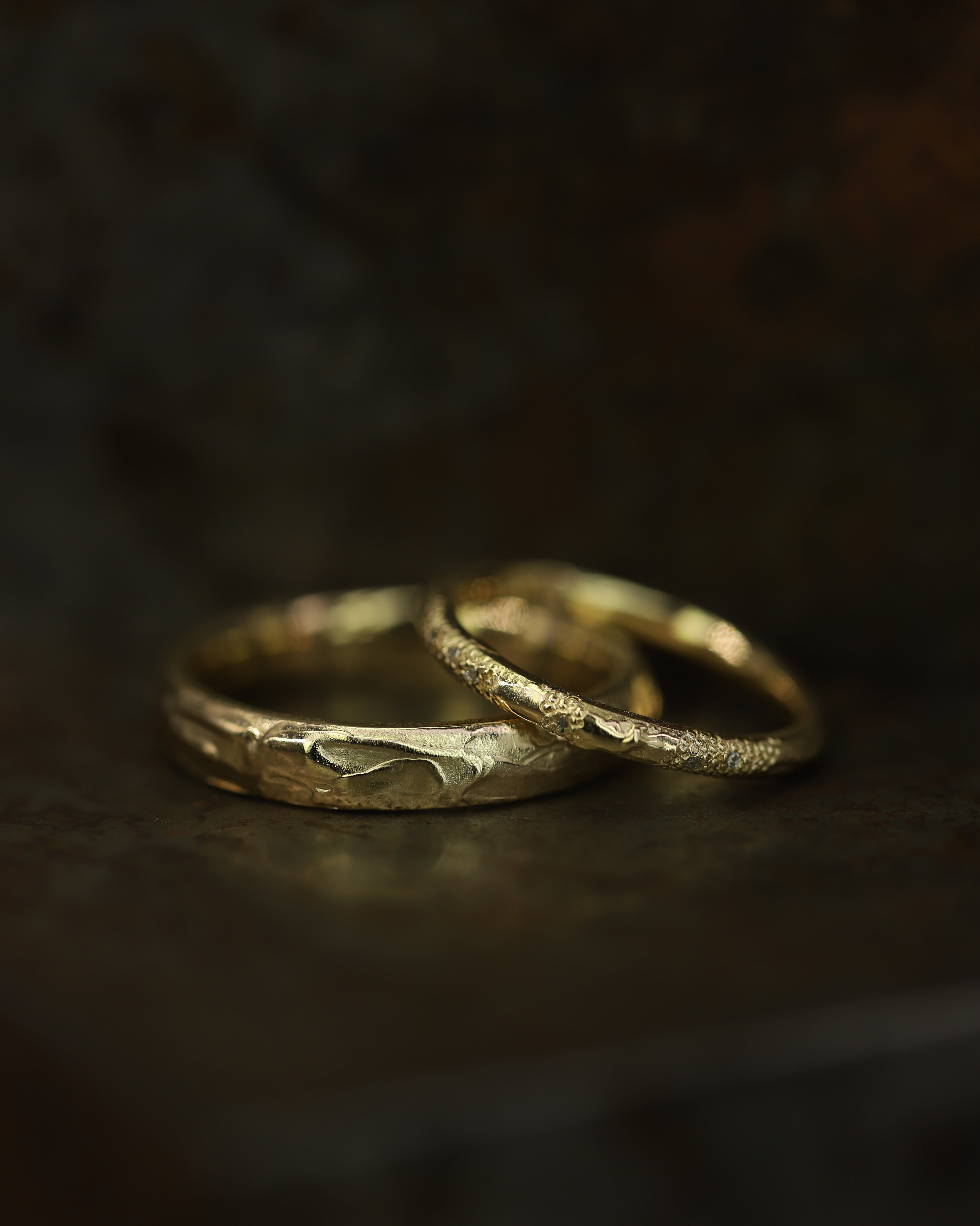 These pieces are made for couples looking for something less conventional, whether it’s an organic engagement ring, a distinctive eternity band, or a textured wedding ring. With a colour palette drawn from the Scottish landscape, created to reflect the natural tones of sunsets, and shifting autumn skies; warm, earthy, and quietly dramatic.