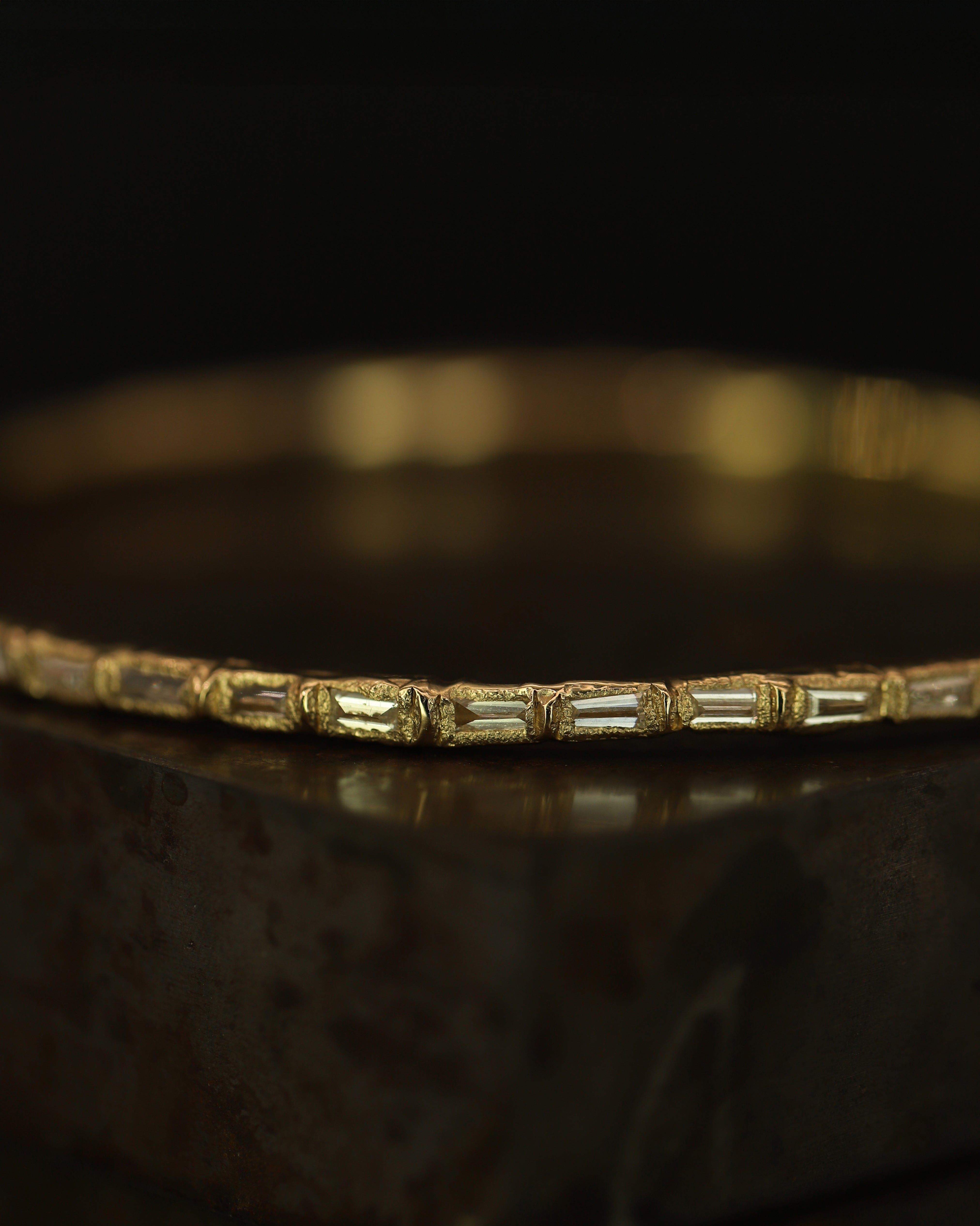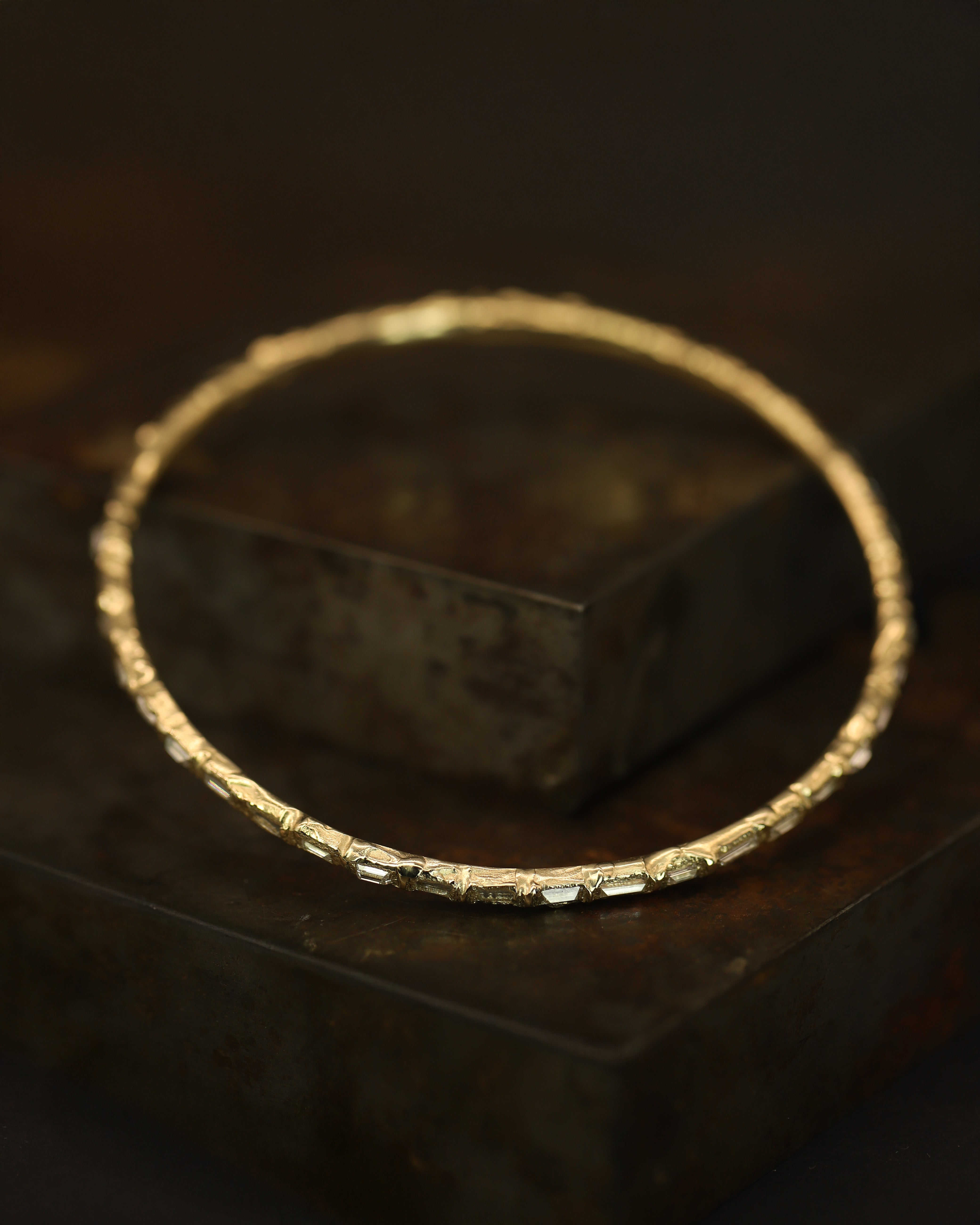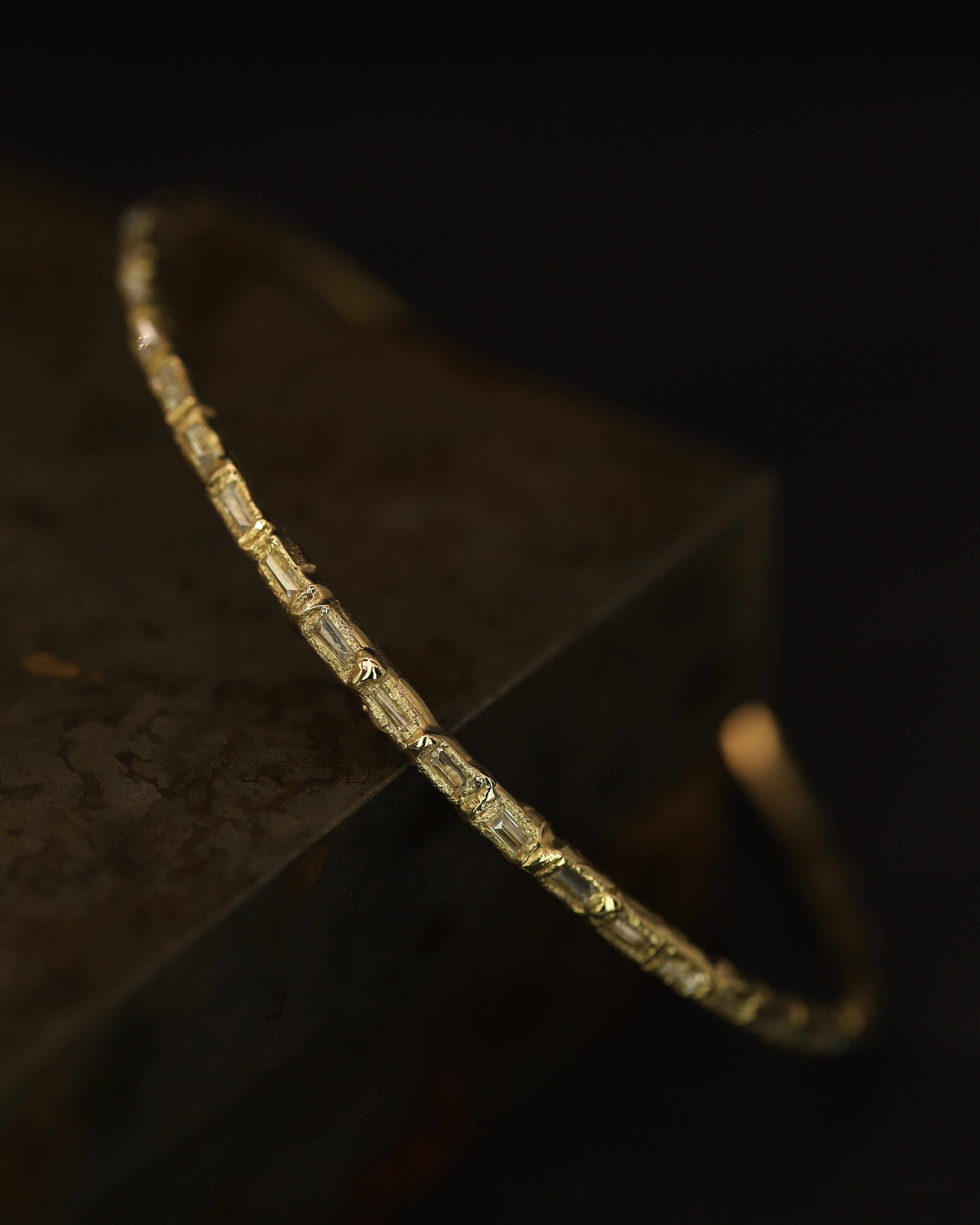 Reverse set icy white baguette diamonds, totalling 4ct, are organically set in molten yellow gold. An elegant piece designed to sit effortlessly on the wrist; an alternative take on a traditional diamond bangle.