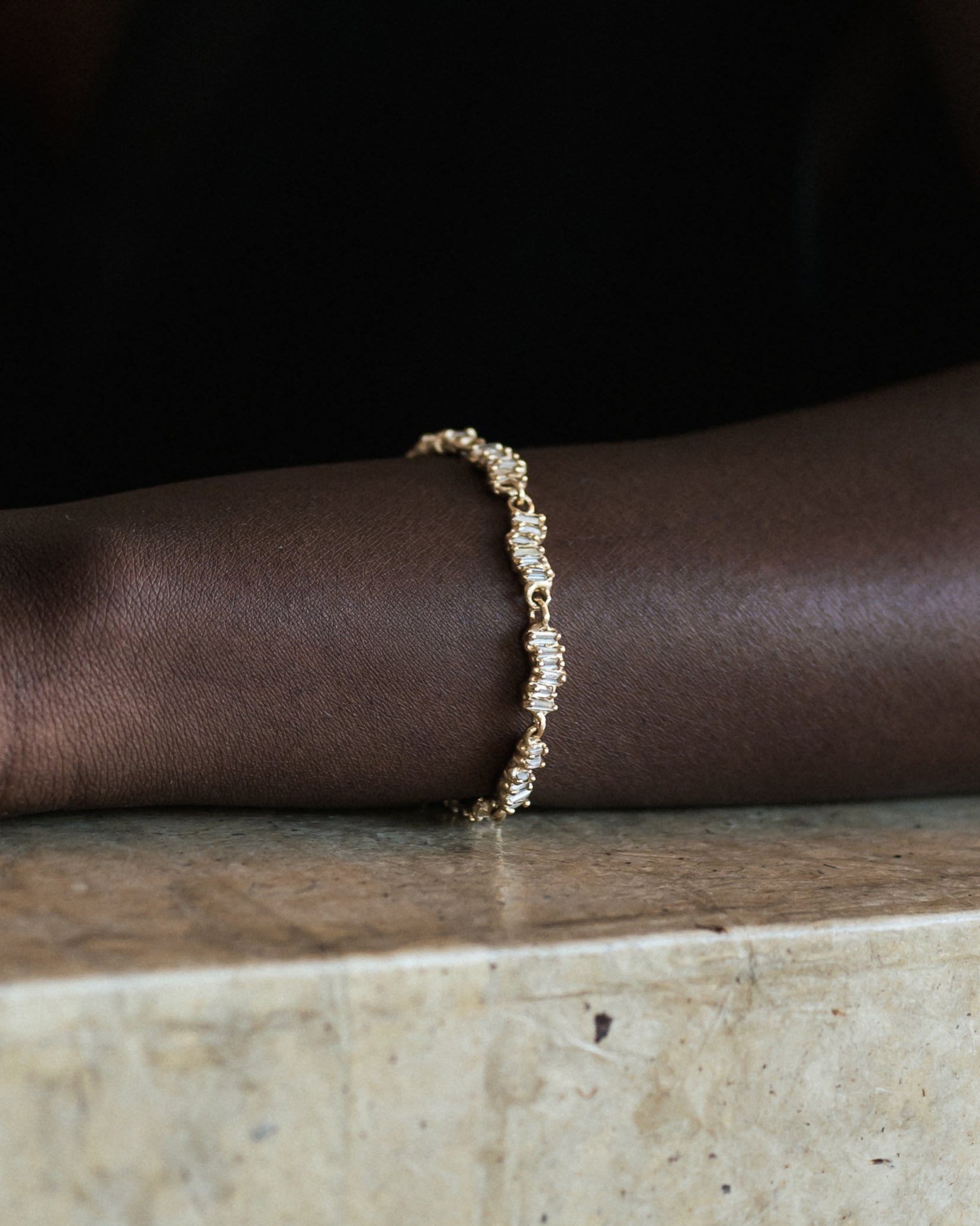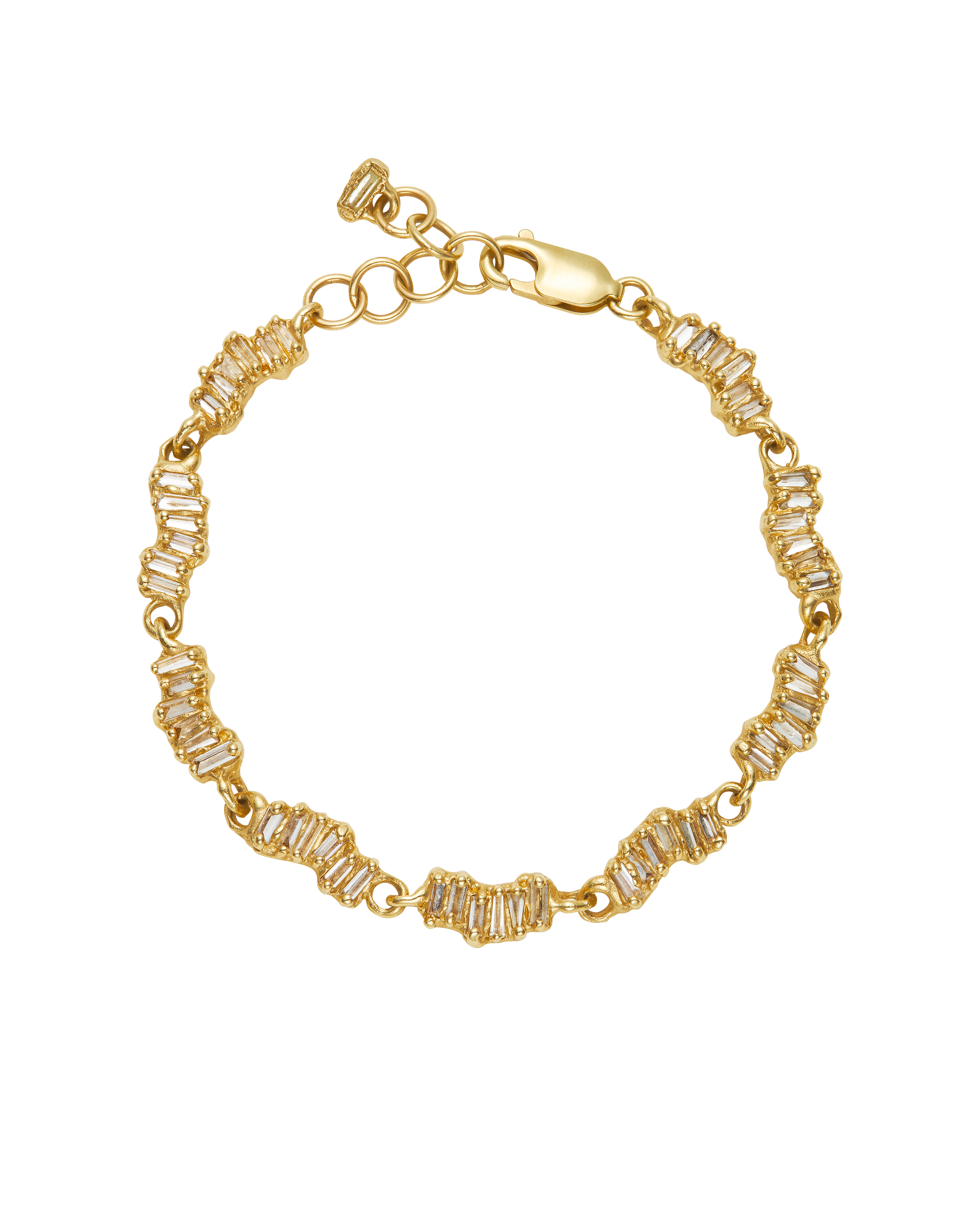 The Armach Diamond Scatter Bracelet I is the alternative take on the traditional diamond bracelet; 66 white reverse set baguette diamonds are organically set in molten yellow gold. The sparkle of the diamonds set in softly textured gold contrast with the highly polished smooth underside. An elegant piece that hangs effortlessly from the wrist; the perfect statement bracelet.