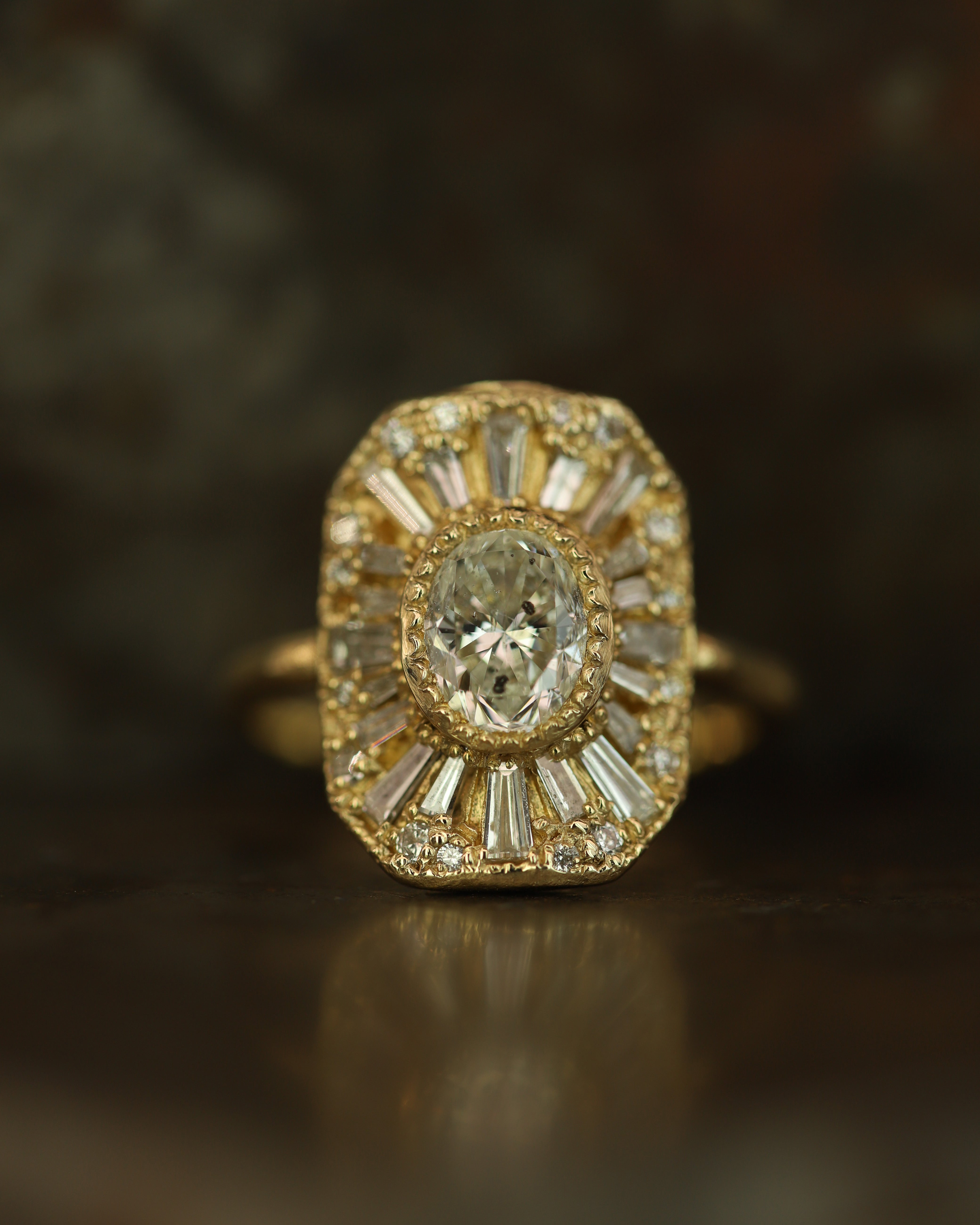 - Materials: 14 carat yellow gold, set with a single oval soft white diamond, measuring 7mm x 5mm (1.3ct), surrounded by mixed cut diamonds (0.75ct).