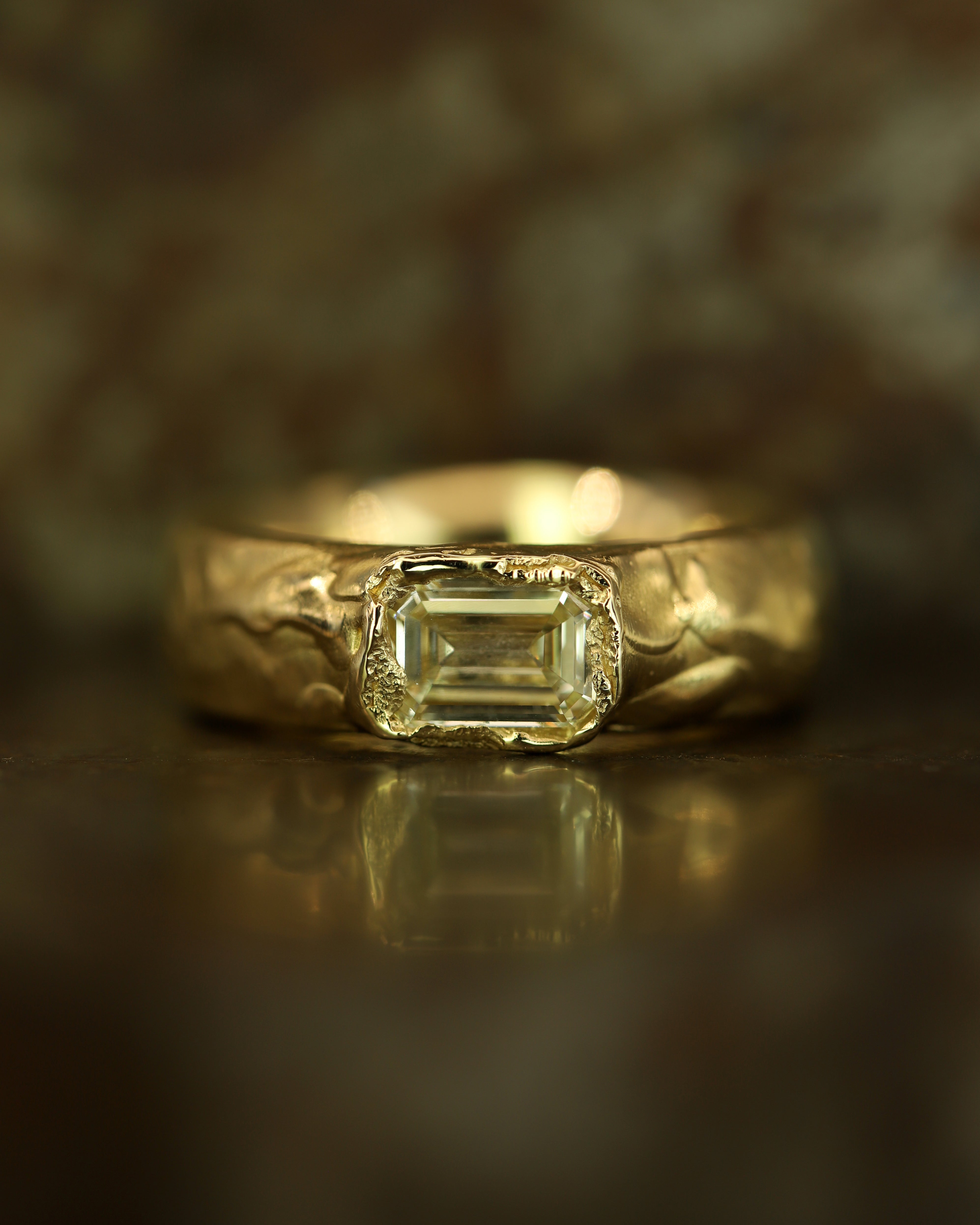 The Armach 1.2ct Lemon Diamond Wide Ring holds a soft lemon diamond, set in textured gold. Inspired by ancient Scottish ring forms. The wide molten band is designed to feel weighty, yet effortlessly comfortable.