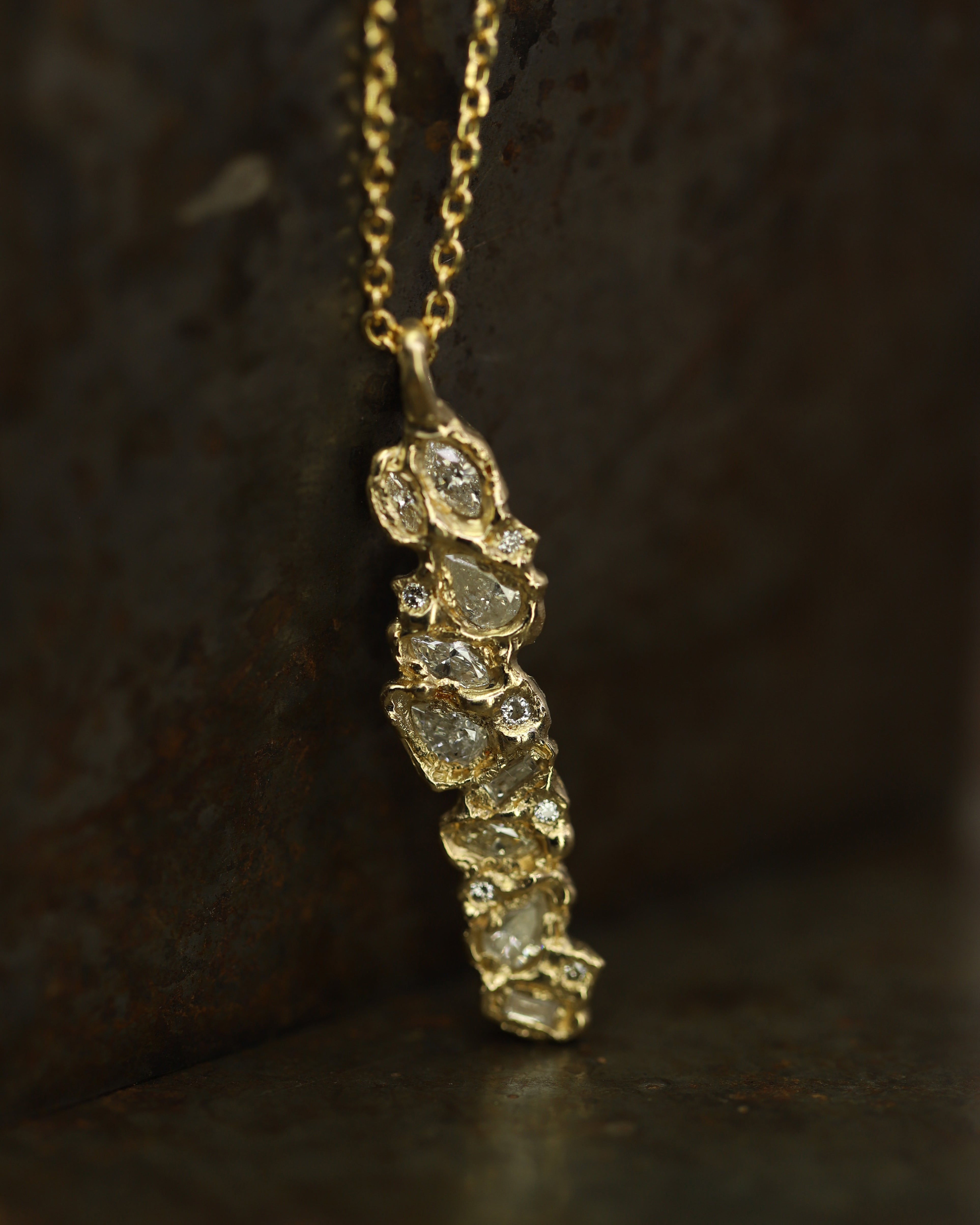 These stones are paired with icy white diamonds, scattered like flecks of treasure in textured, molten gold, to create jewellery that feels tactile and storied, combining Ellis’ erosive aesthetic with a refined sense of discovery.