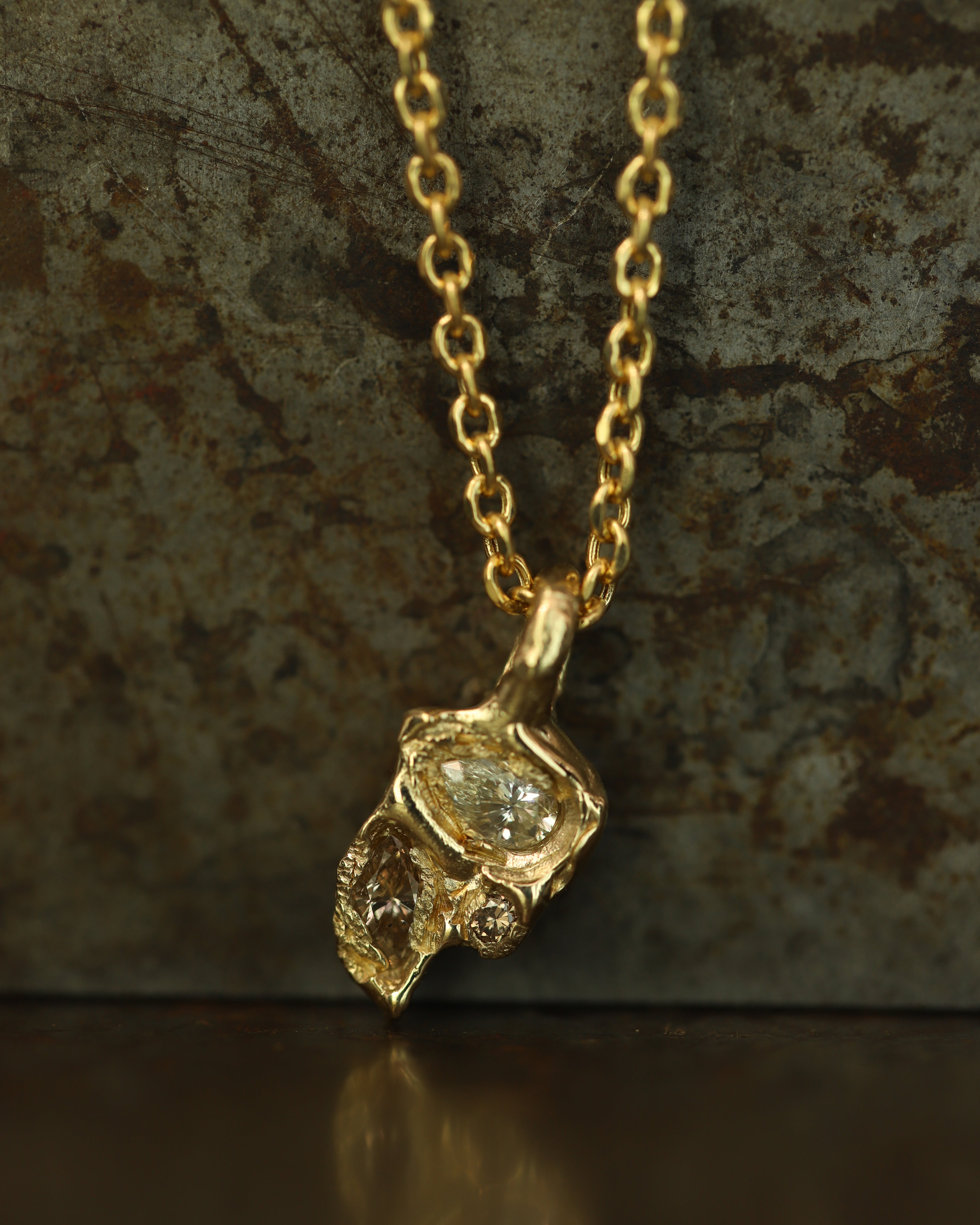 These stones are paired with icy white diamonds, scattered like flecks of treasure in textured, molten gold, to create jewellery that feels tactile and storied, combining Ellis’ erosive aesthetic with a refined sense of discovery.