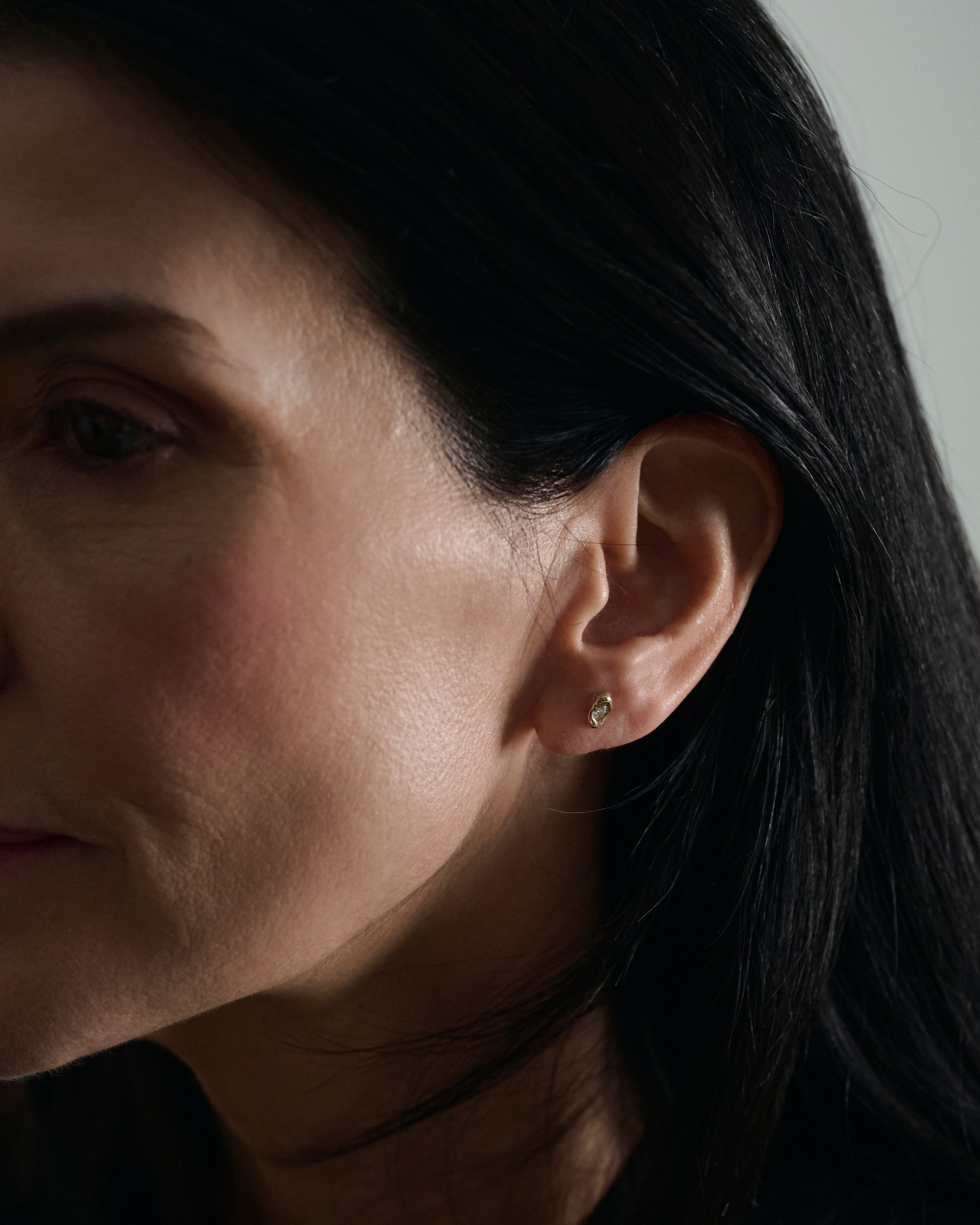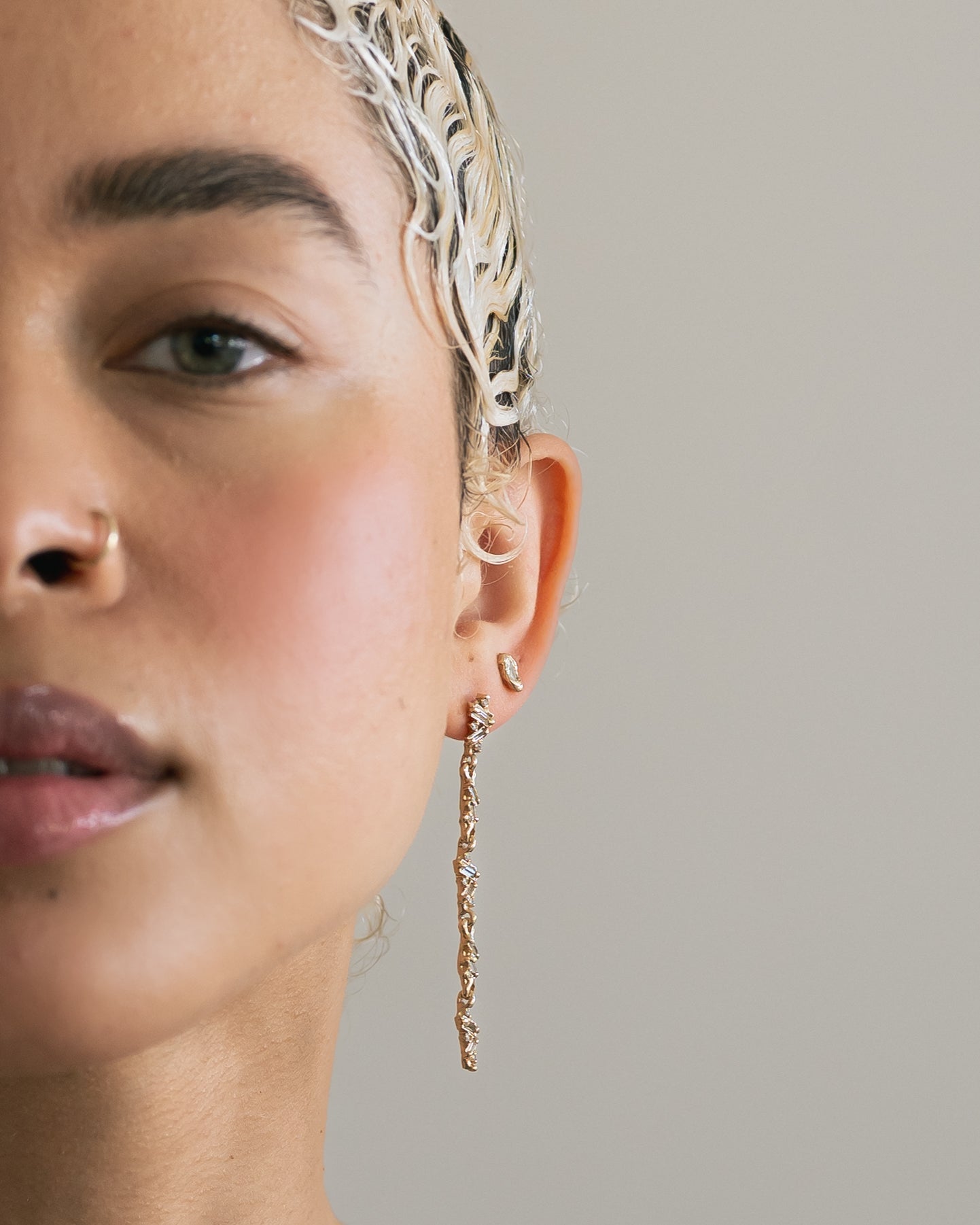 These stones are paired with icy white diamonds, scattered like flecks of treasure in textured, molten gold, to create jewellery that feels tactile and storied, combining Ellis’ erosive aesthetic with a refined sense of discovery.