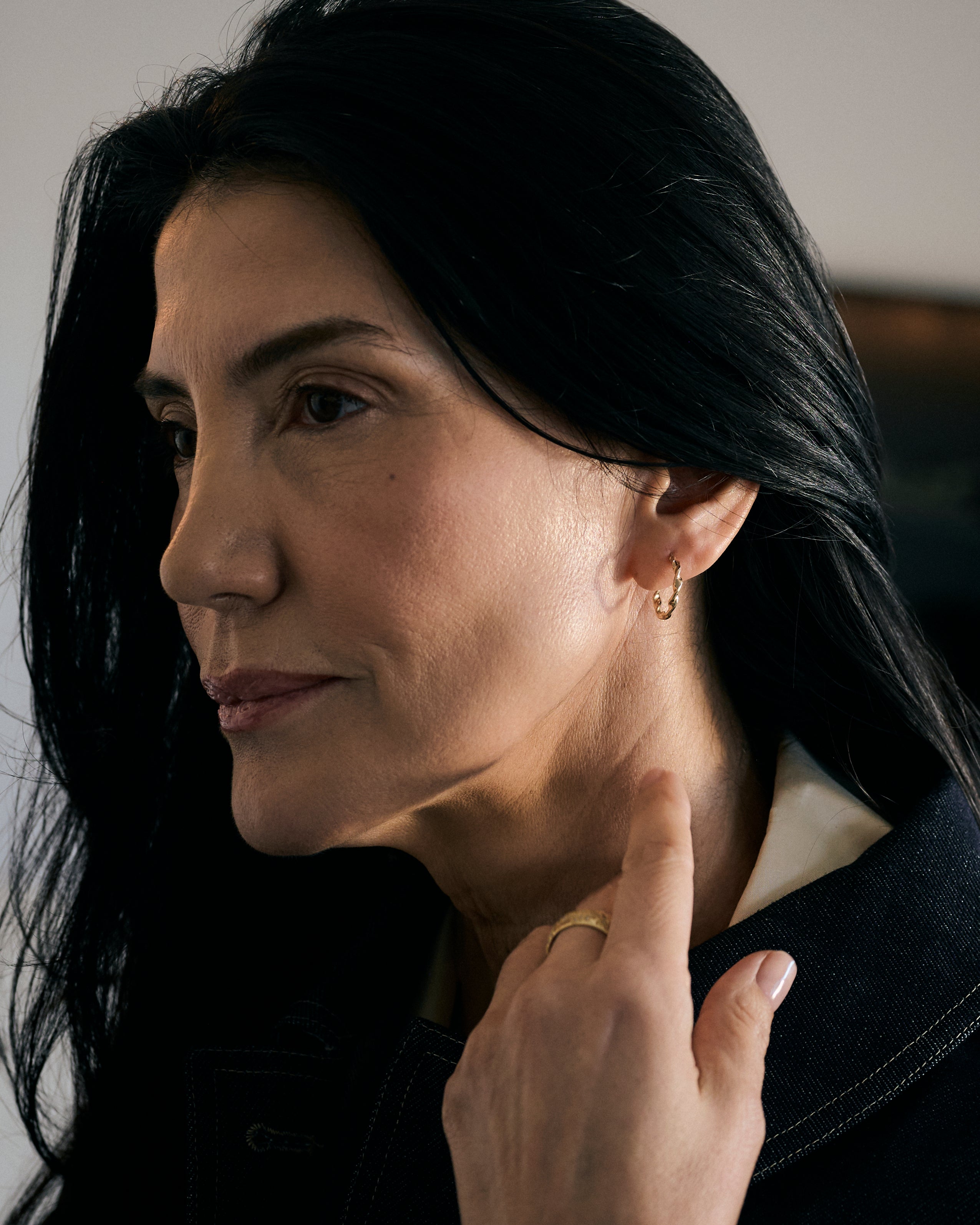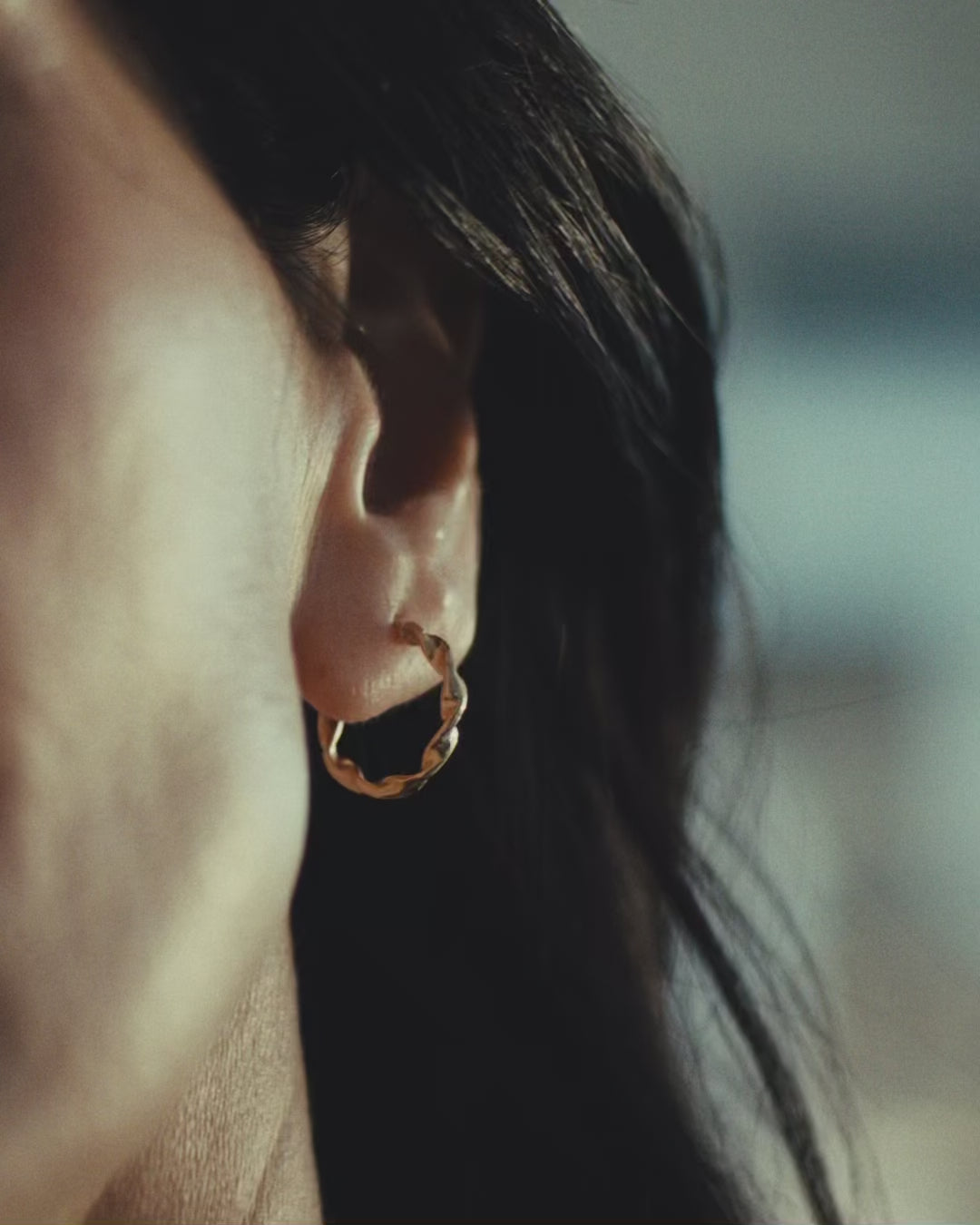 The subtle intricacies of the earrings catch the light; the perfect everyday hoops.