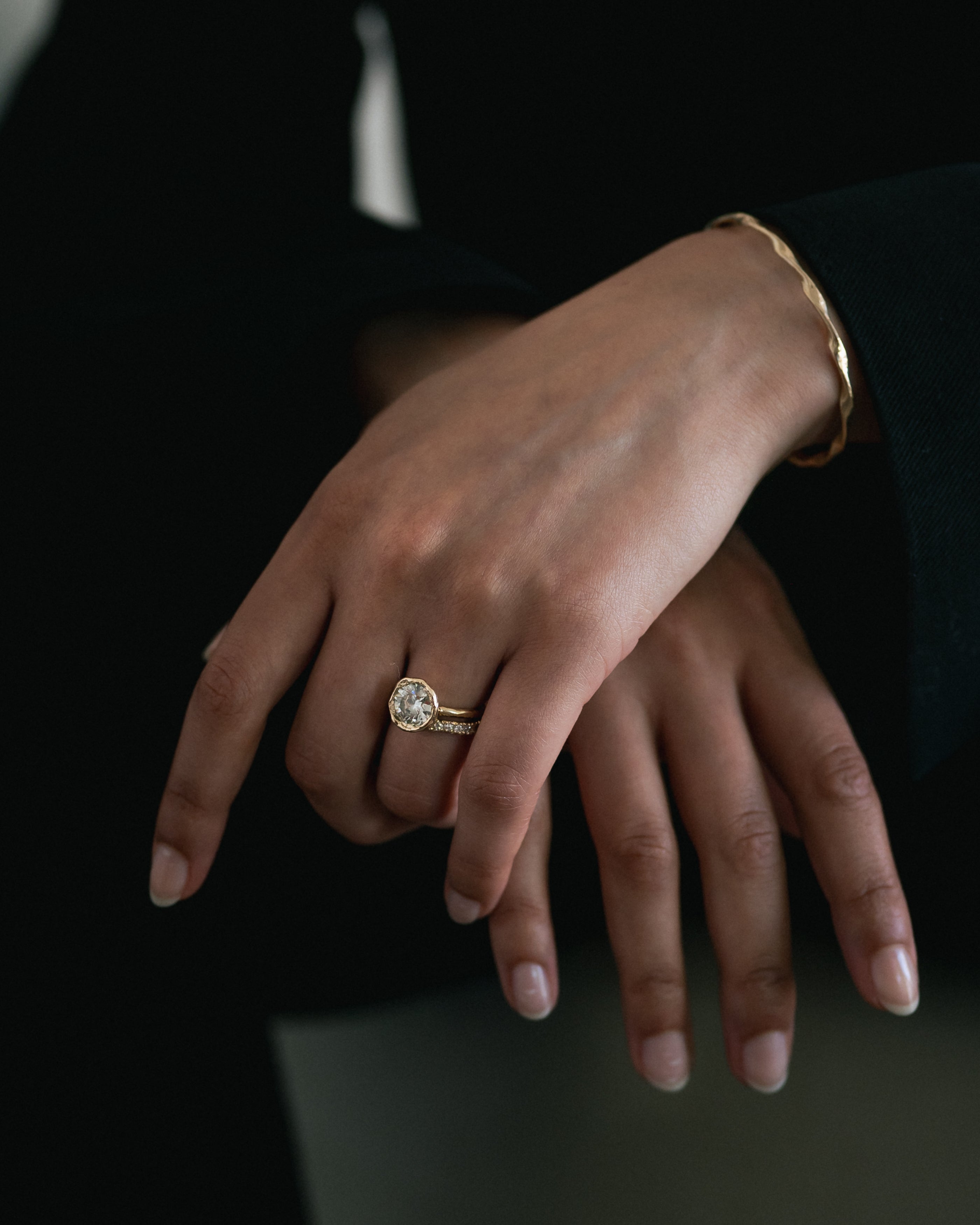 Origins is inspired by Neolithic tools found in the Scottish landscape - objects created for everyday use, shaped by hand, and built to last. This collection focuses on solid gold designs with textural forms and a quiet sense of strength.