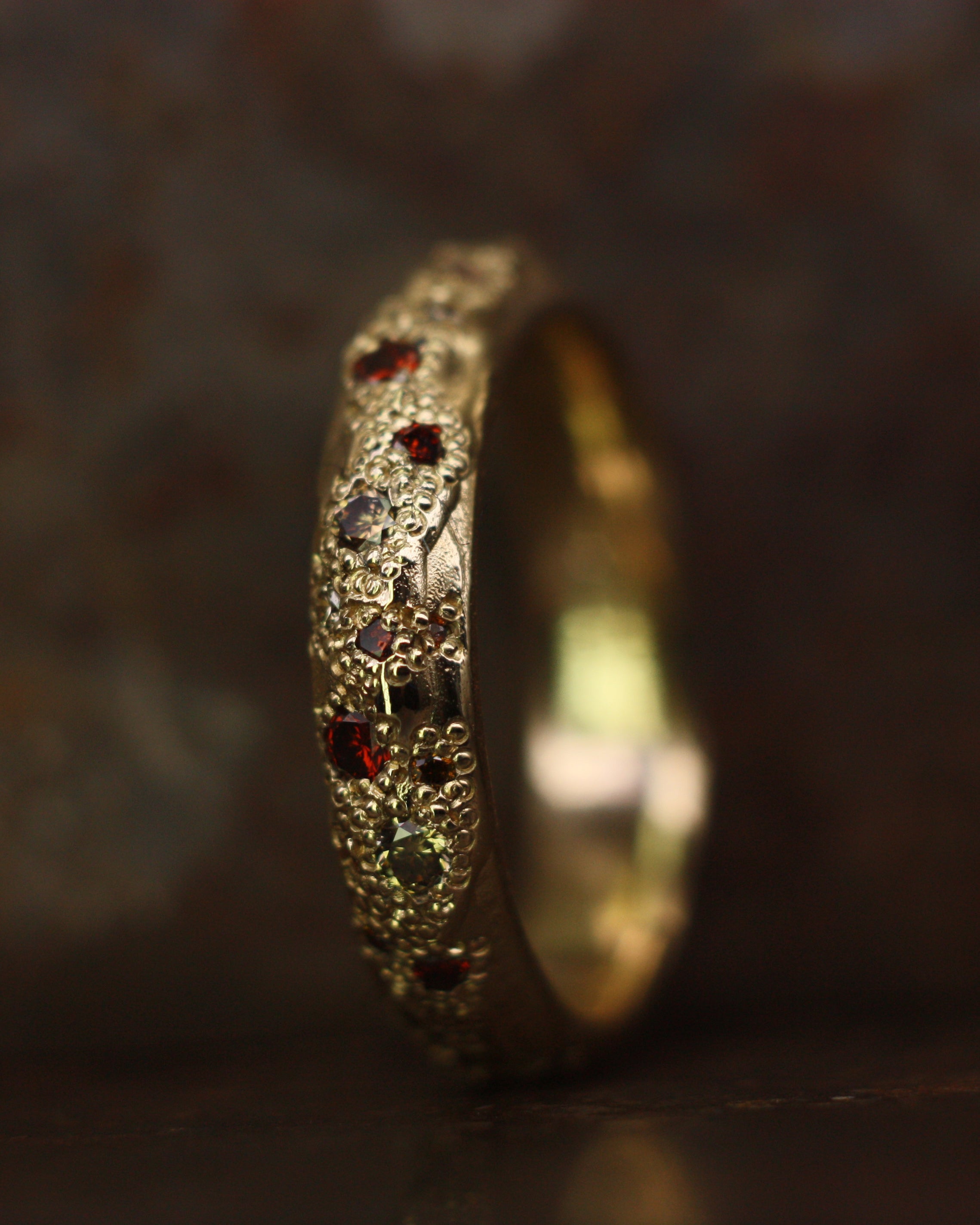 The softly distressed texture of the ring band contrasts with the colours of the diamonds. The diamonds are set into the texture of the ring, as though they have just been discovered, like buried treasure.