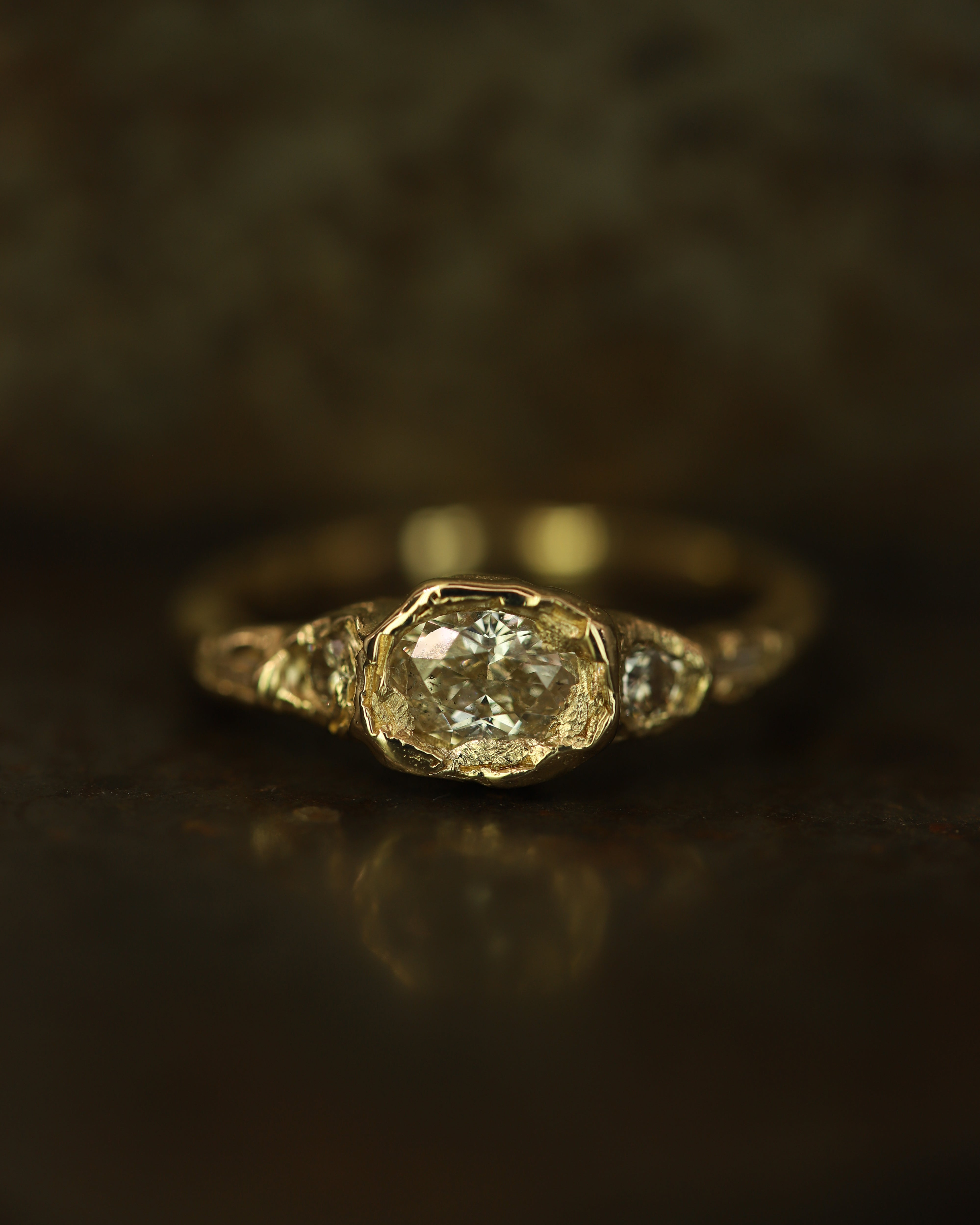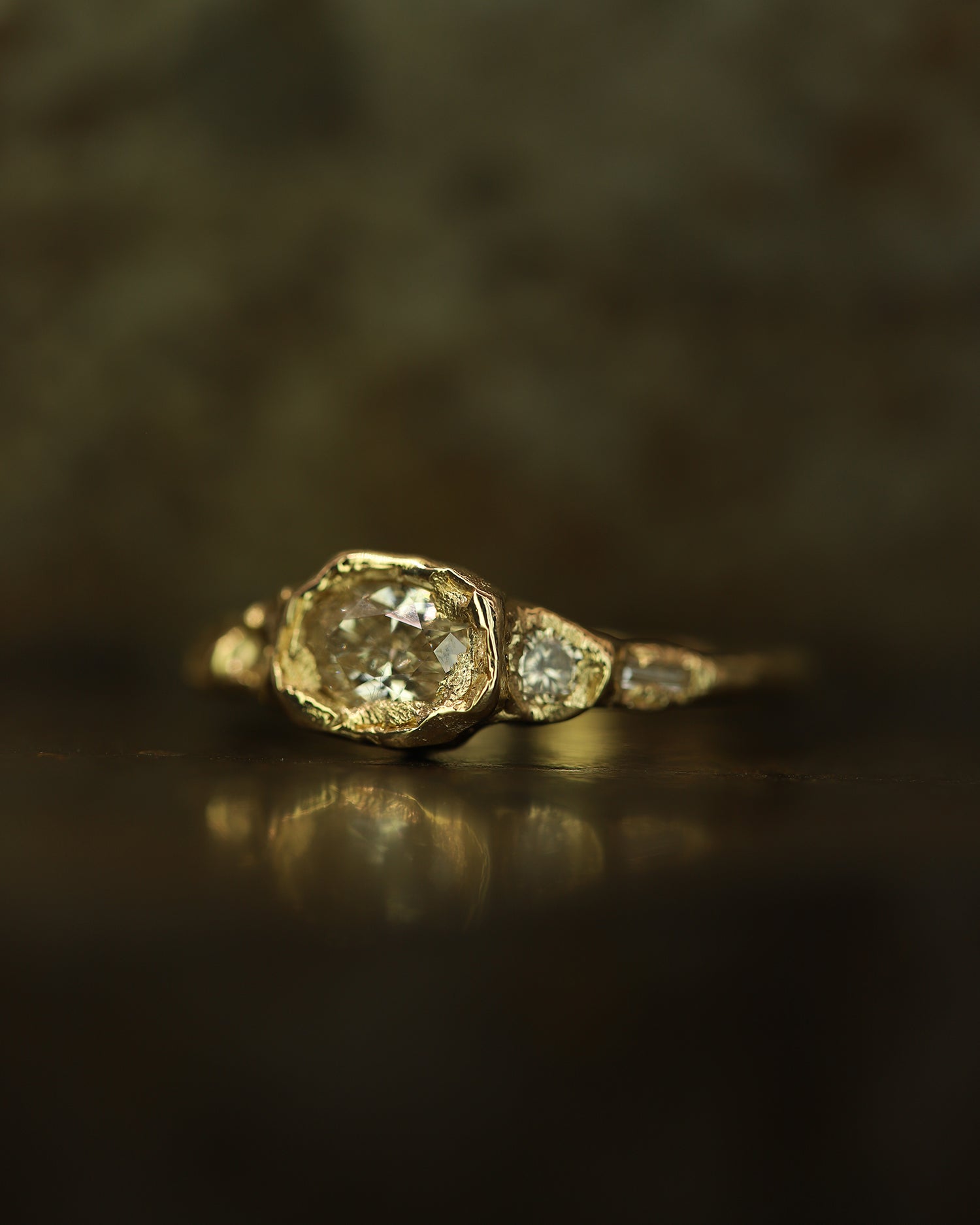 The Armach 1.2ct Oval & Mixed Five Stone Diamond Organic Engagement Ring features a single champagne diamond at its centre surrounded by baguette and round diamonds, set in softly textured gold. Perfect as an alternative engagement ring; worn solo, or stacked with other styles.