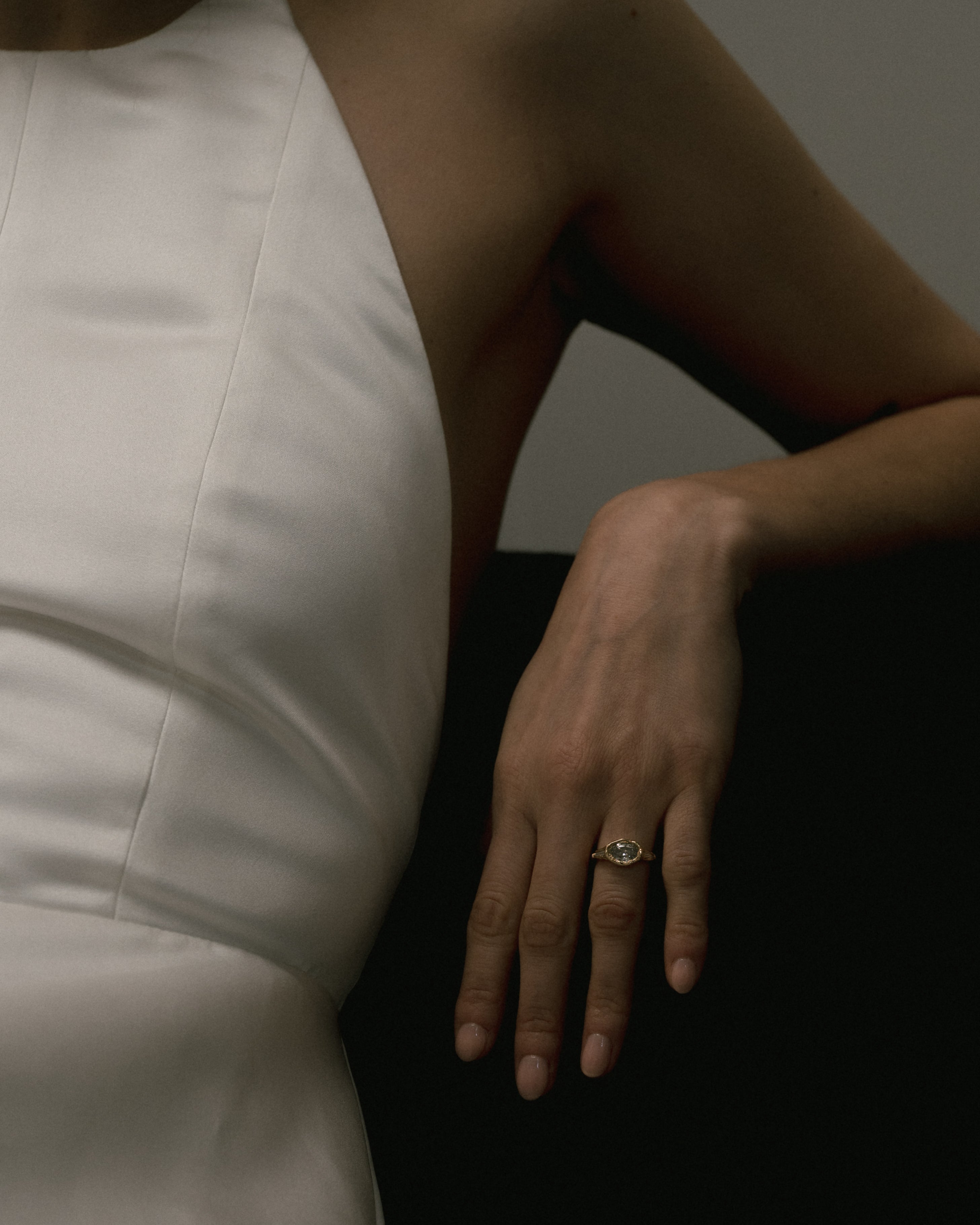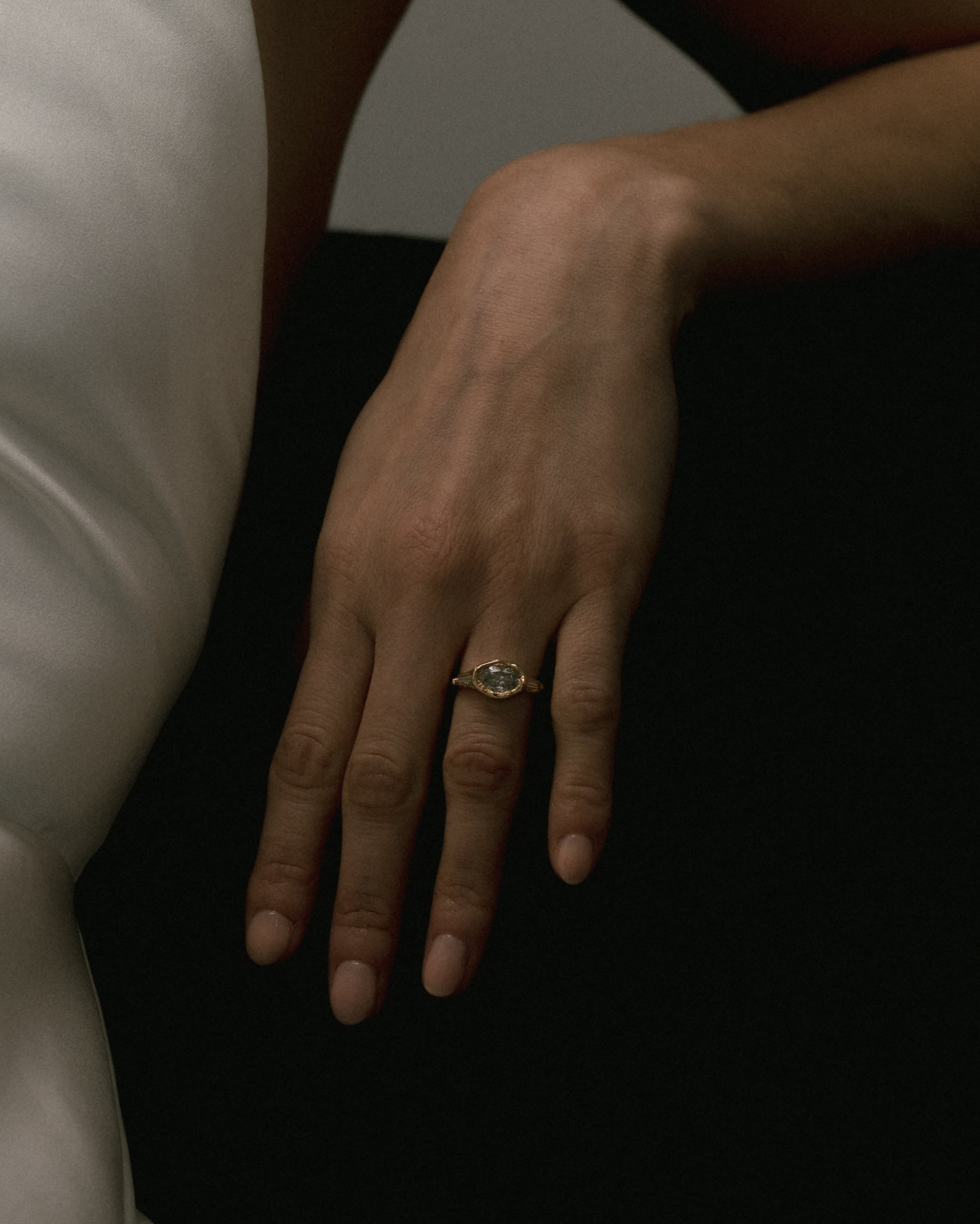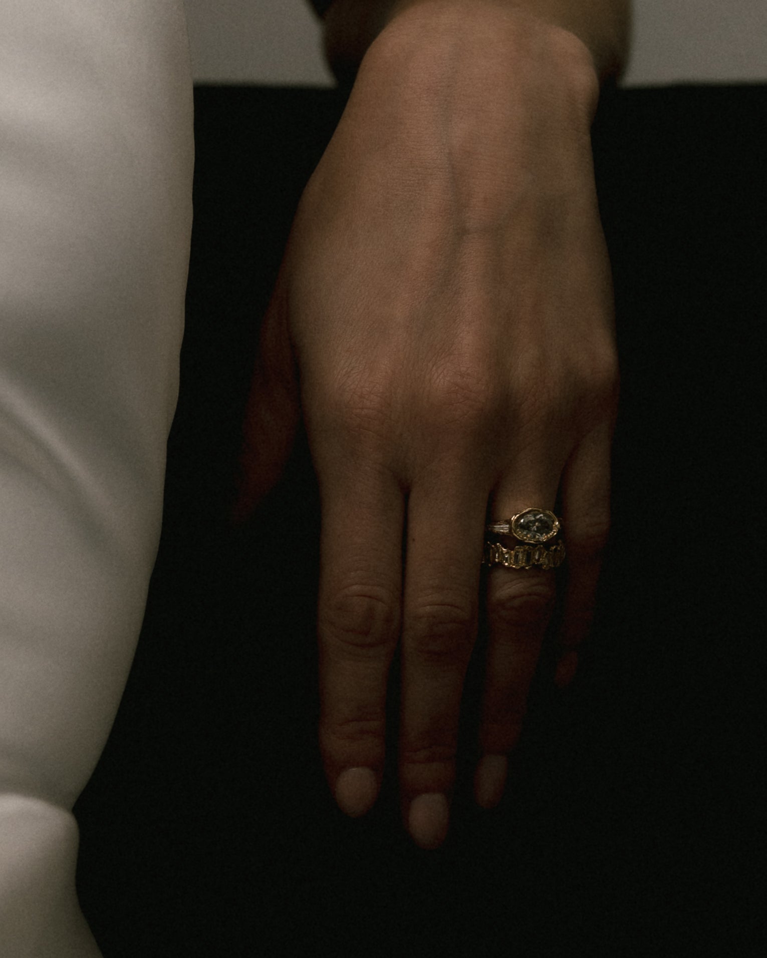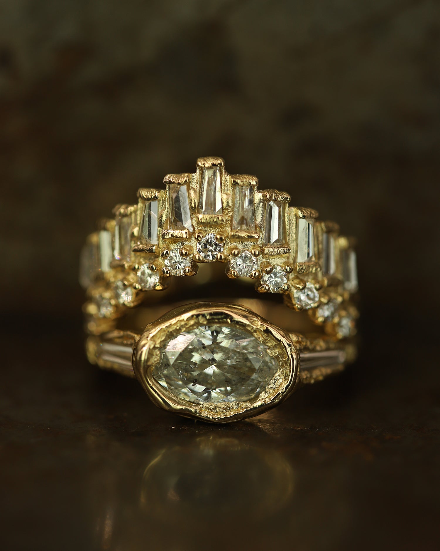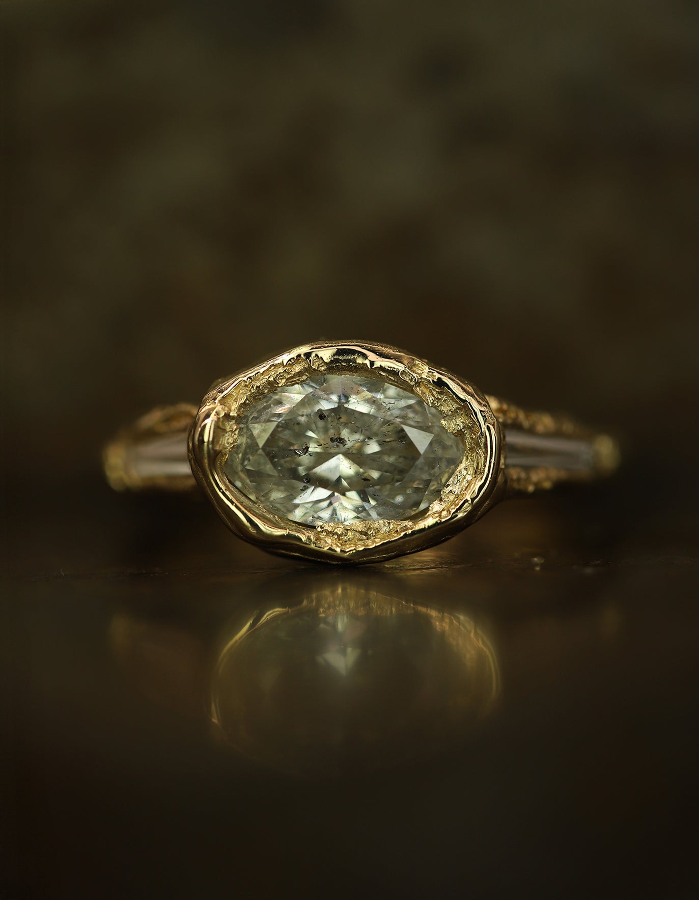 The softly distressed texture of the ring band and setting contrasts with the deep salt & pepper colour of the east-west set diamond and surrounding tapered white baguettes. This would make a stunning alternative engagement ring, or statement ring. Pair with organic wedding bands from the collection.