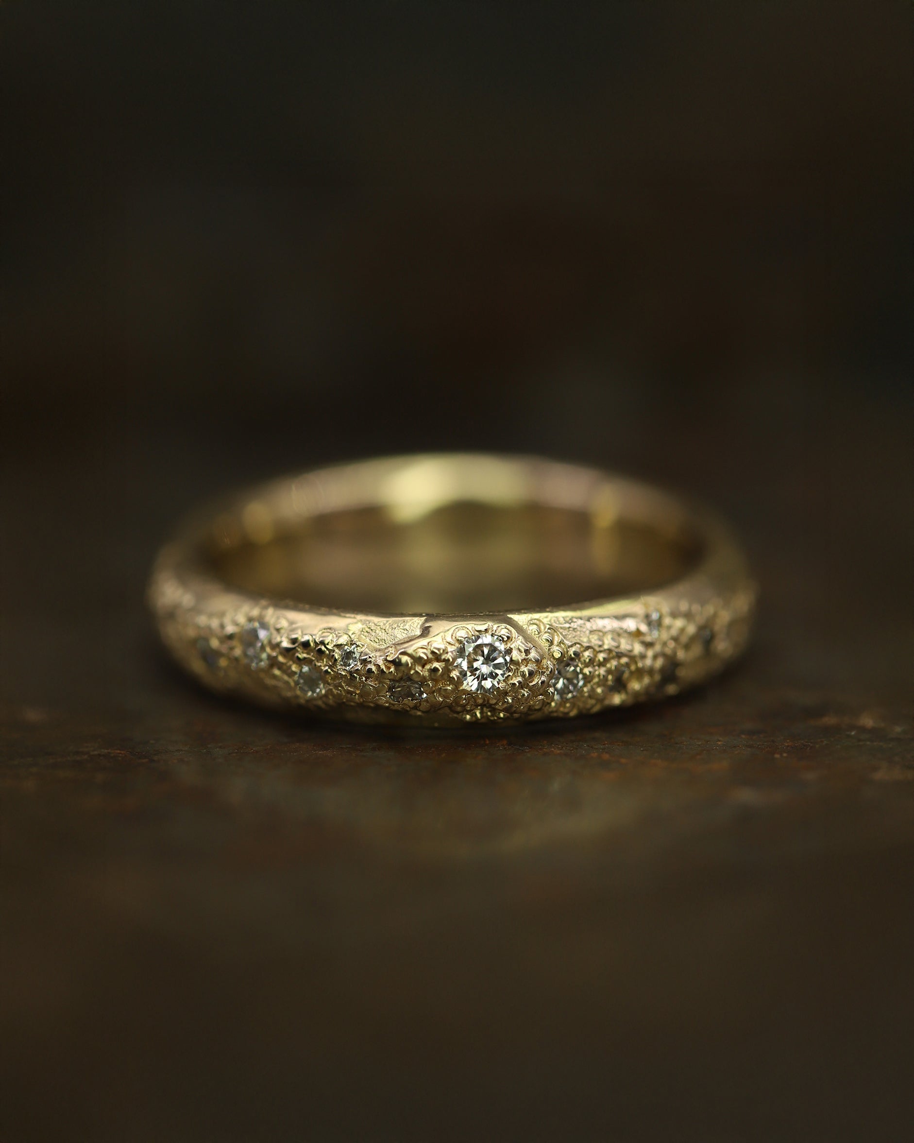 The softly distressed texture of the ring band contrasts with the colours of the diamonds. The diamonds are set into the texture of the ring, as though they have just been discovered, like buried treasure.