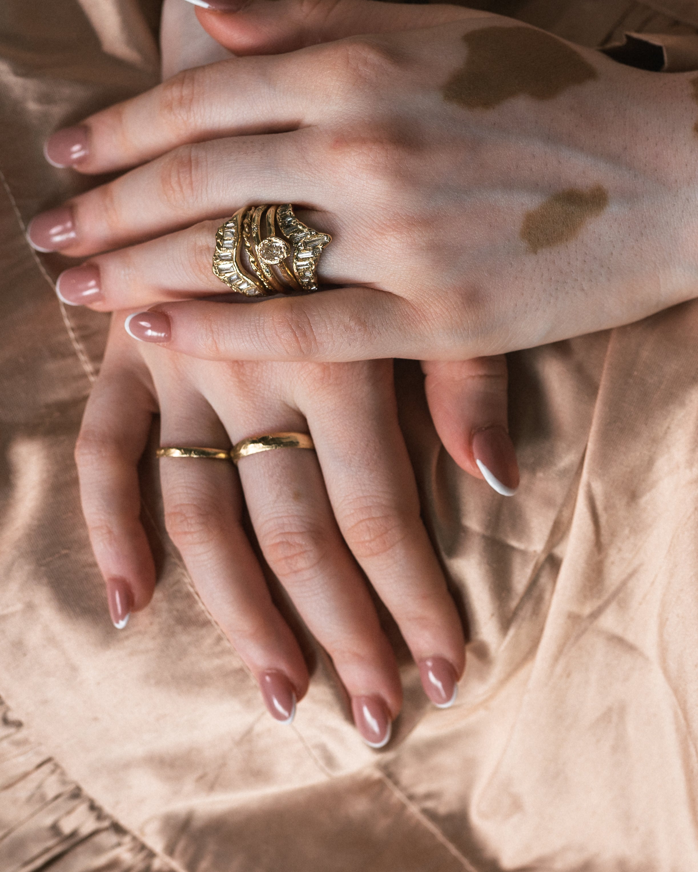 These pieces are made for couples looking for something less conventional, whether it’s an organic engagement ring, a distinctive eternity band, or a textured wedding ring. With a colour palette drawn from the Scottish landscape, created to reflect the natural tones of sunsets, and shifting autumn skies; warm, earthy, and quietly dramatic.