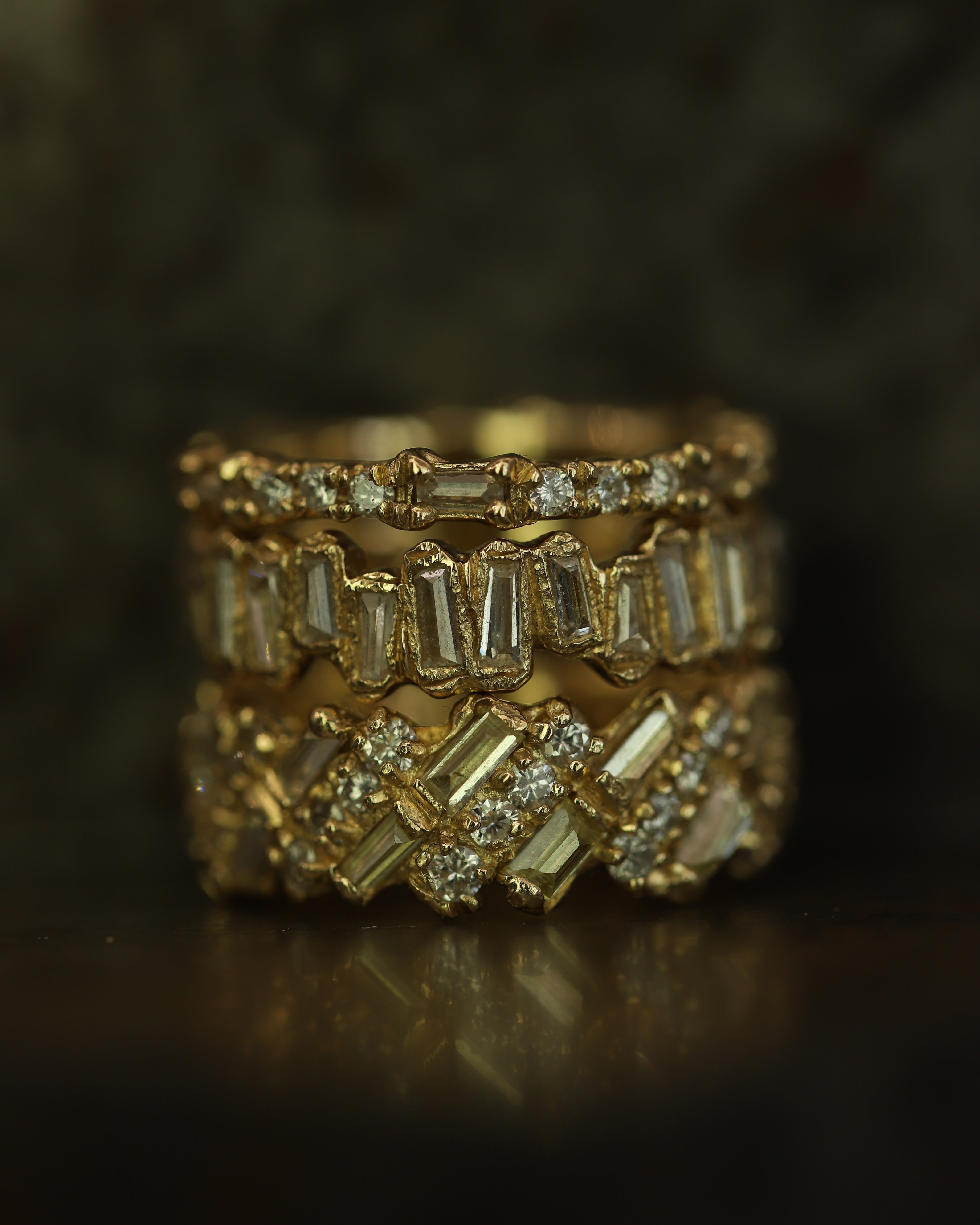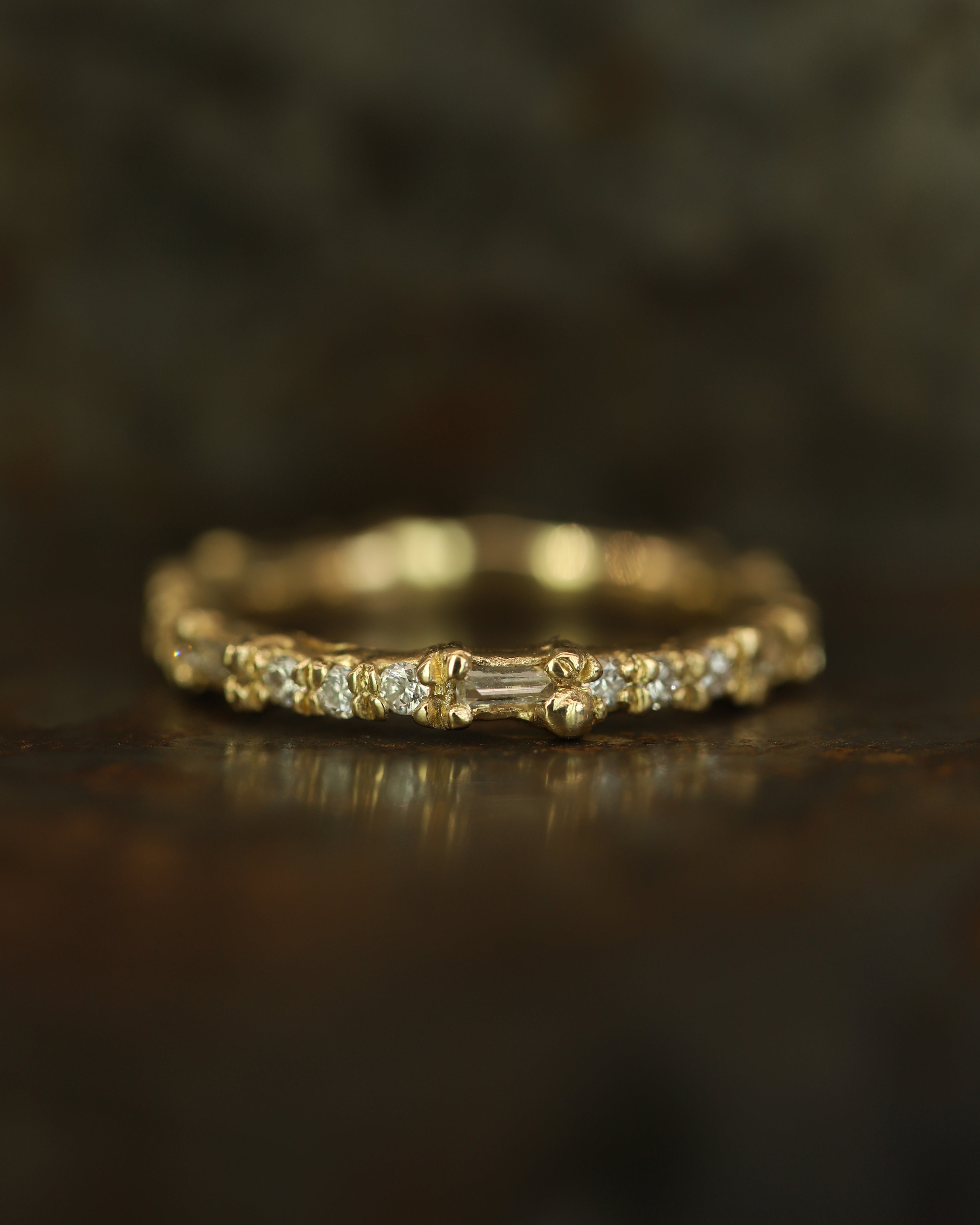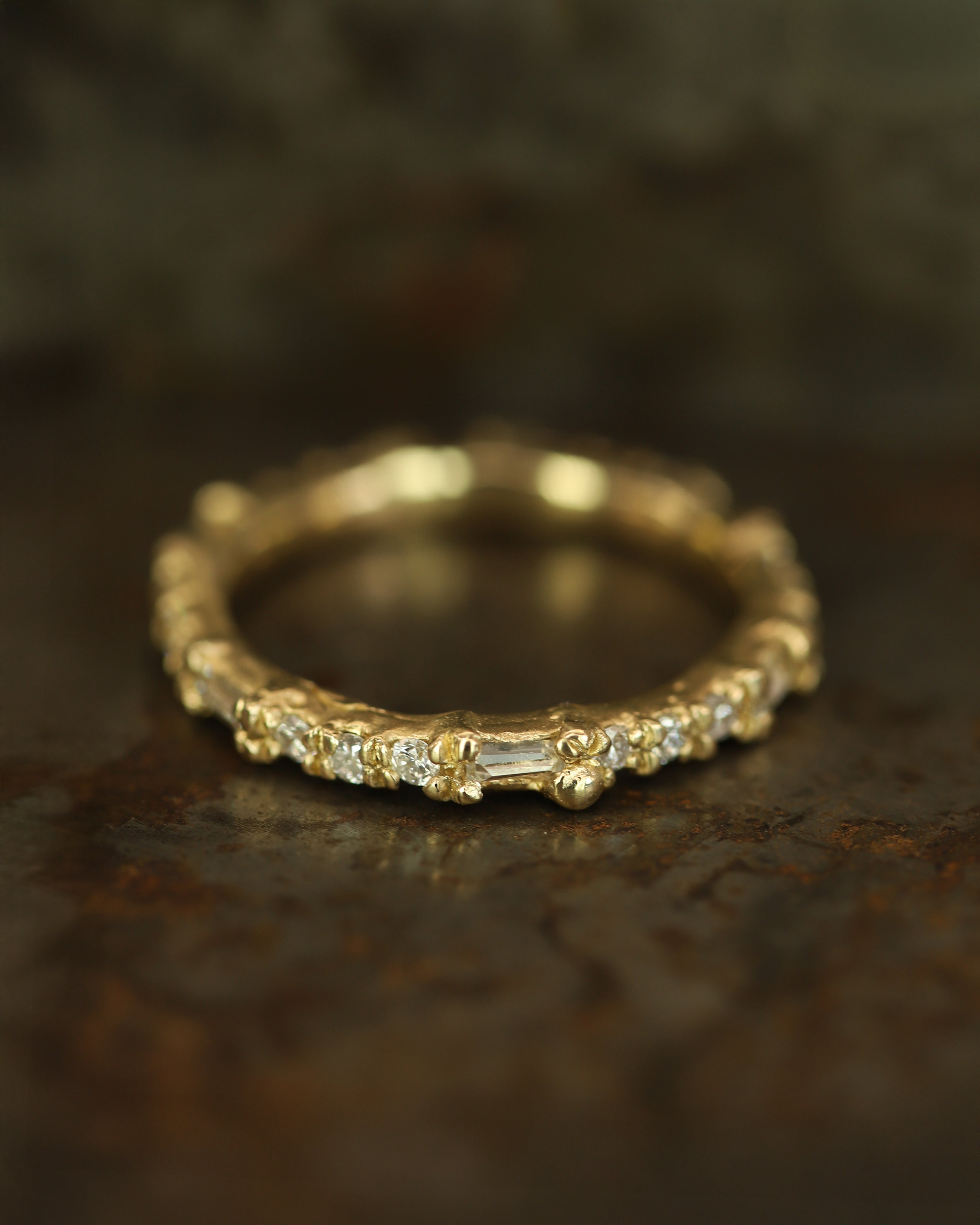 The Armach Diamond Eternity Ring V is inspired by the medieval jewellery hoards which have been found across Scotland. Diamonds flow into one another, organically set as though they have just been excavated. Perfect as an alternative wedding ring, eternity ring or everyday ring. Wear solo or stack up with other rings in the collection.
