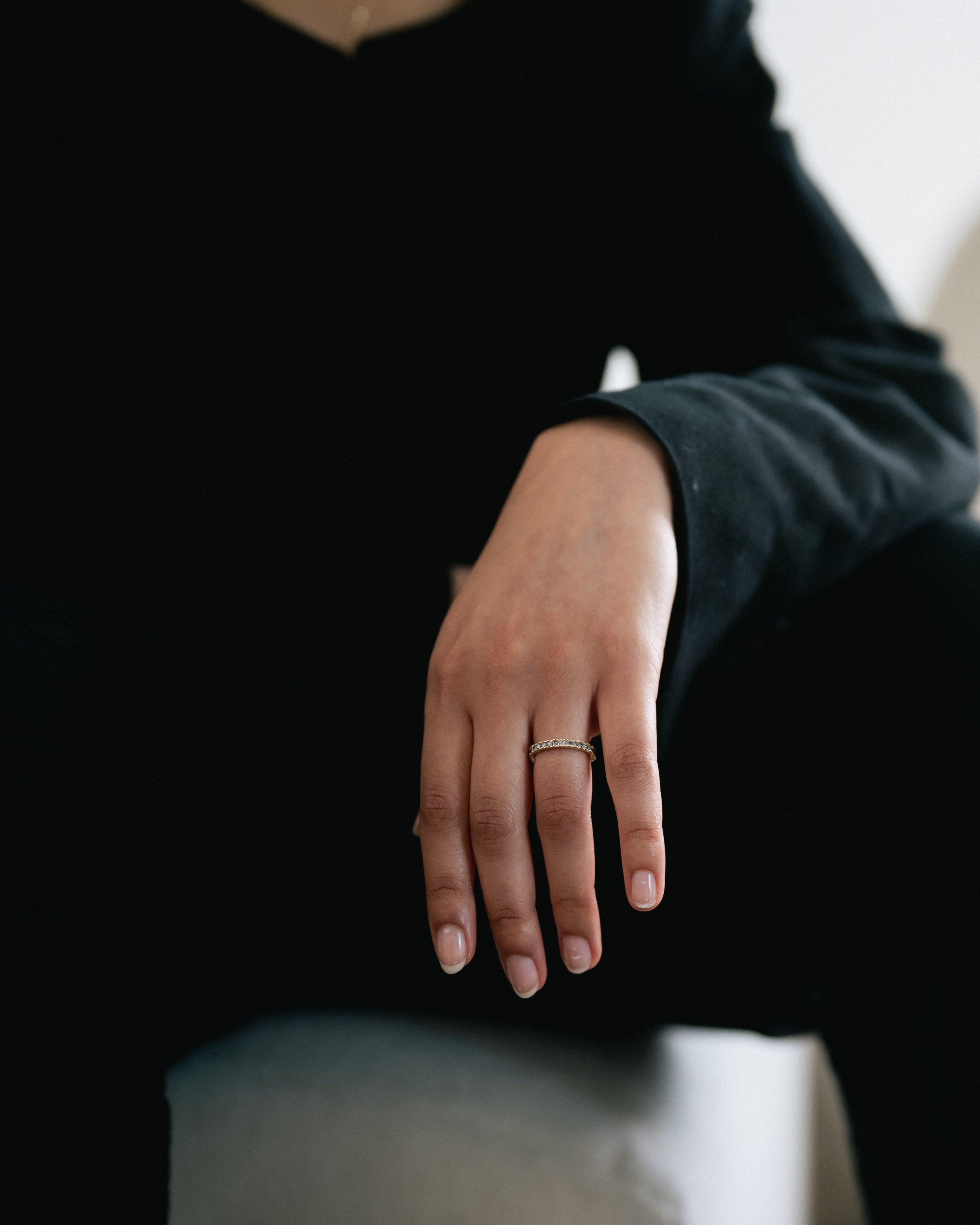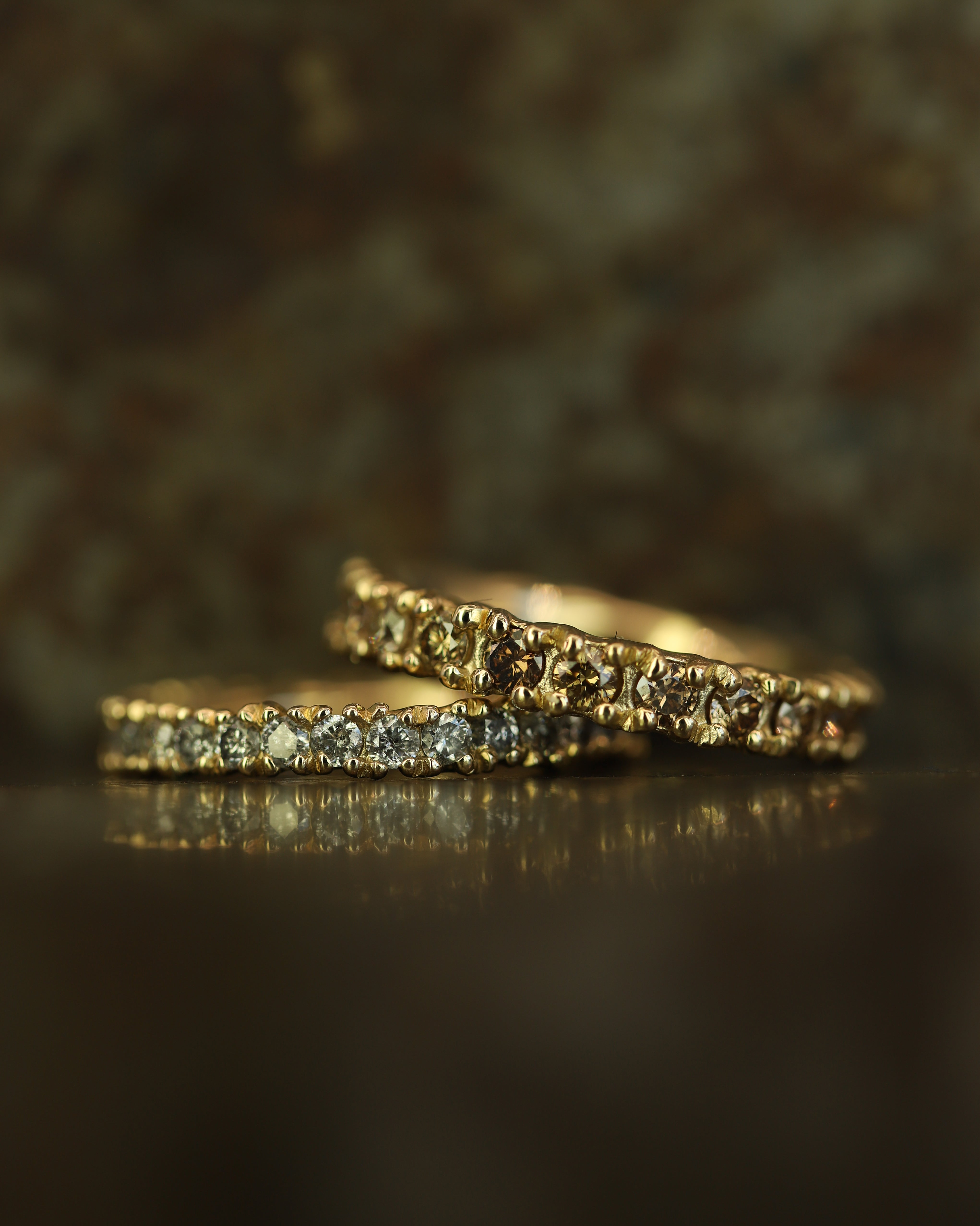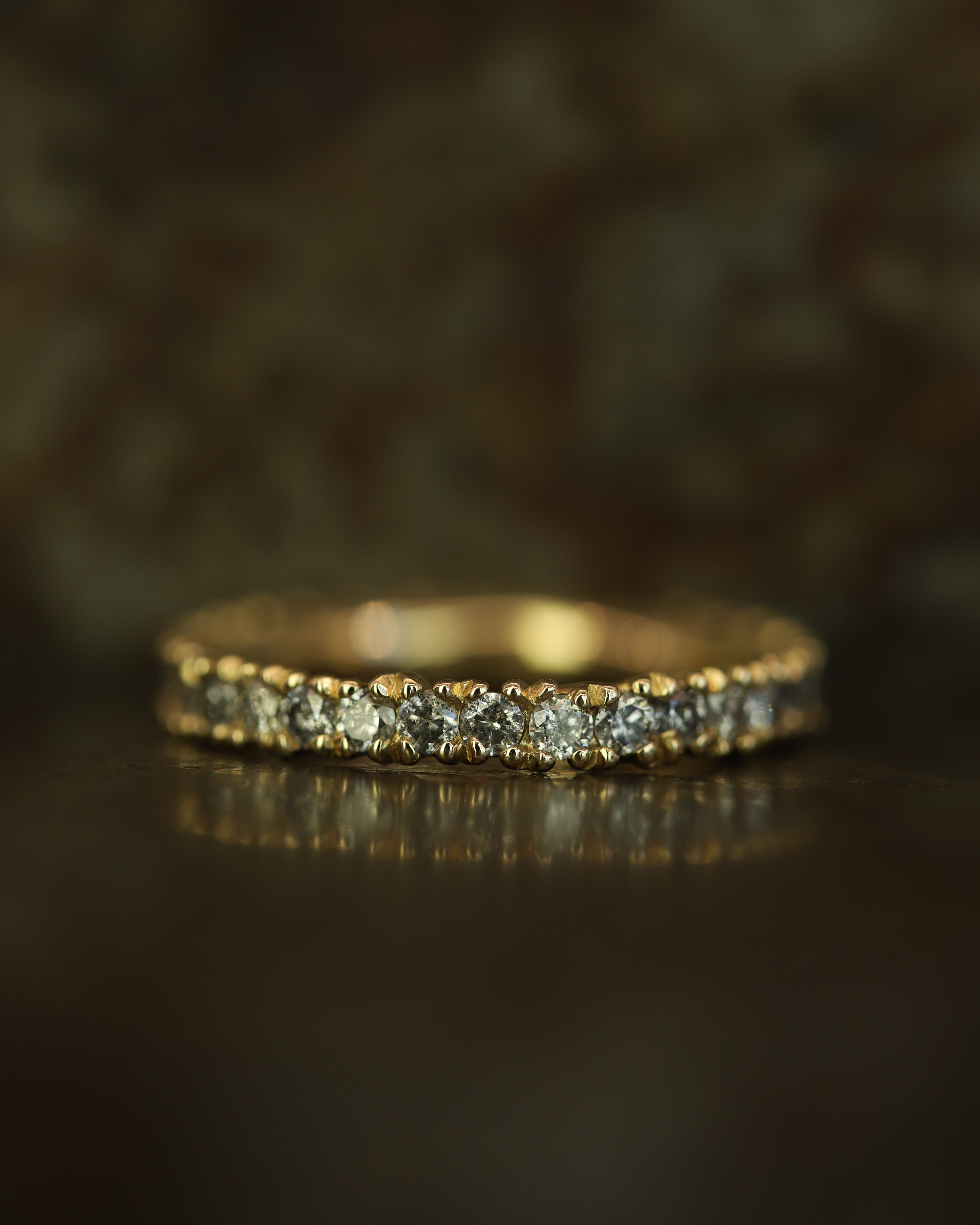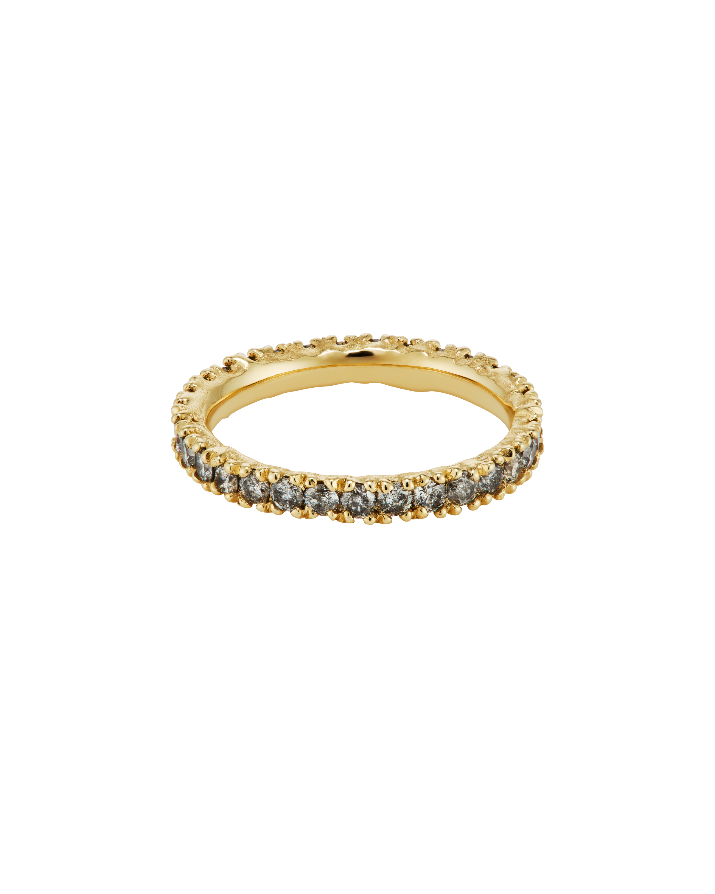 The X 2.5mm Grey Diamond Eternity Ring is inspired by the medieval jewellery hoards which have been found across Scotland. Diamonds flow into one another, organically set as though they have just been excavated.