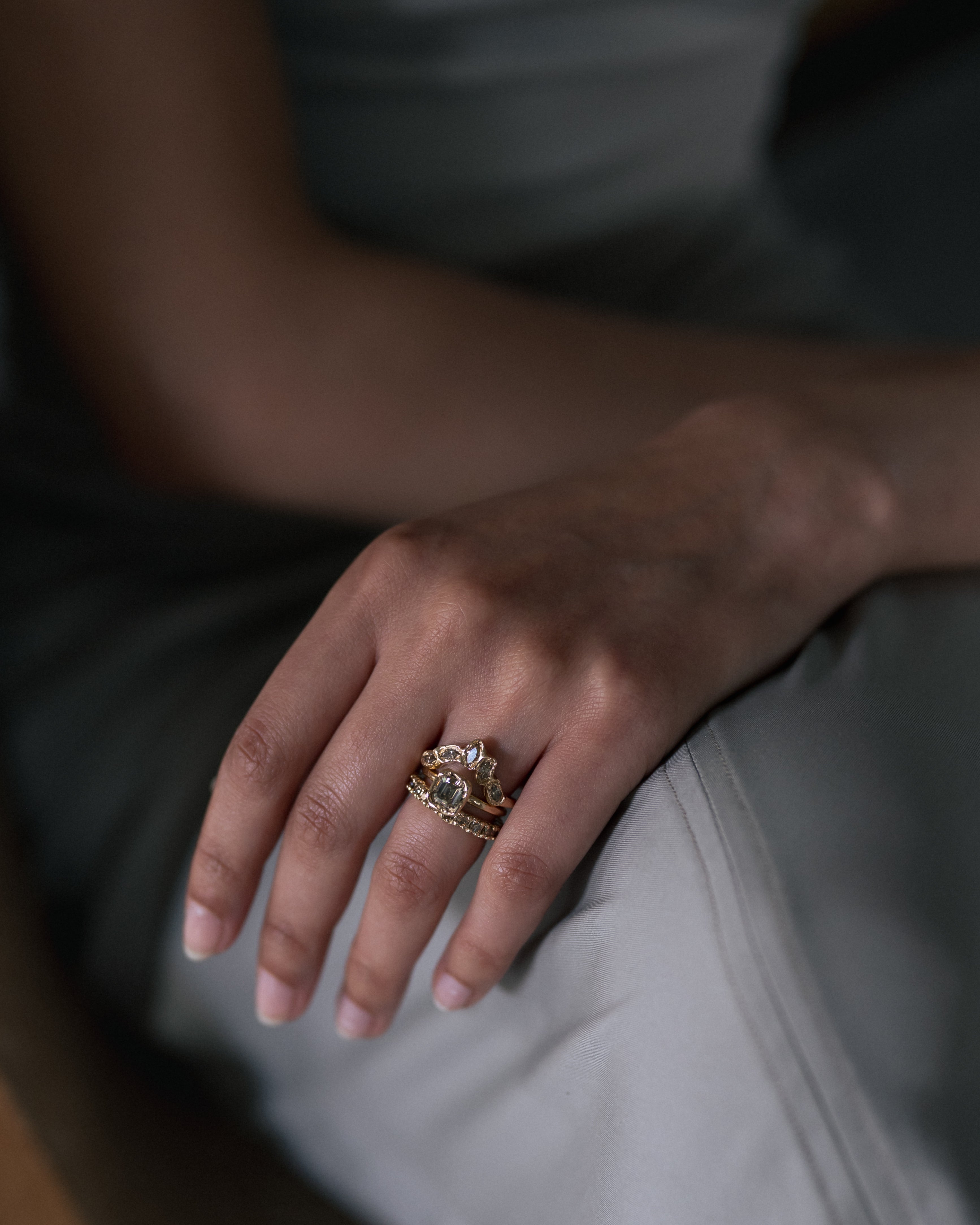 Legacy draws on the feeling of uncovering something precious - light catching on a surface, a glint of something rare. The collection features reverse-set baguette diamonds in soft yellow and champagne shades, designed to reflect light in subtle, surprising ways.