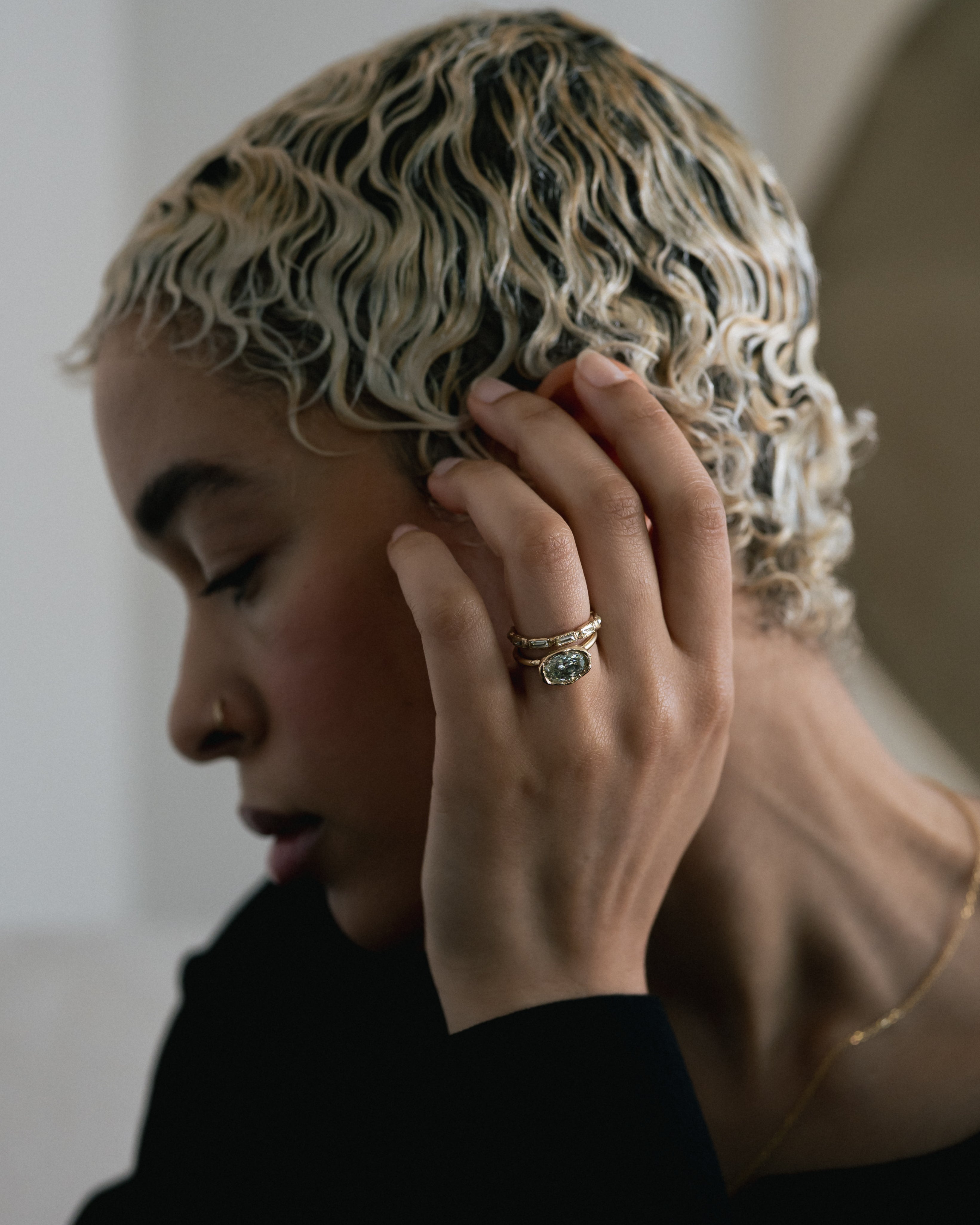 These stones are paired with icy white diamonds, scattered like flecks of treasure in textured, molten gold, to create jewellery that feels tactile and storied, combining Ellis’ erosive aesthetic with a refined sense of discovery.