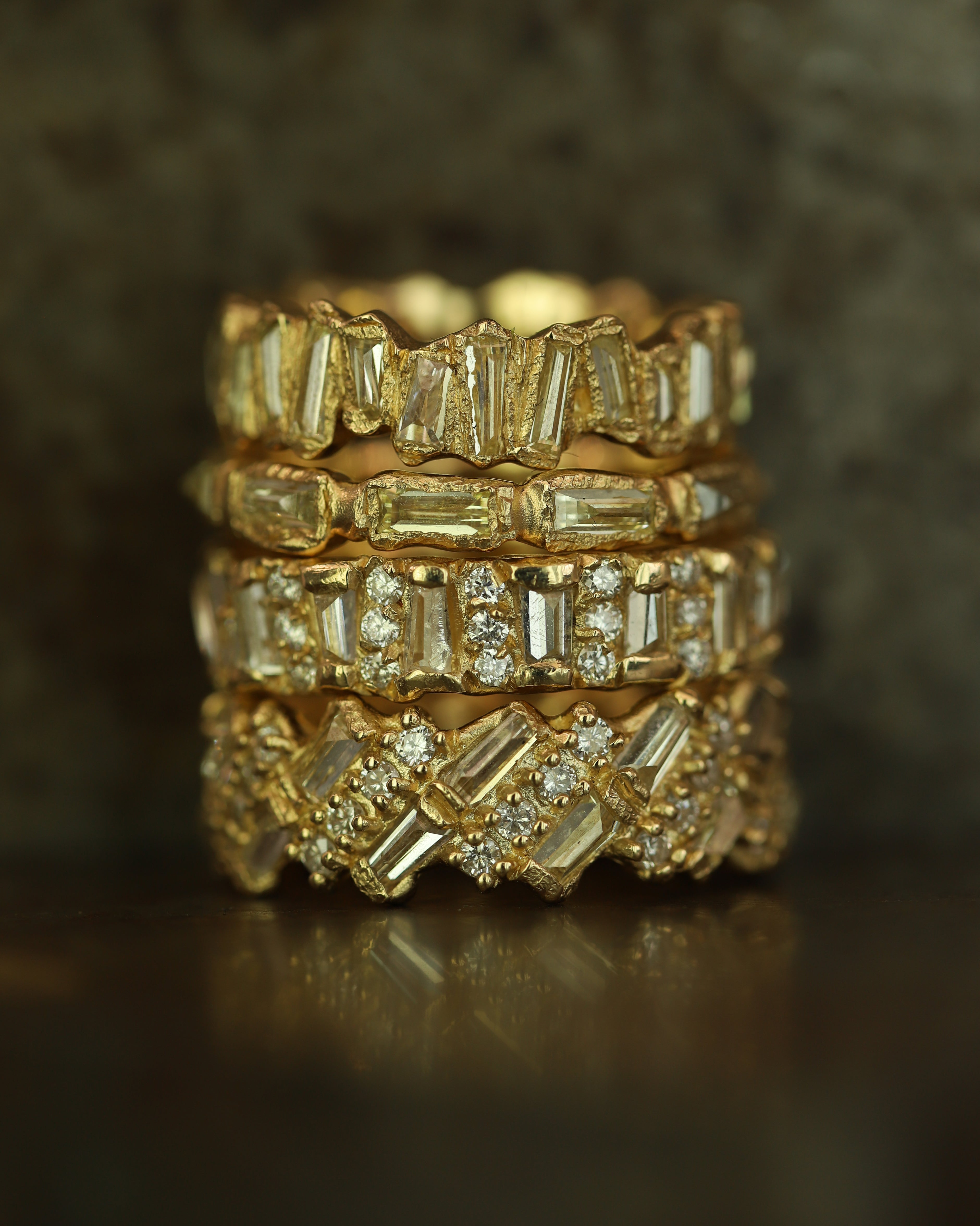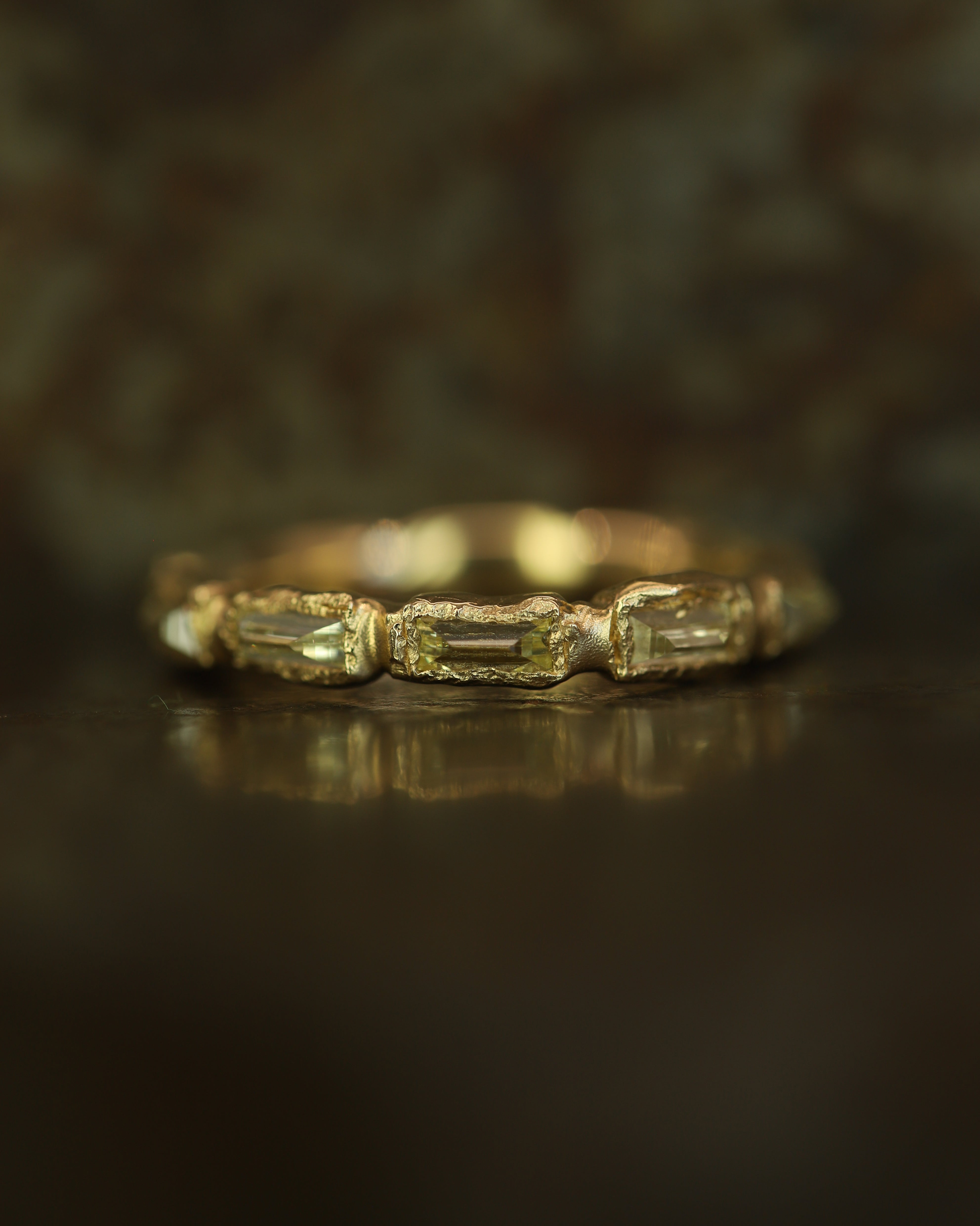 The X 3mm Lemon Baguette Diamond Eternity Ring is inspired by the medieval jewellery hoards which have been found across Scotland. Diamonds flow into one another, organically set as though they have just been excavated.