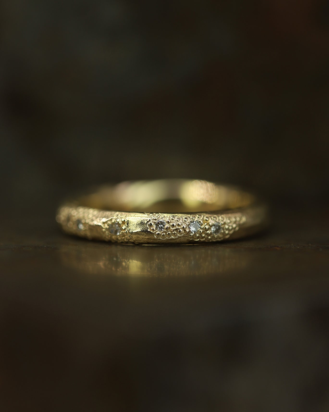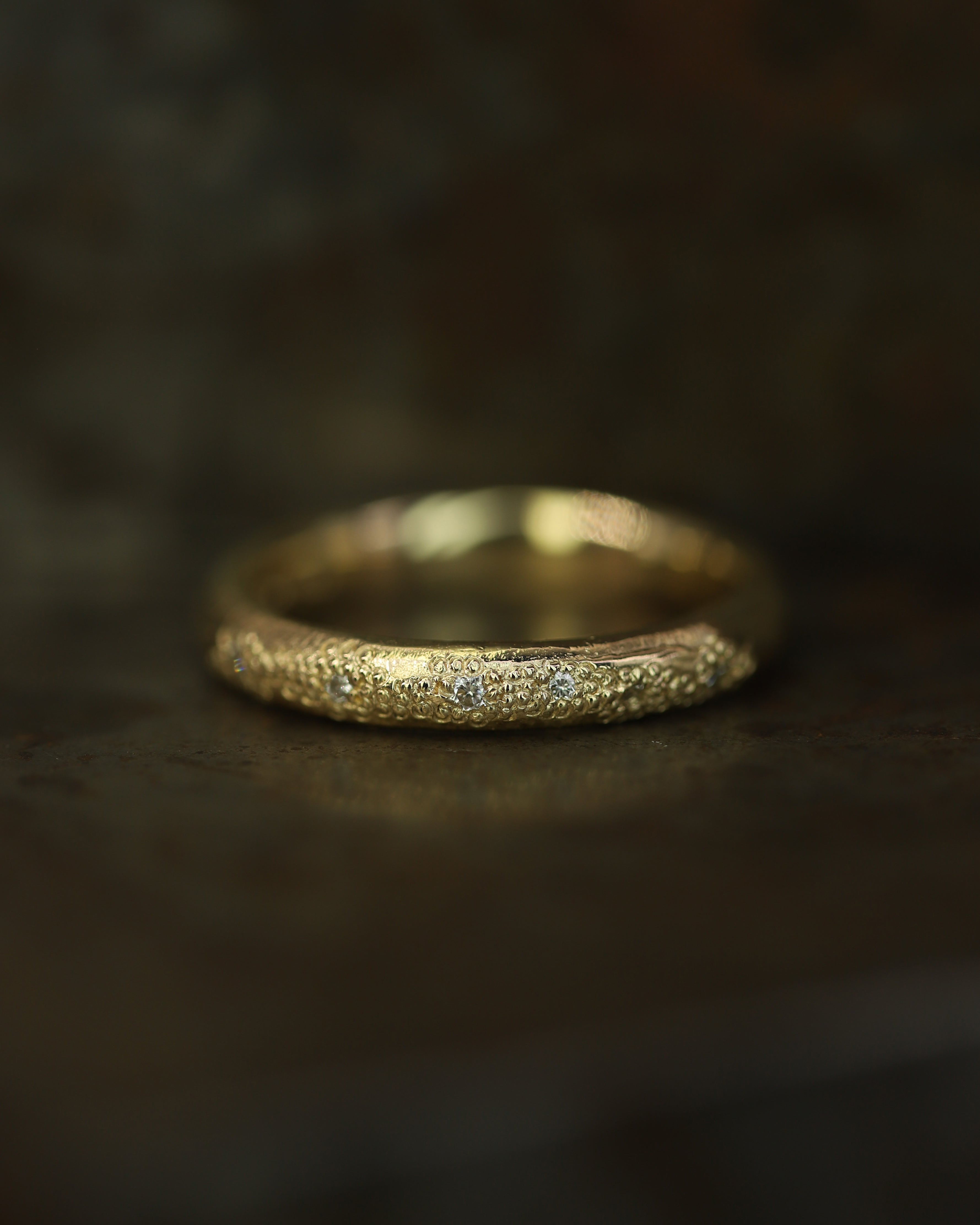The softly distressed texture of the ring band contrasts with the colours of the diamonds. The diamonds are set into the texture of the ring, as though they have just been discovered, like buried treasure.