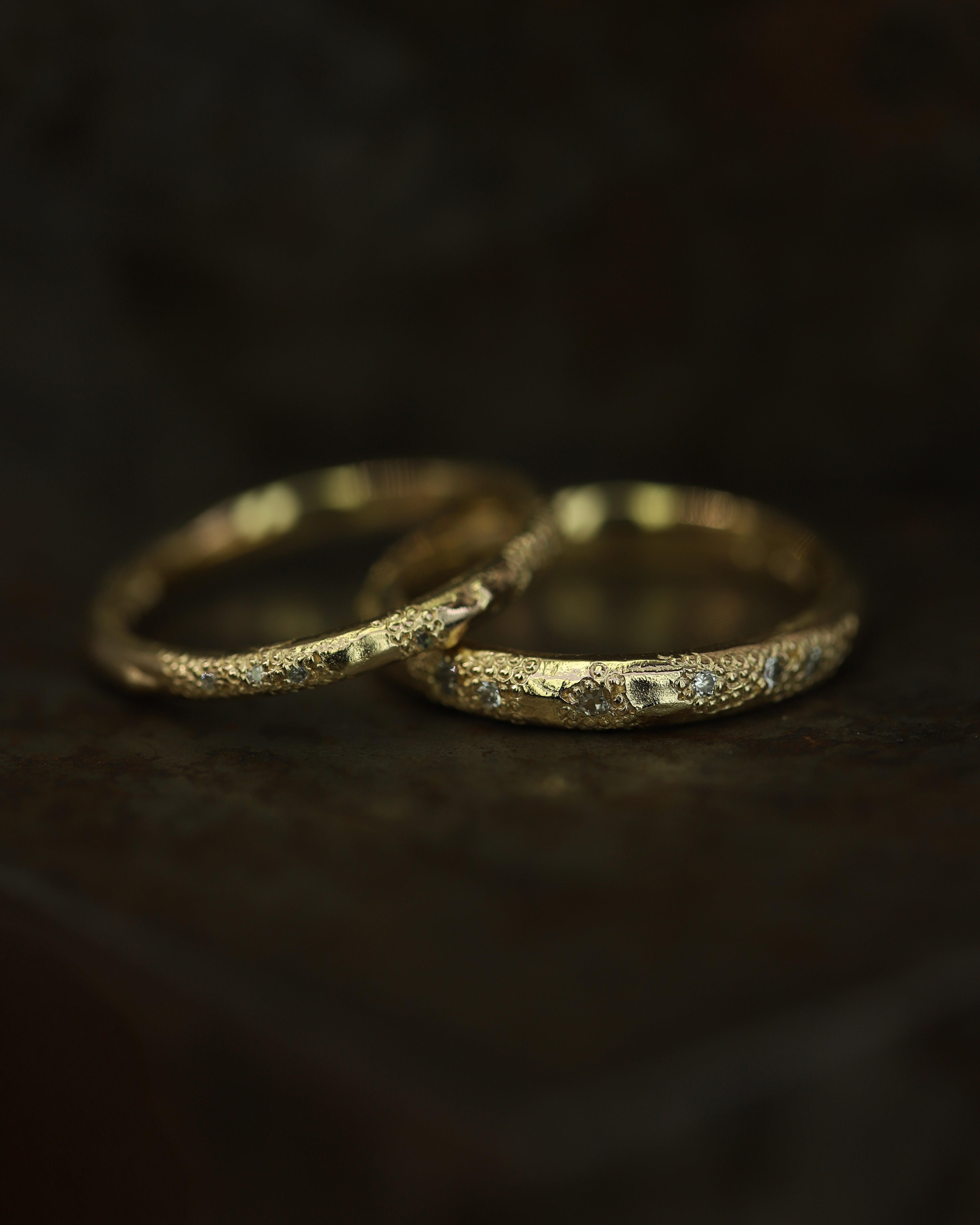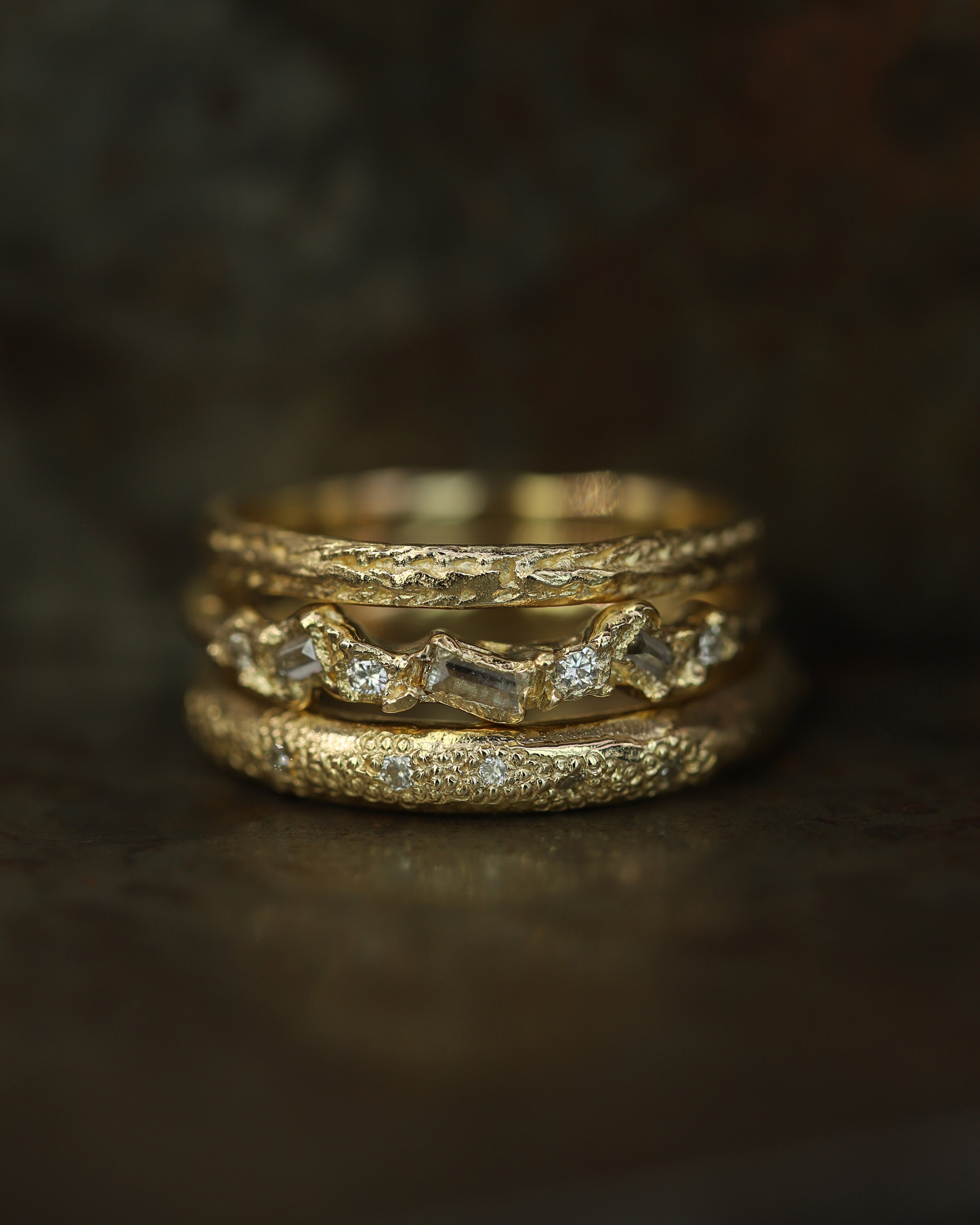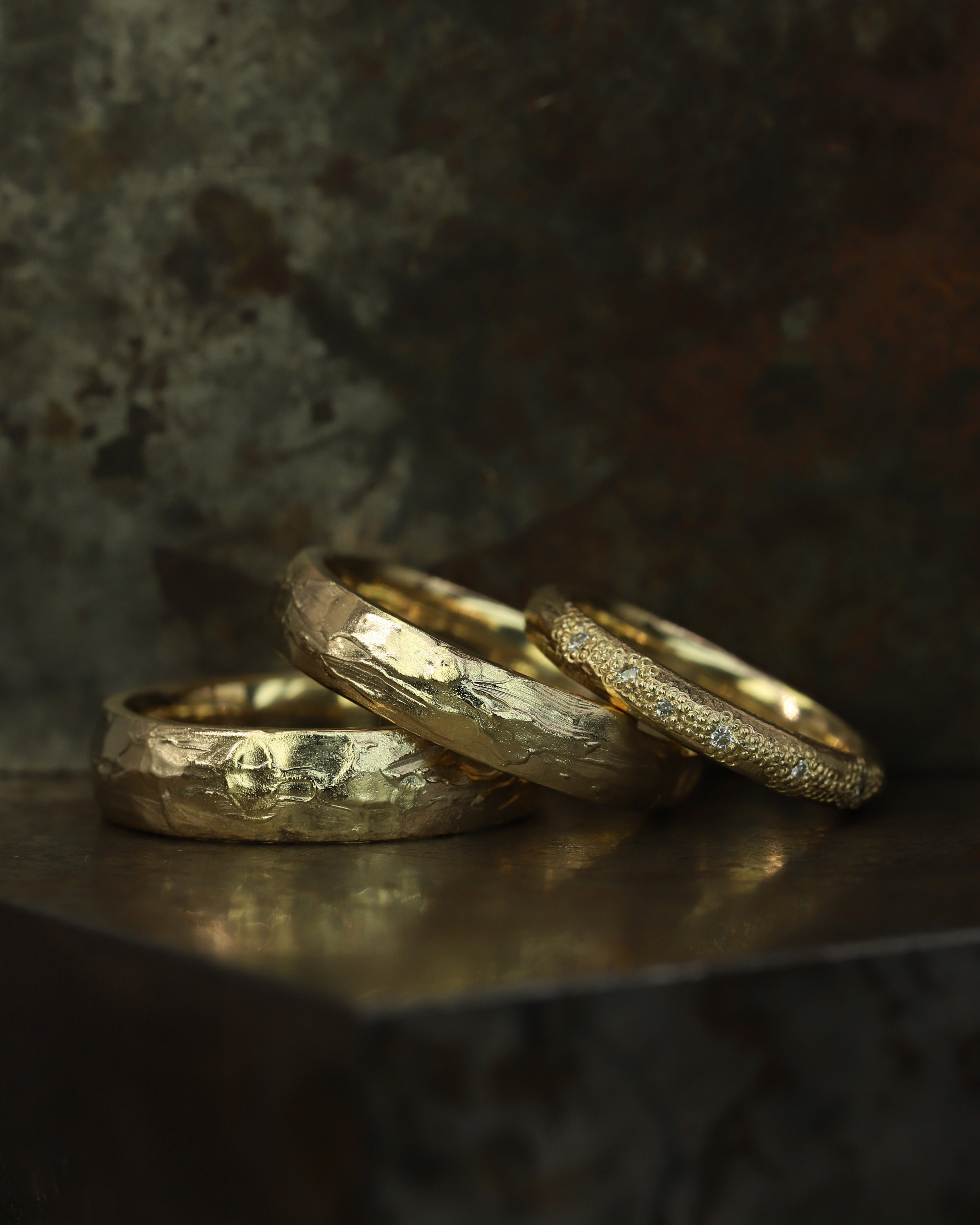 These pieces are made for couples looking for something less conventional, whether it’s an organic engagement ring, a distinctive eternity band, or a textured wedding ring. With a colour palette drawn from the Scottish landscape, created to reflect the natural tones of sunsets, and shifting autumn skies; warm, earthy, and quietly dramatic.