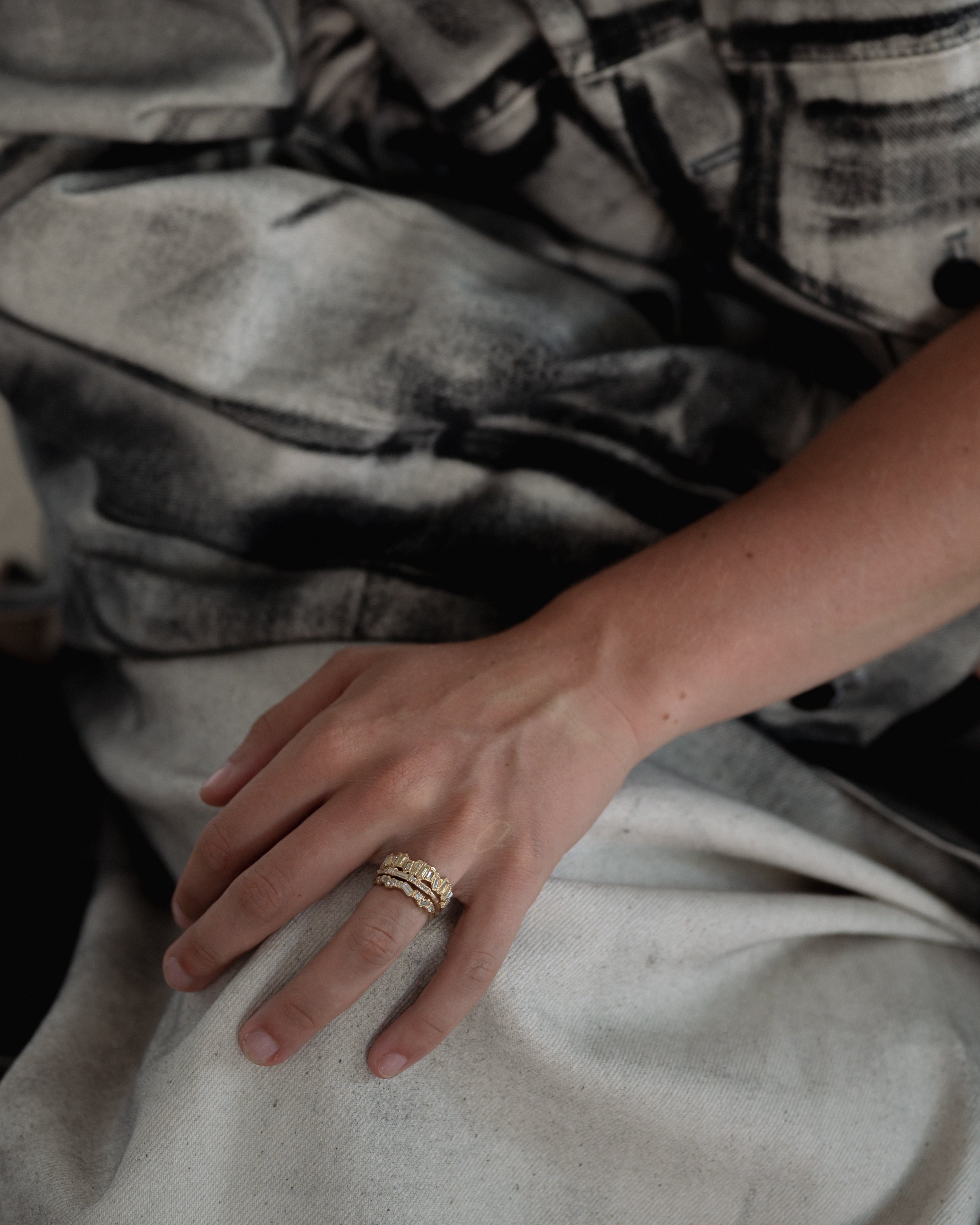 These stones are paired with icy white diamonds, scattered like flecks of treasure in textured, molten gold, to create jewellery that feels tactile and storied, combining Ellis’ erosive aesthetic with a refined sense of discovery.