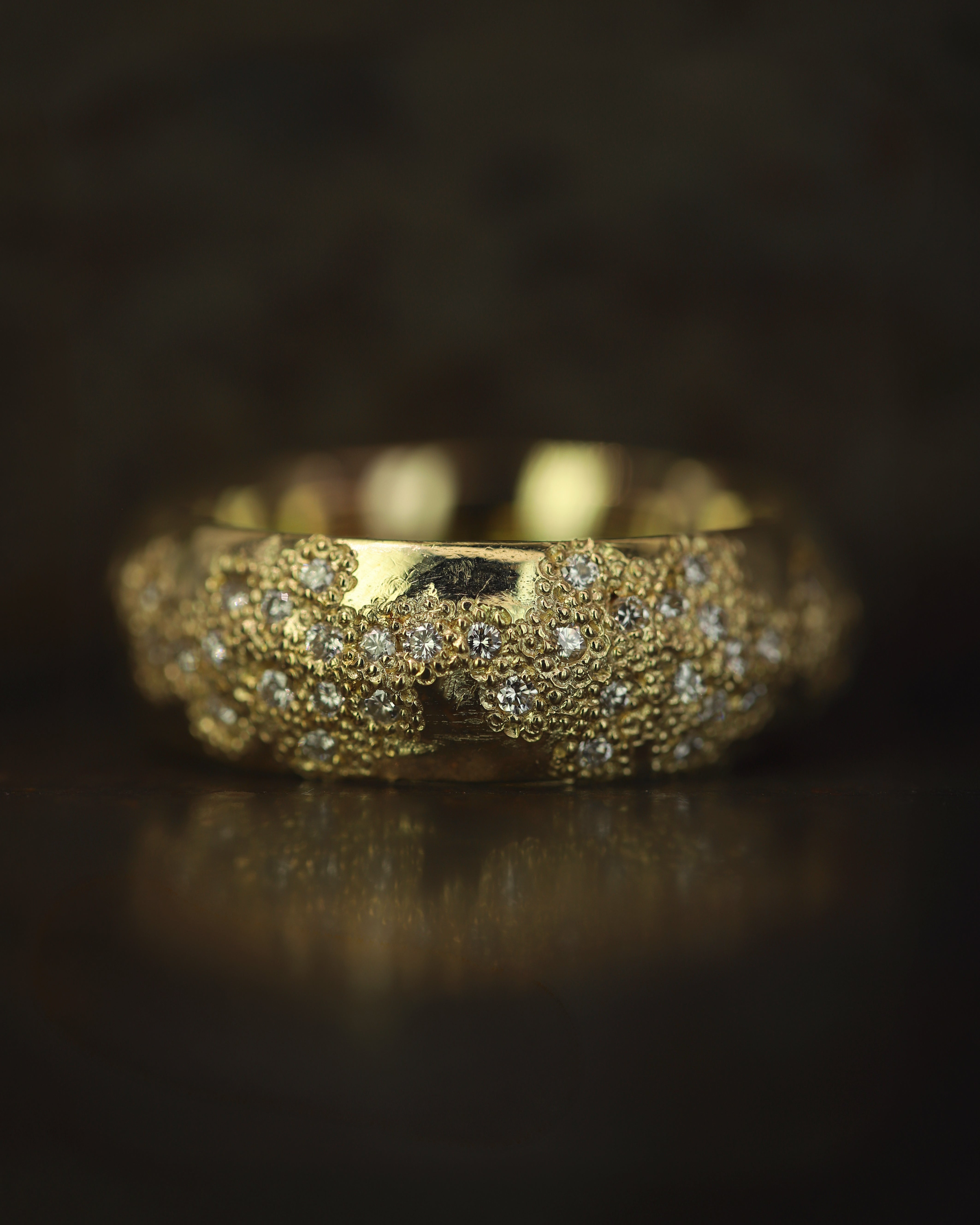 The softly distressed texture of the ring band contrasts with the scattering of white diamonds. This would make a stunning wedding ring, or statement ring.
