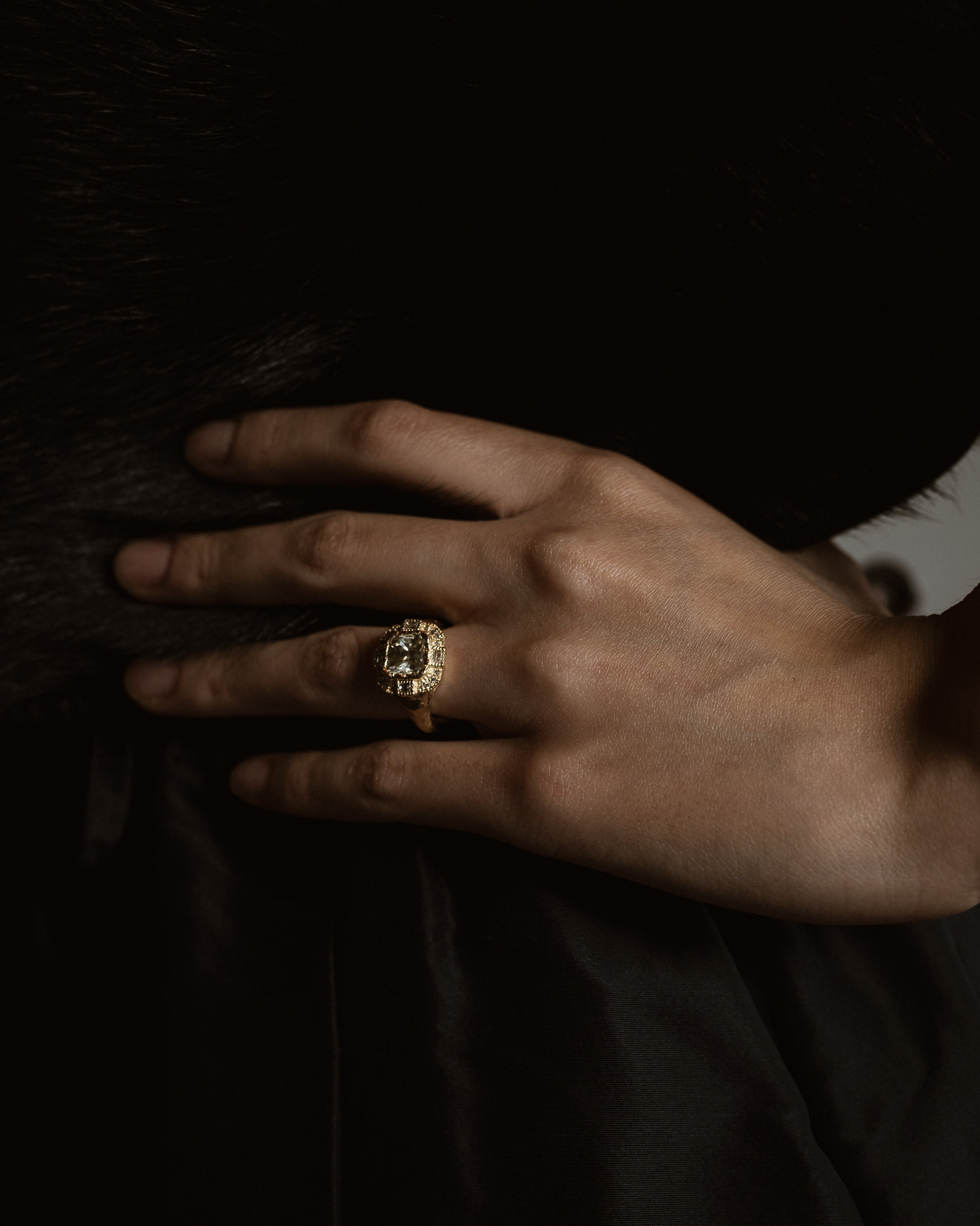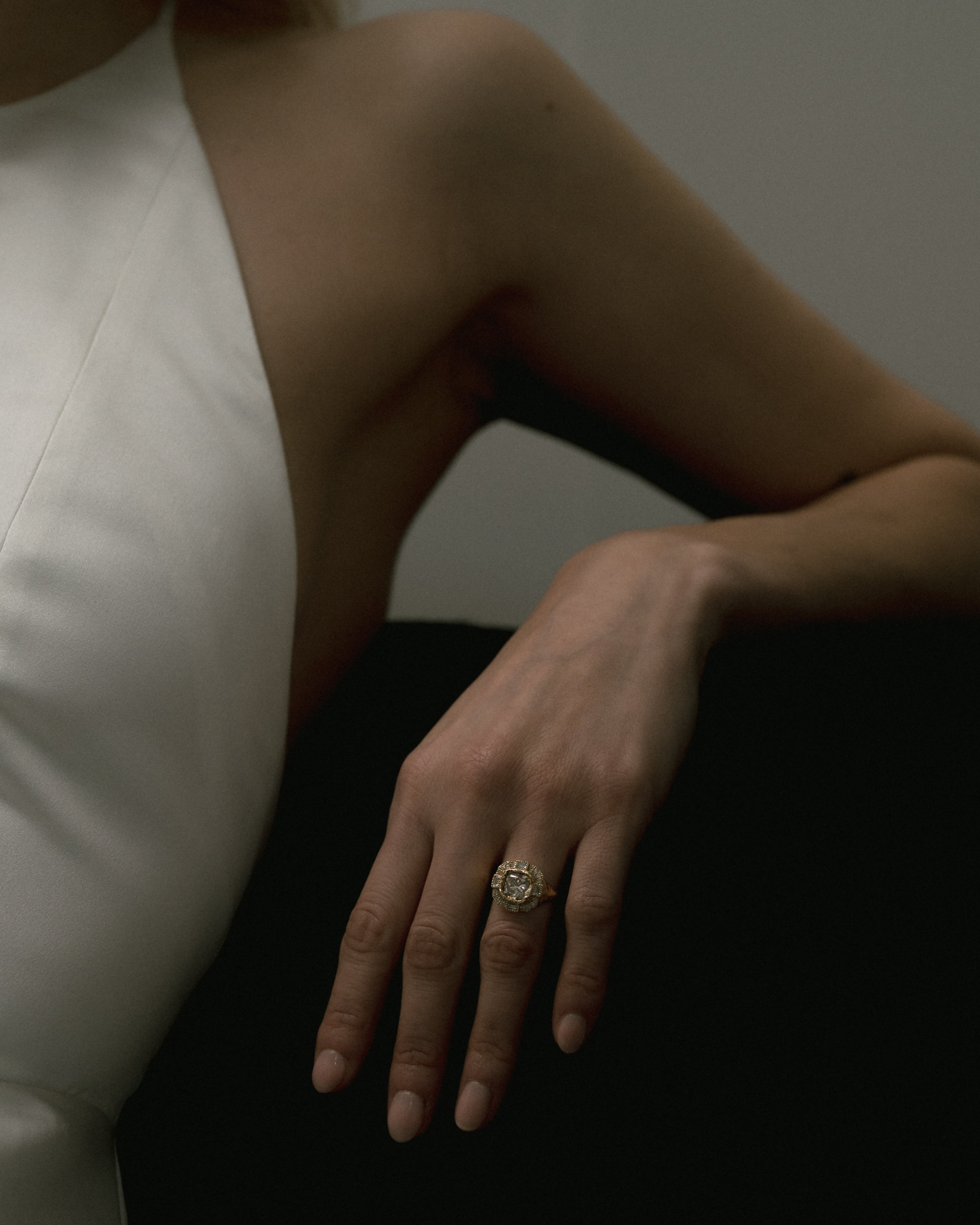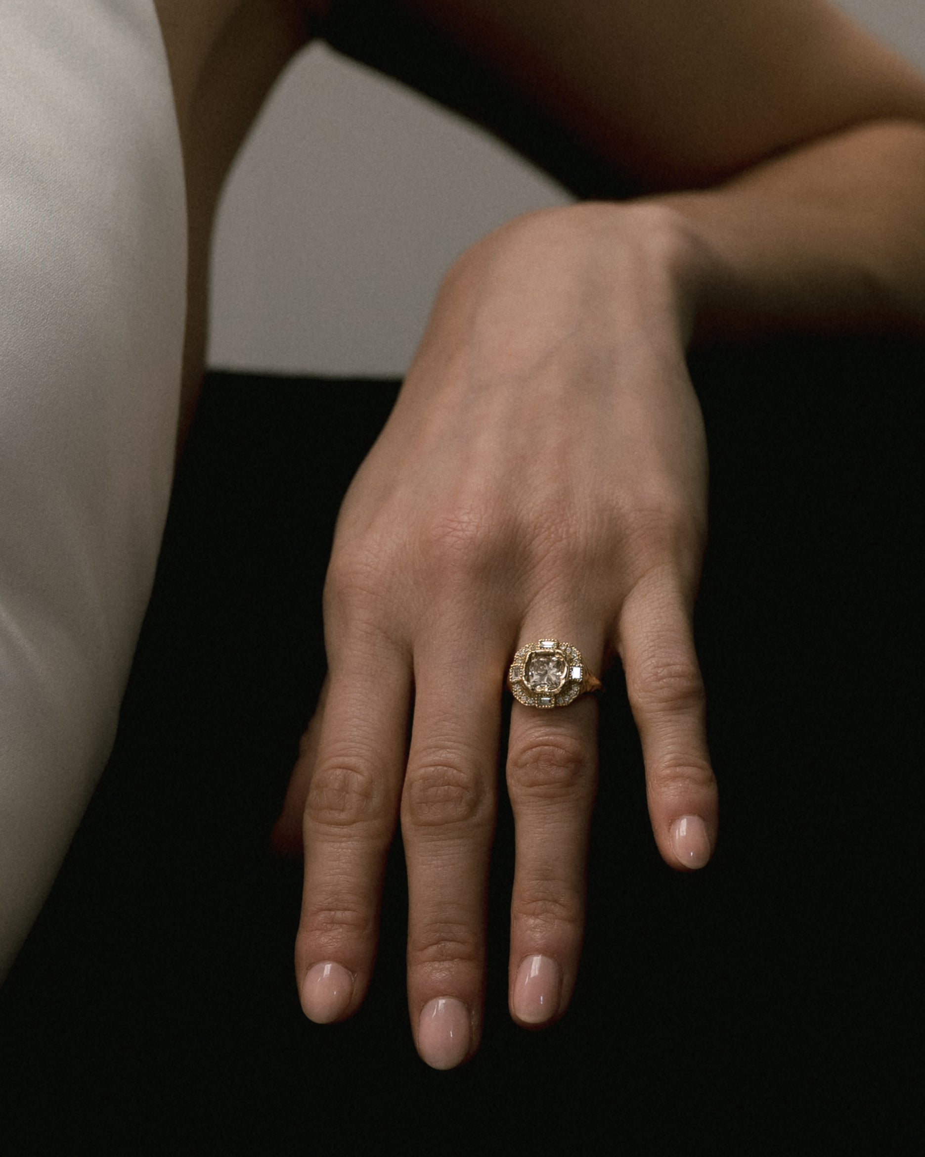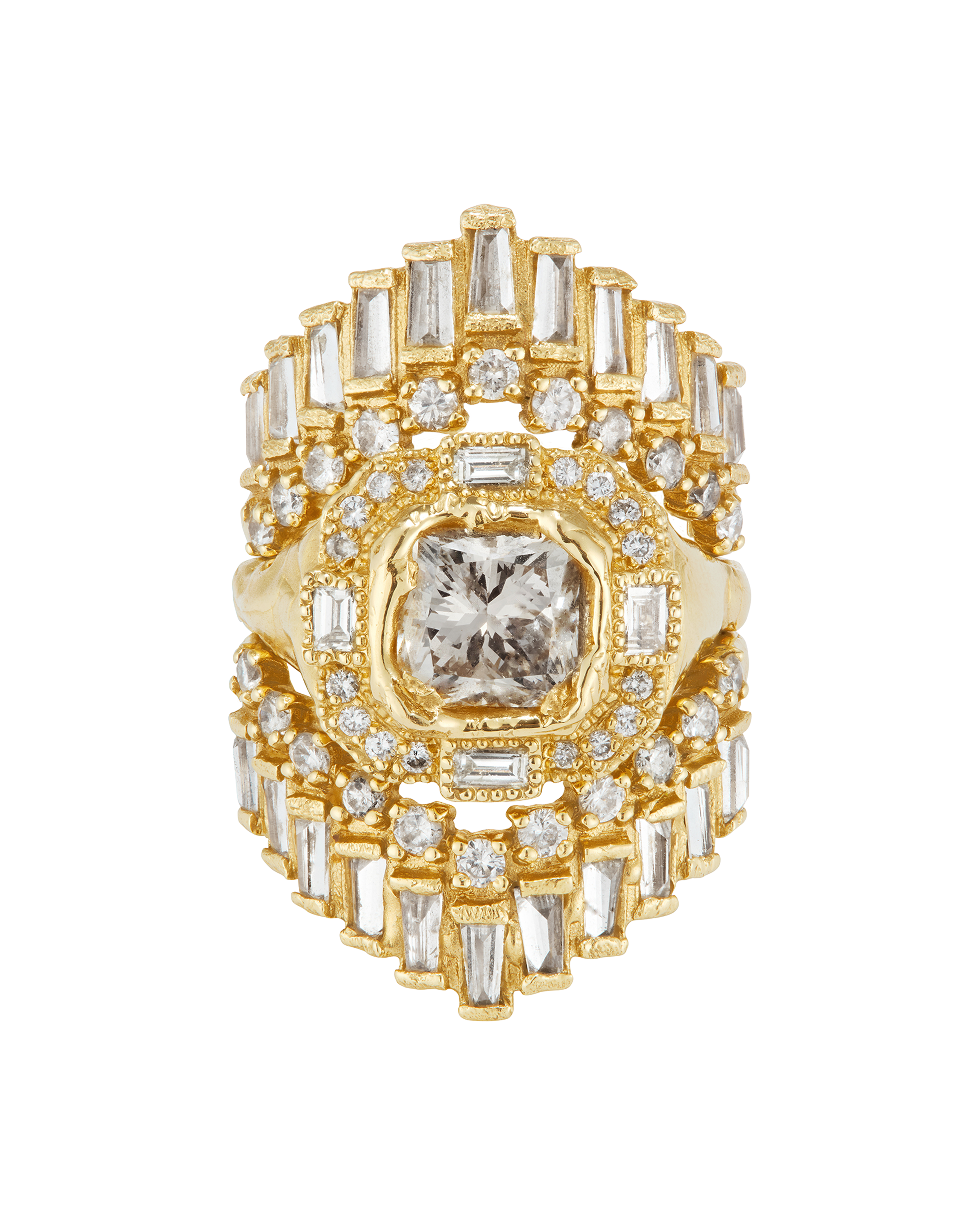 The Armach Cushion Icy White Diamond Cocktail Ring features an exquisite icy white cushion diamond at its centre surrounded by mixed cut white diamonds, set in softly textured gold. The band is carved in Ellis' signet ring style; a one of a kind statement piece, that balances strength with elegance. Perfect as a cocktail ring or engagement ring; worn solo, or stacked with other styles.