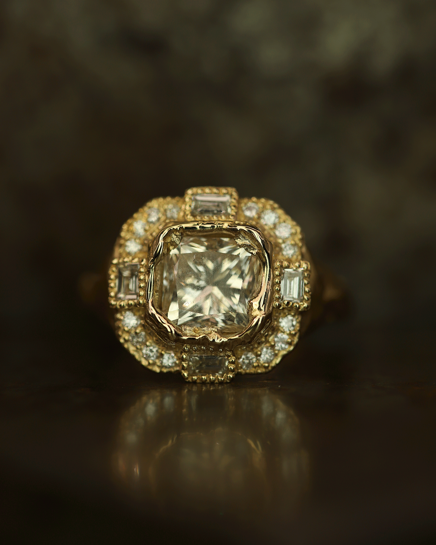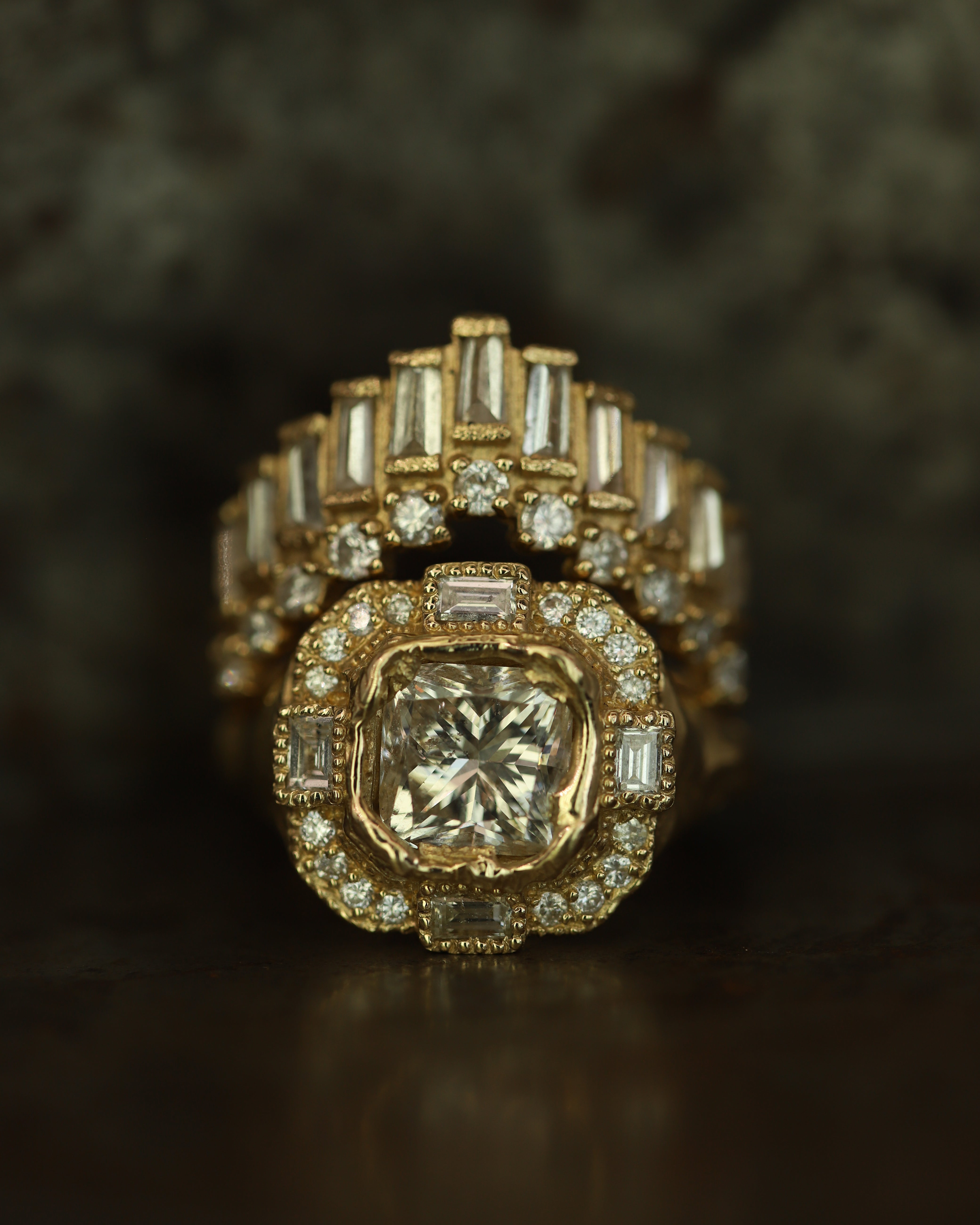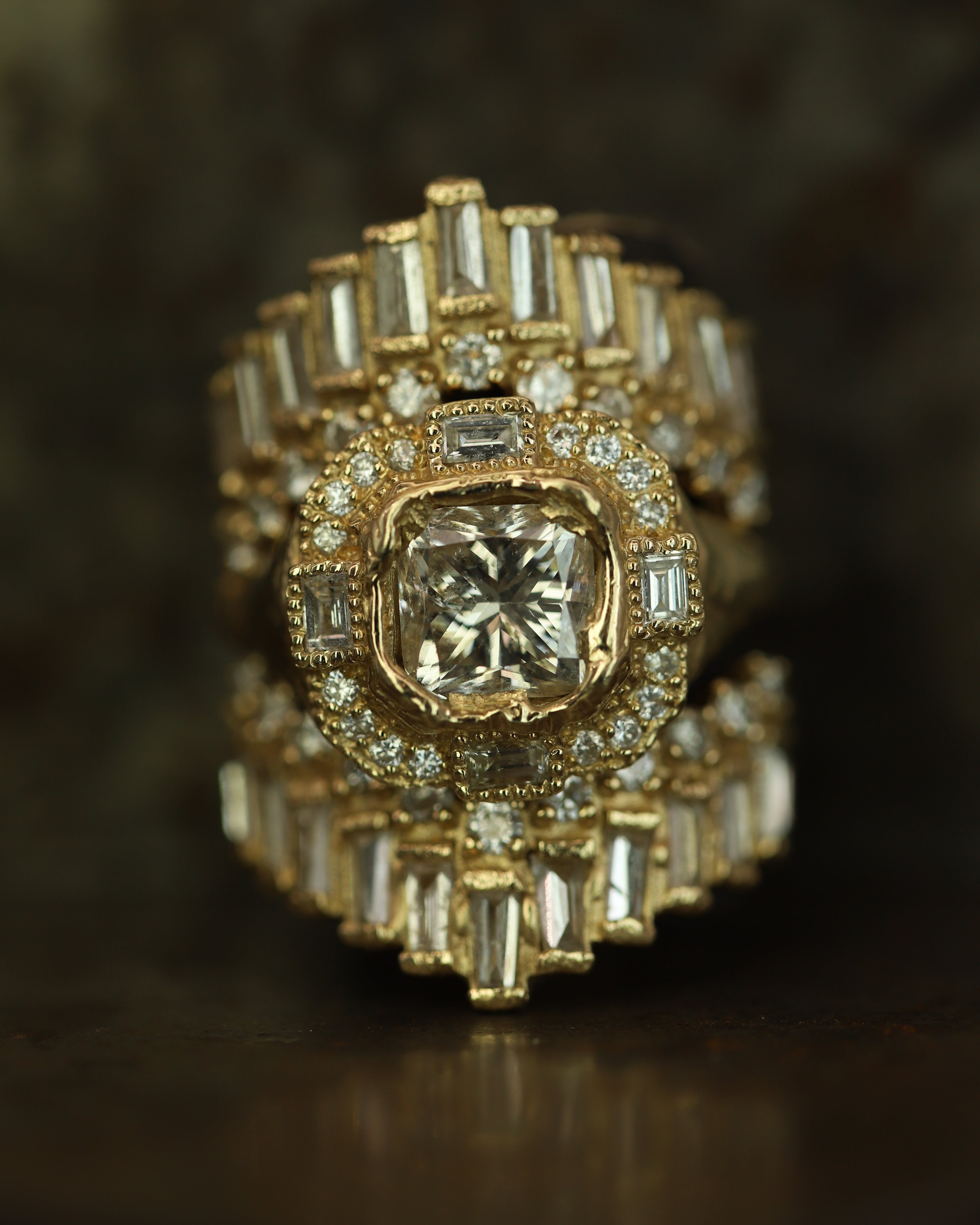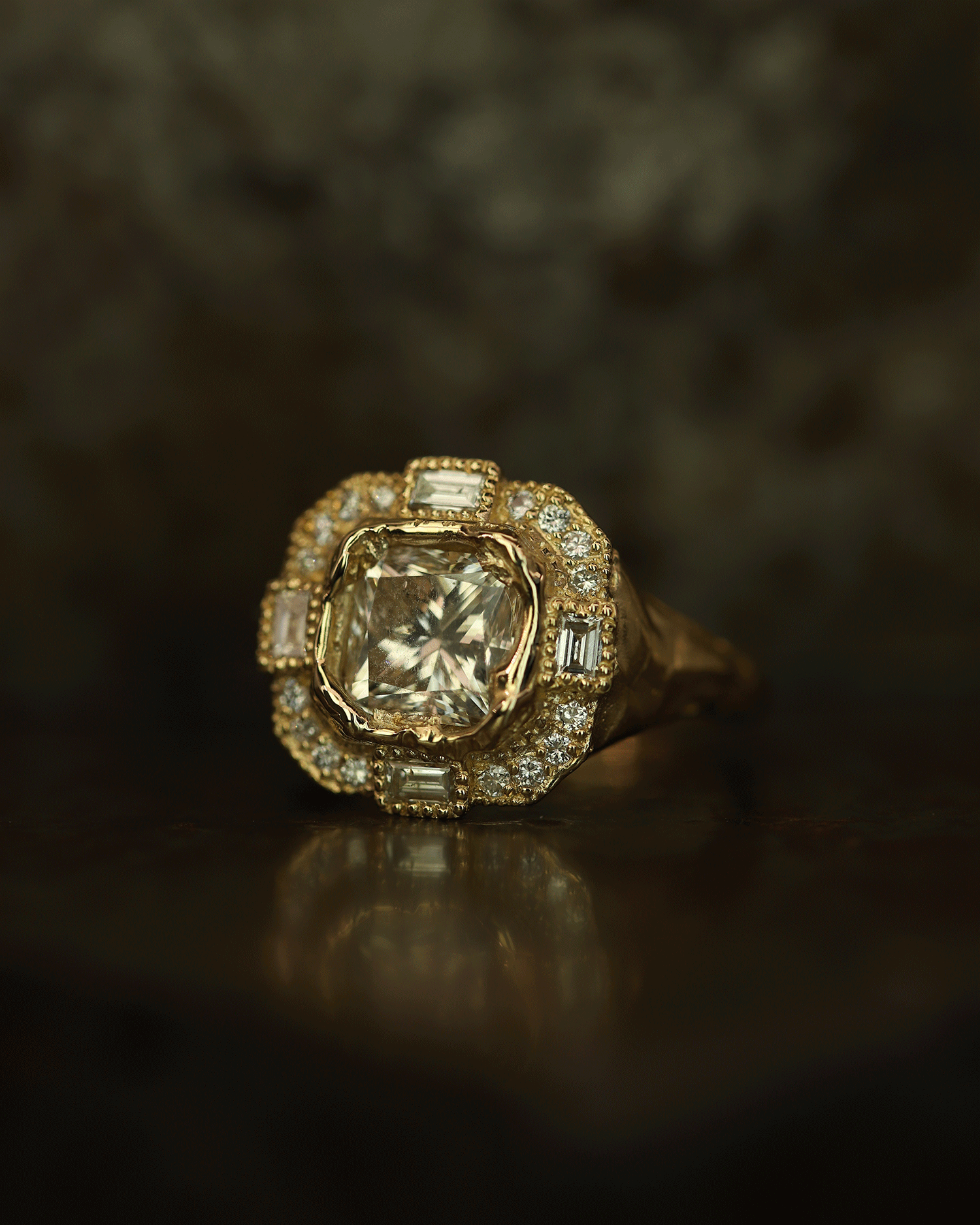 The Armach Cushion Icy White Diamond Cocktail Ring features an exquisite icy white cushion diamond at its centre surrounded by mixed cut white diamonds, set in softly textured gold. The band is carved in Ellis' signet ring style; a one of a kind statement piece, that balances strength with elegance. Perfect as a cocktail ring or engagement ring; worn solo, or stacked with other styles.