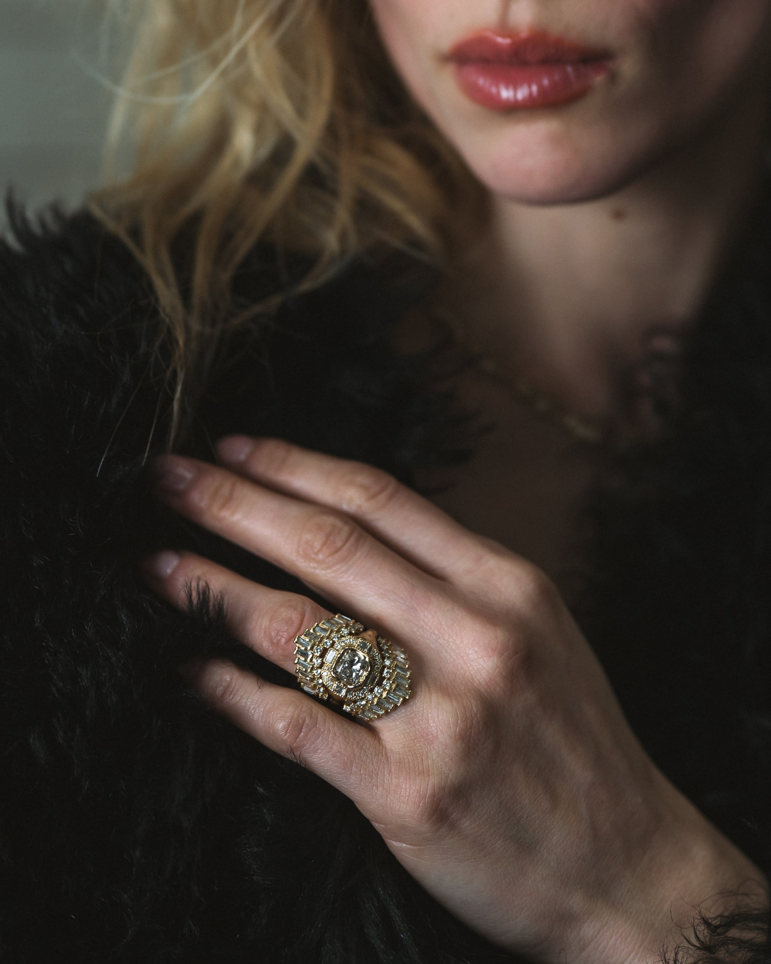 Ellis discovered ancient weaponry on her family farmland - objects of protection and defence. The Armach collection reimagines what we mean by armour; a combination of diamonds and gold, worn for confidence and strength.