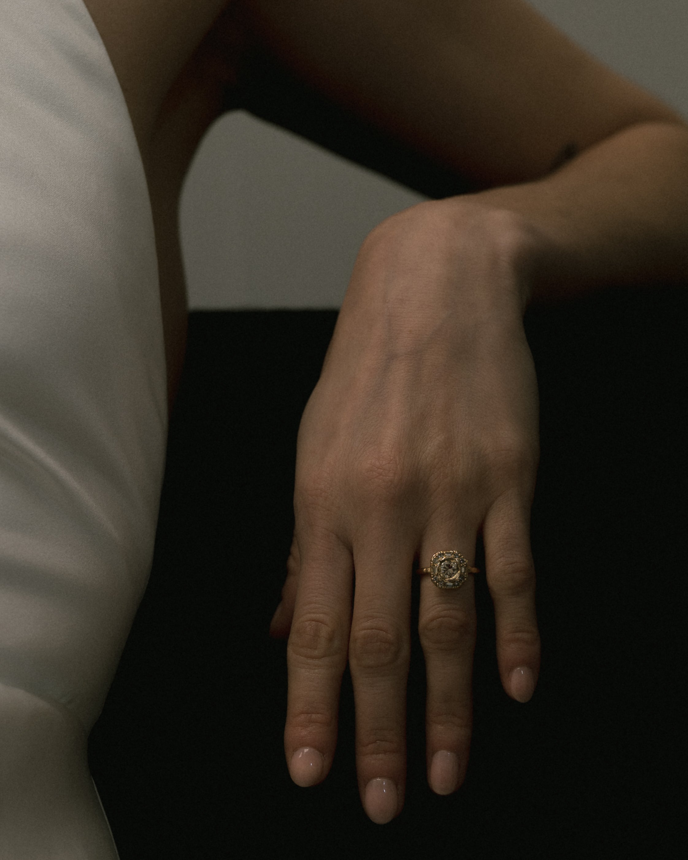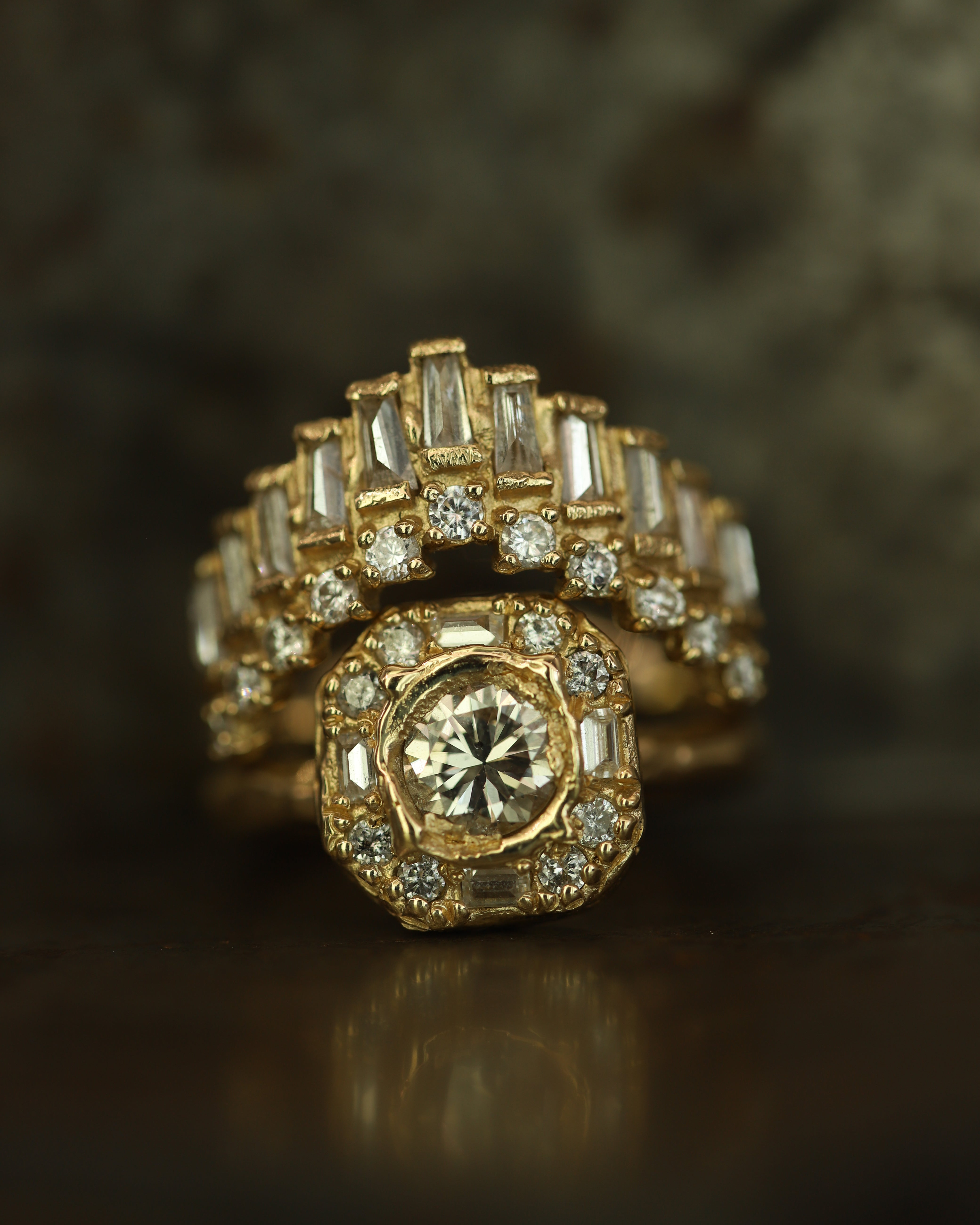 The Armach Diamond Cocktail Ring I features a single soft white diamond at its centre surrounded by mixed cut diamonds, set in softly textured gold. Perfect as a cocktail ring or engagement ring; worn solo, or stacked with other styles.