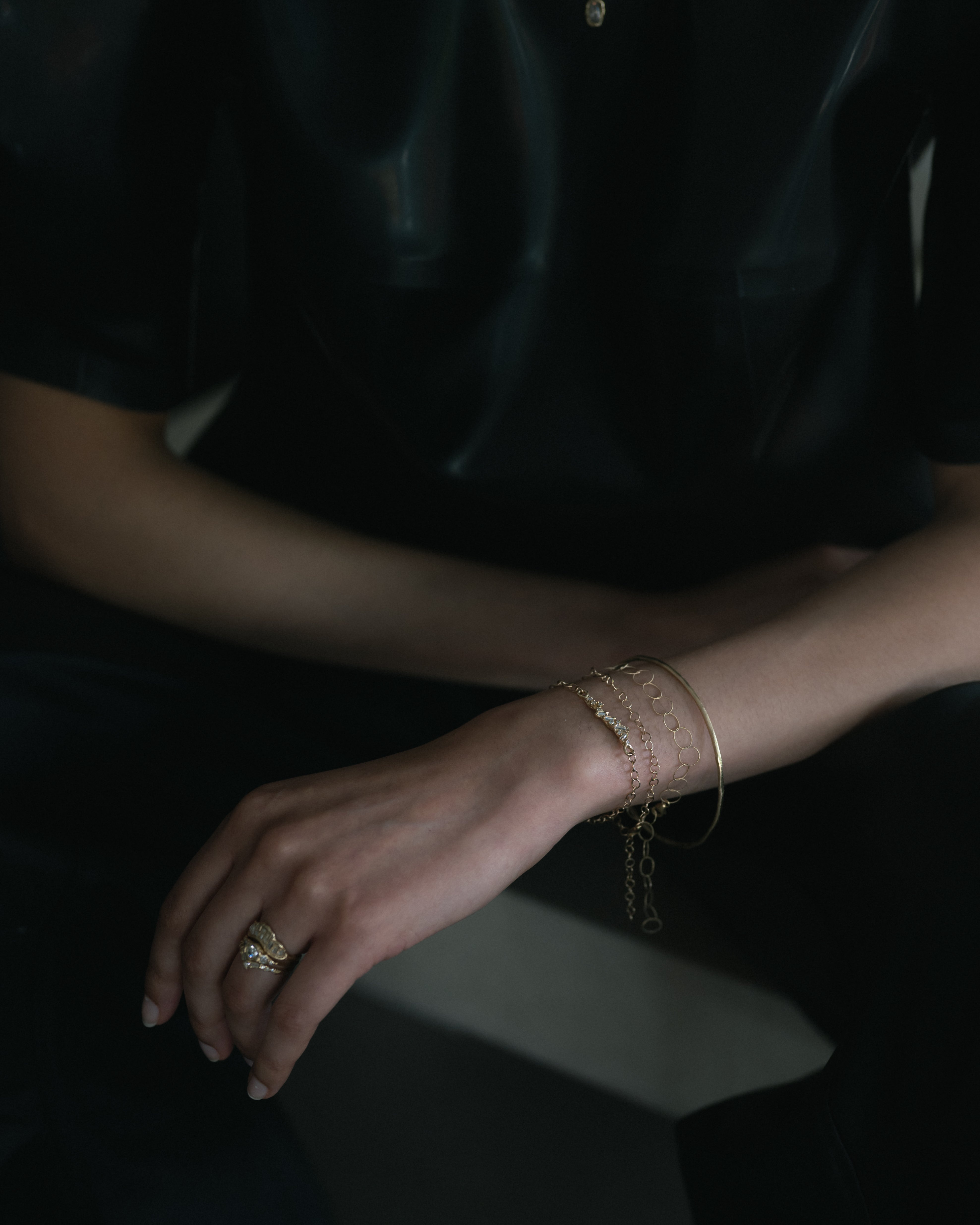 Ellis discovered ancient weaponry on her family farmland - objects of protection and defence. The Armach collection reimagines what we mean by armour; a combination of diamonds and gold, worn for confidence and strength.