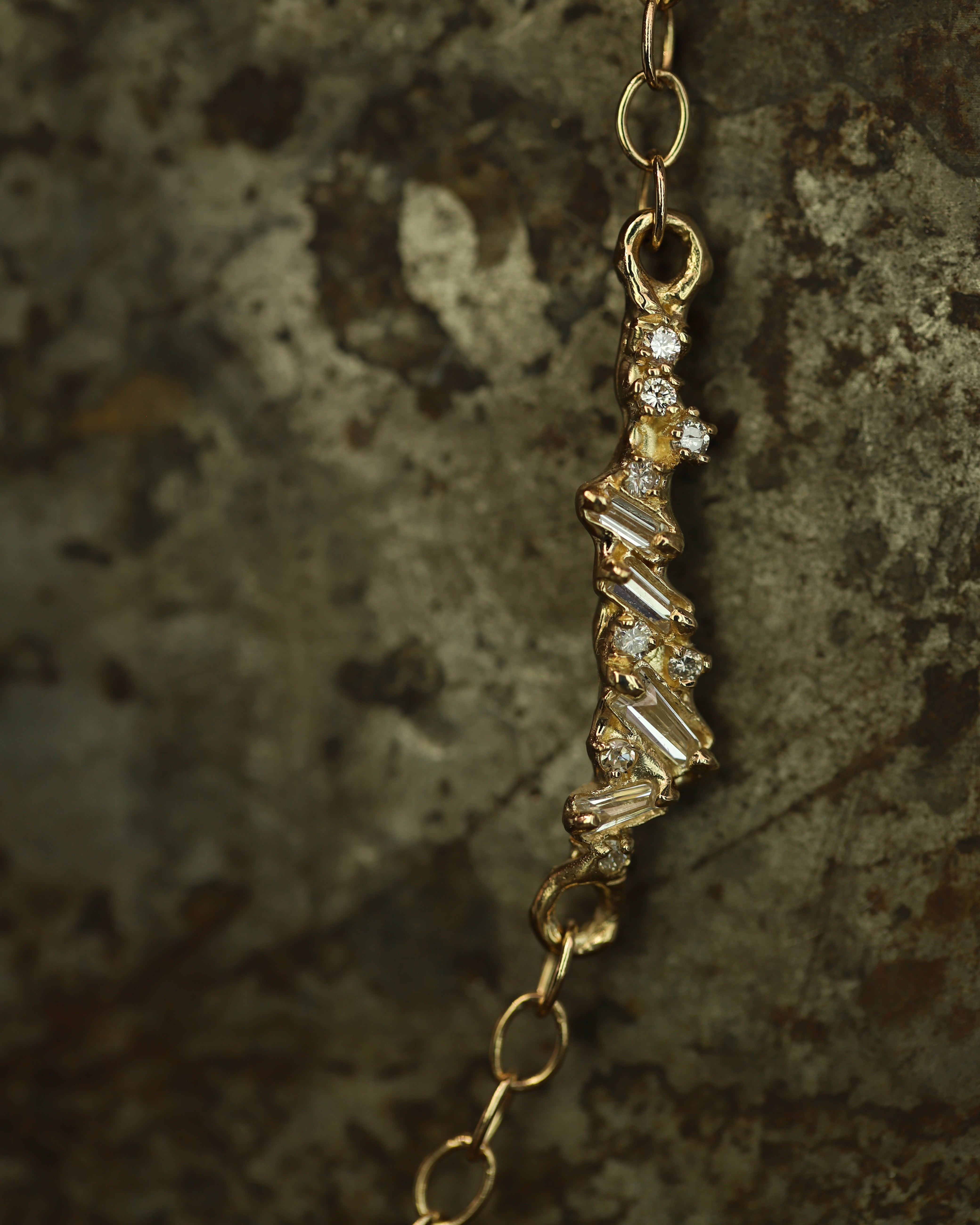 Lightweight and easy to wear, the subtle nature of the textured links catch in the light, contrasting with the sparkle of the reverse set baguette diamonds and round brilliant cut diamonds. Wear solo, or pair with the matching pendant necklace from the collection.