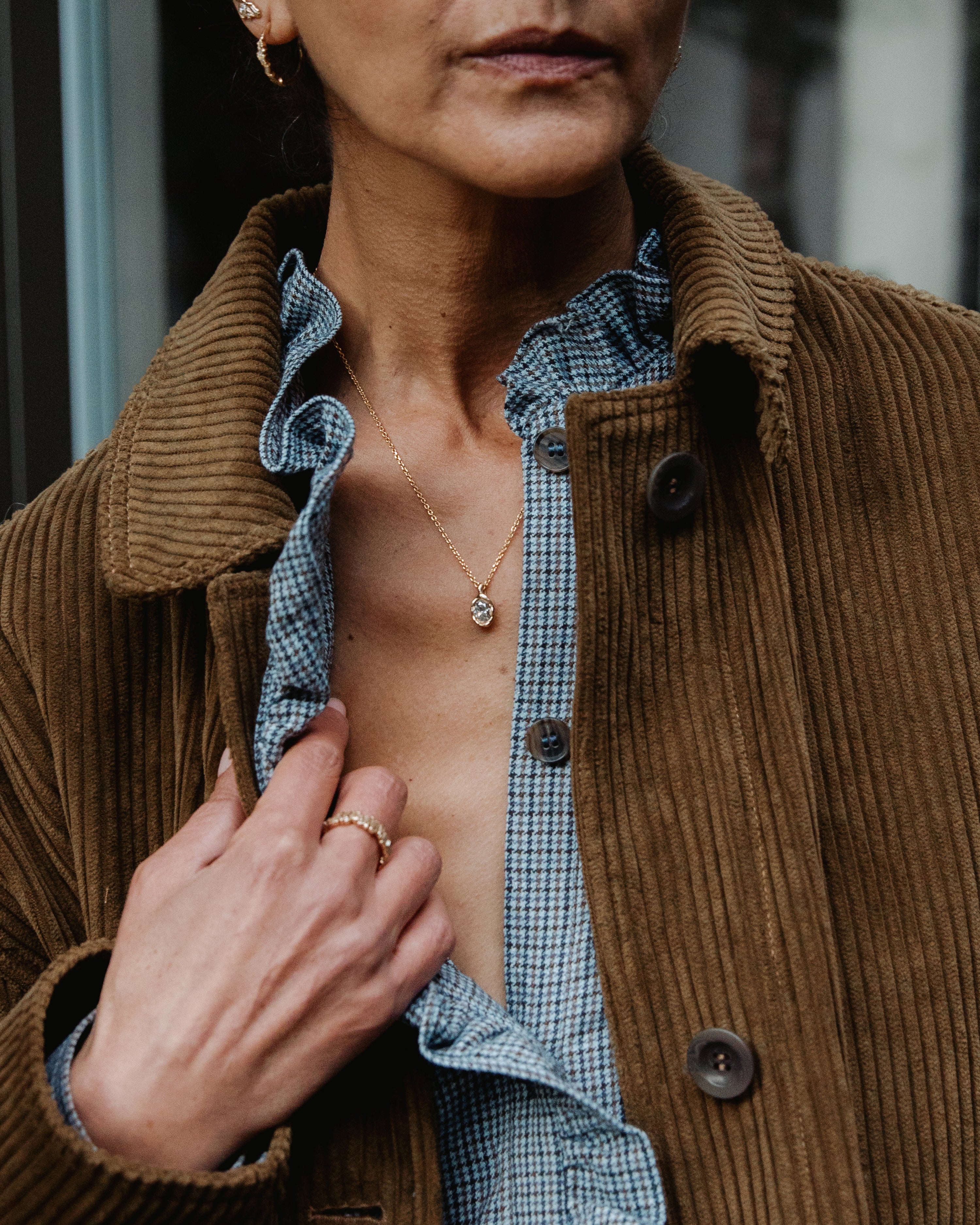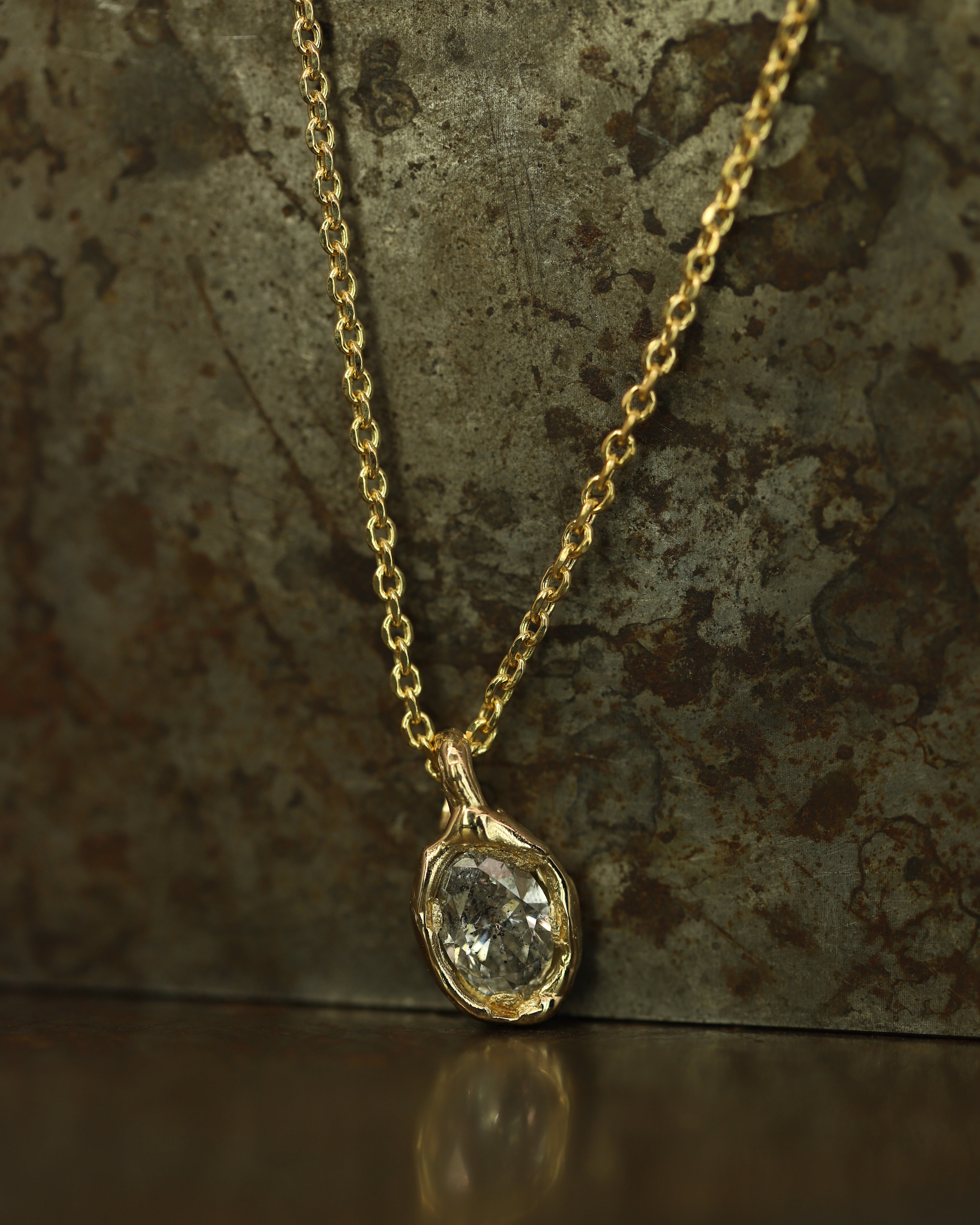 Lightweight and easy to wear, the subtle textures of the gold catches in the light,  contrasting with the oval salt & pepper diamond. Wear solo, or pair with other pieces in the collection. The perfect everyday necklace, with a statement feel.