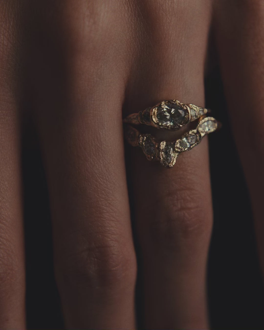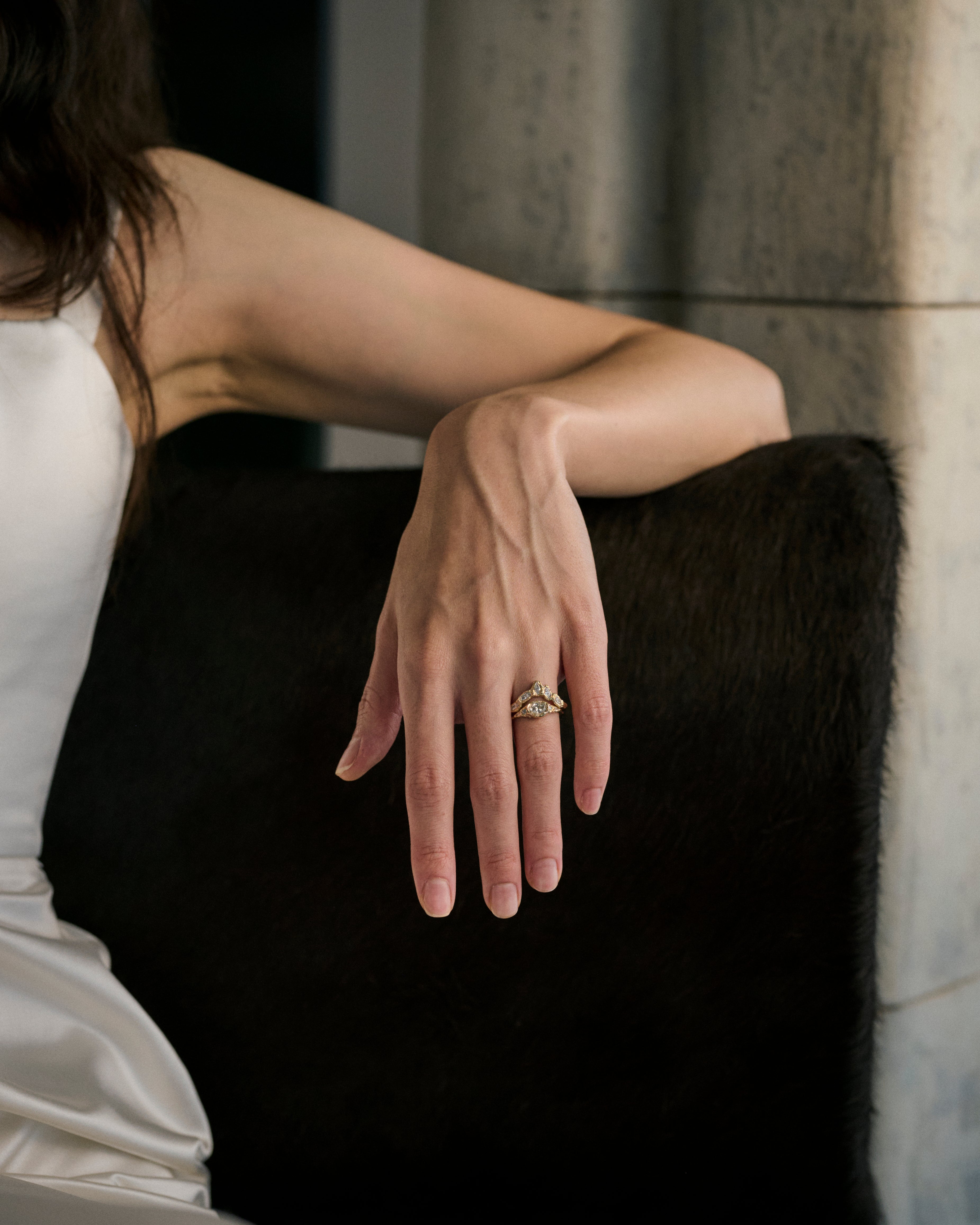 These stones are paired with icy white diamonds, scattered like flecks of treasure in textured, molten gold, to create jewellery that feels tactile and storied, combining Ellis’ erosive aesthetic with a refined sense of discovery.