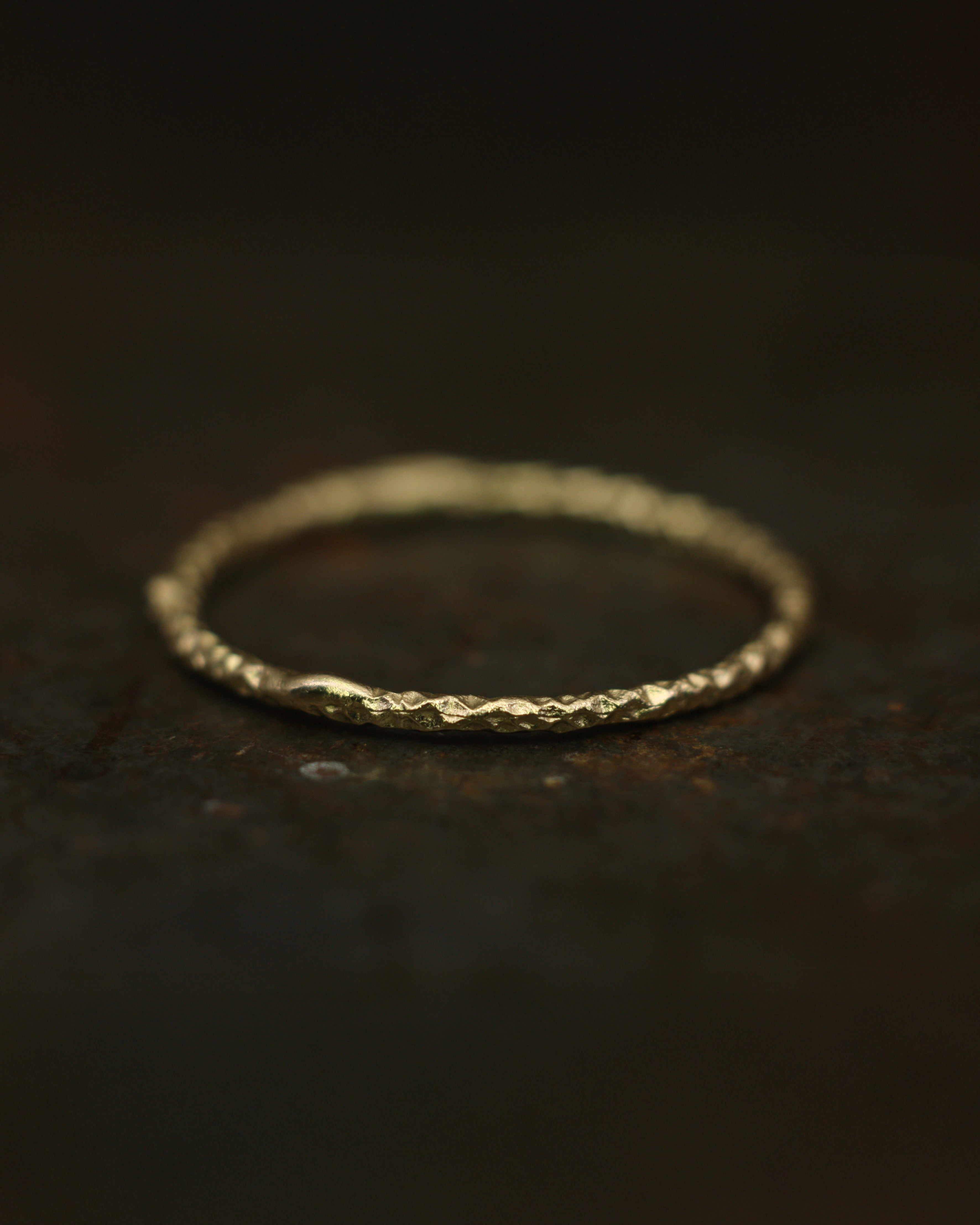 The LXI 1mm Gold Textured Wedding Band is inspired by the medieval jewellery hoards which have been found across Scotland. Perfect as a proposal ring, wedding ring, midi ring, or worn stacked with other styles.
