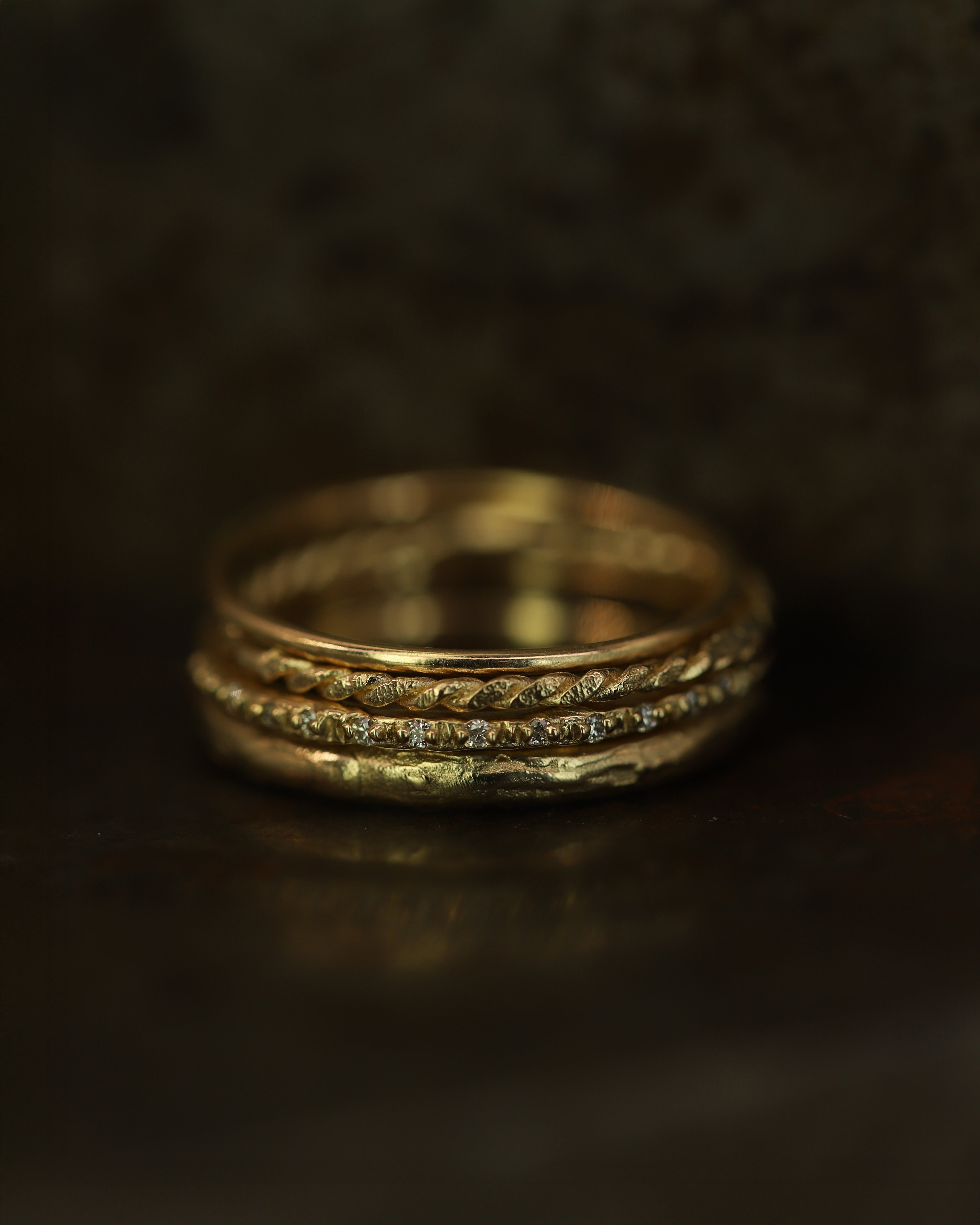 These pieces are made for couples looking for something less conventional, whether it’s an organic engagement ring, a distinctive eternity band, or a textured wedding ring. With a colour palette drawn from the Scottish landscape, created to reflect the natural tones of sunsets, and shifting autumn skies; warm, earthy, and quietly dramatic.