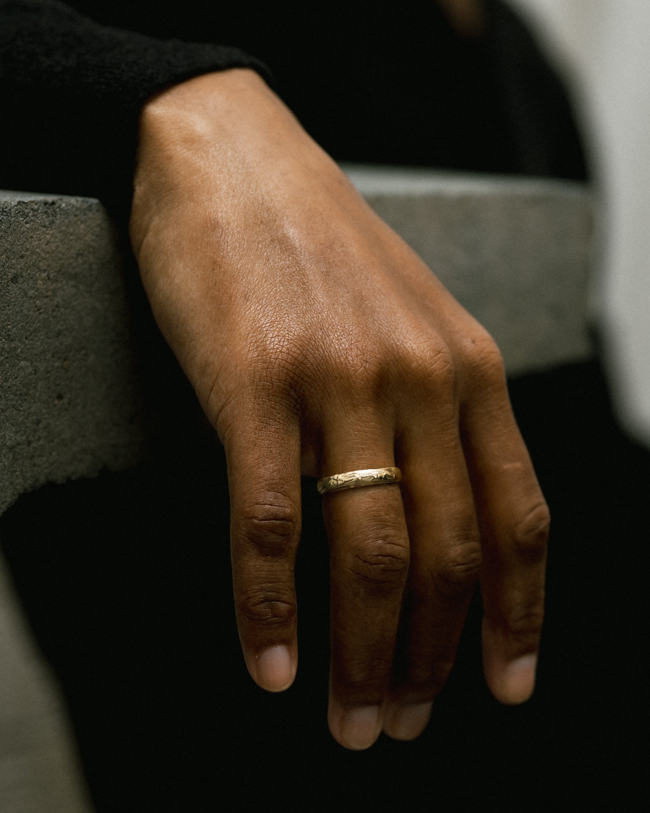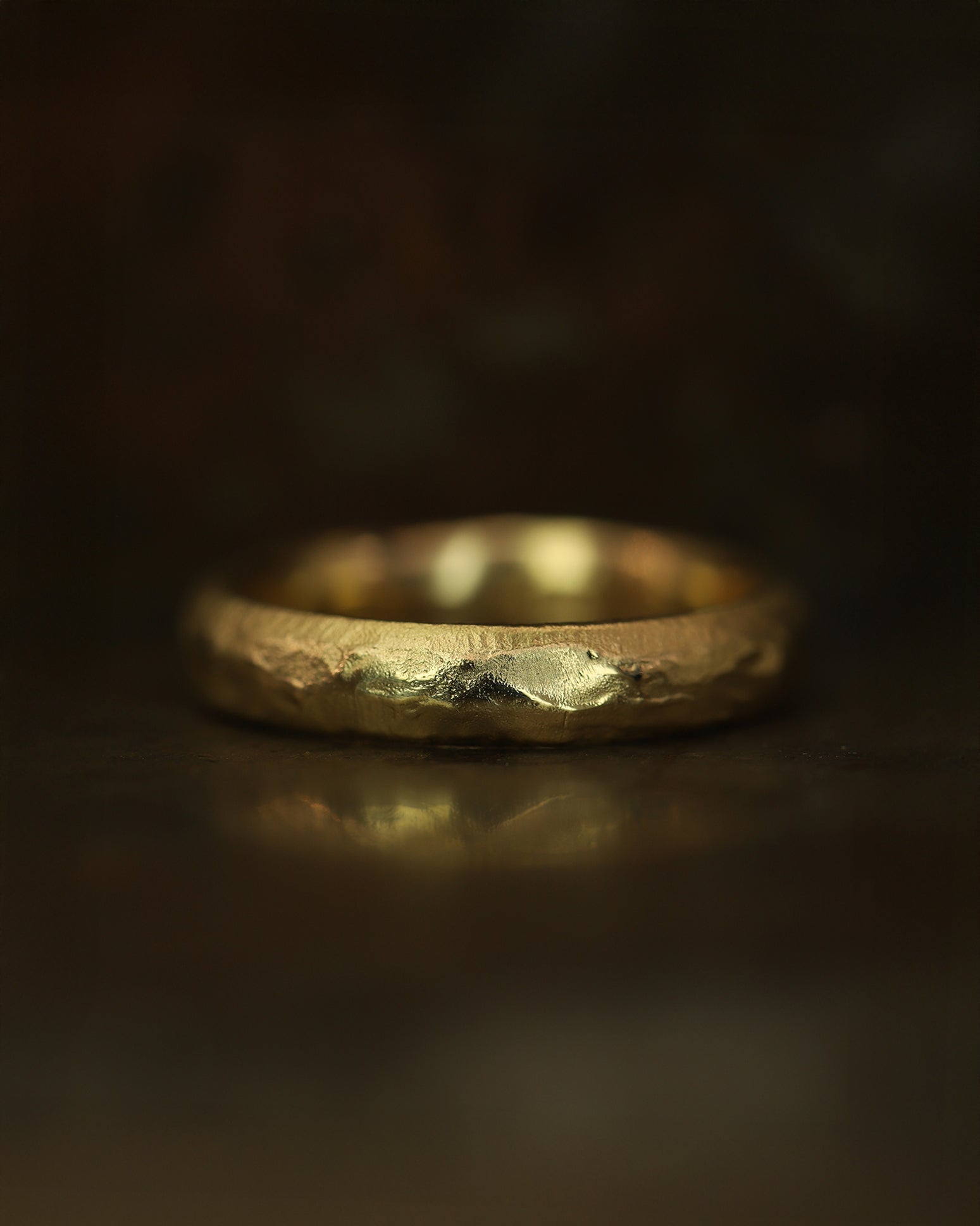 The LXV 4mm Gold Molten D Shape Wedding Band is inspired by the medieval jewellery hoards which have been found across Scotland. A heavy weight band; the molten, organic texture and heavier weight means the gives the ring a very textural aesthetic. Perfect as an alternative wedding ring.