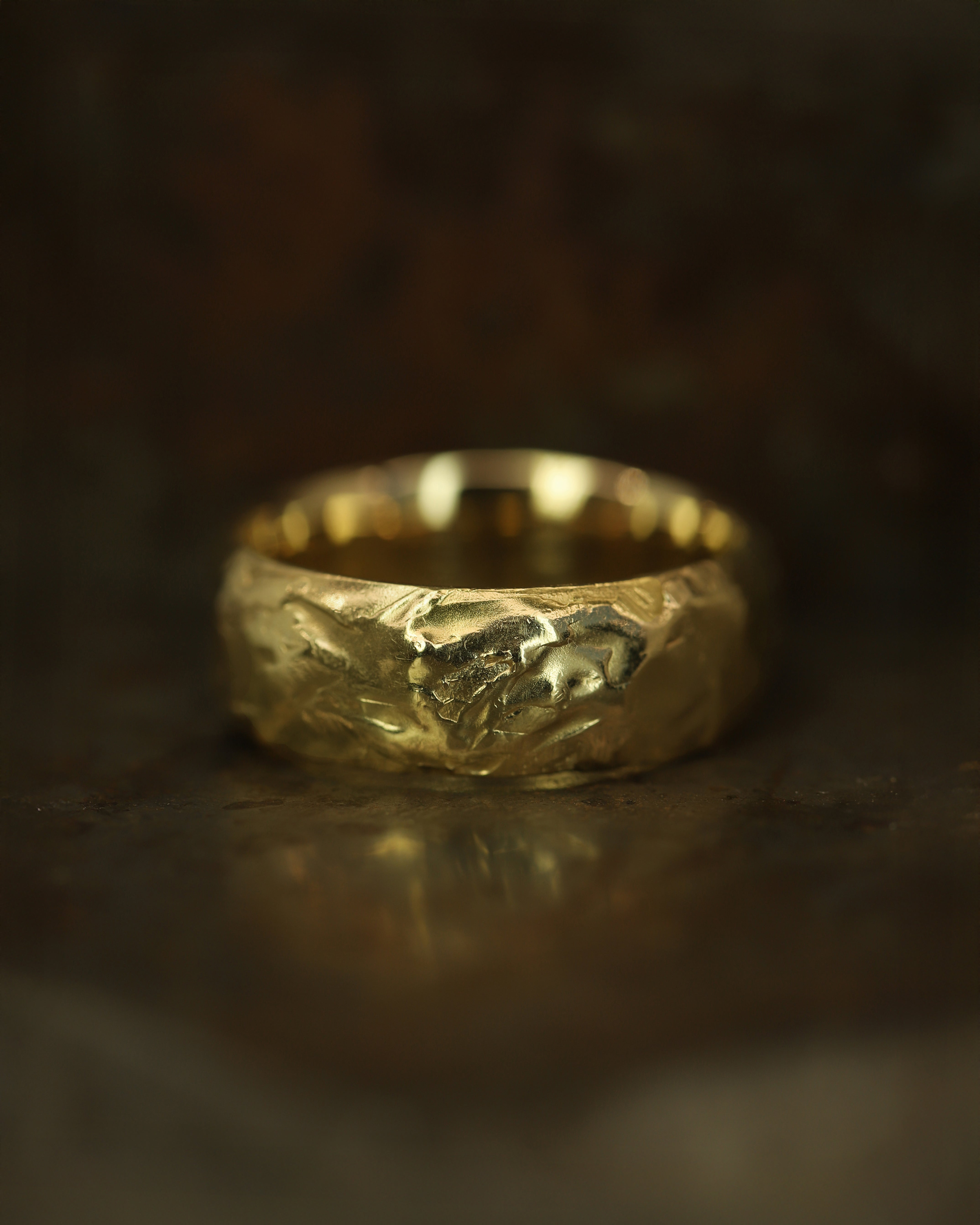The LXV 8mm Gold D Shape Wedding Band is inspired by the medieval jewellery hoards which have been found across Scotland. A heavy weight band; the molten, organic texture and heavier weight means the gives the ring a very textural aesthetic. Perfect as an alternative wedding ring.
