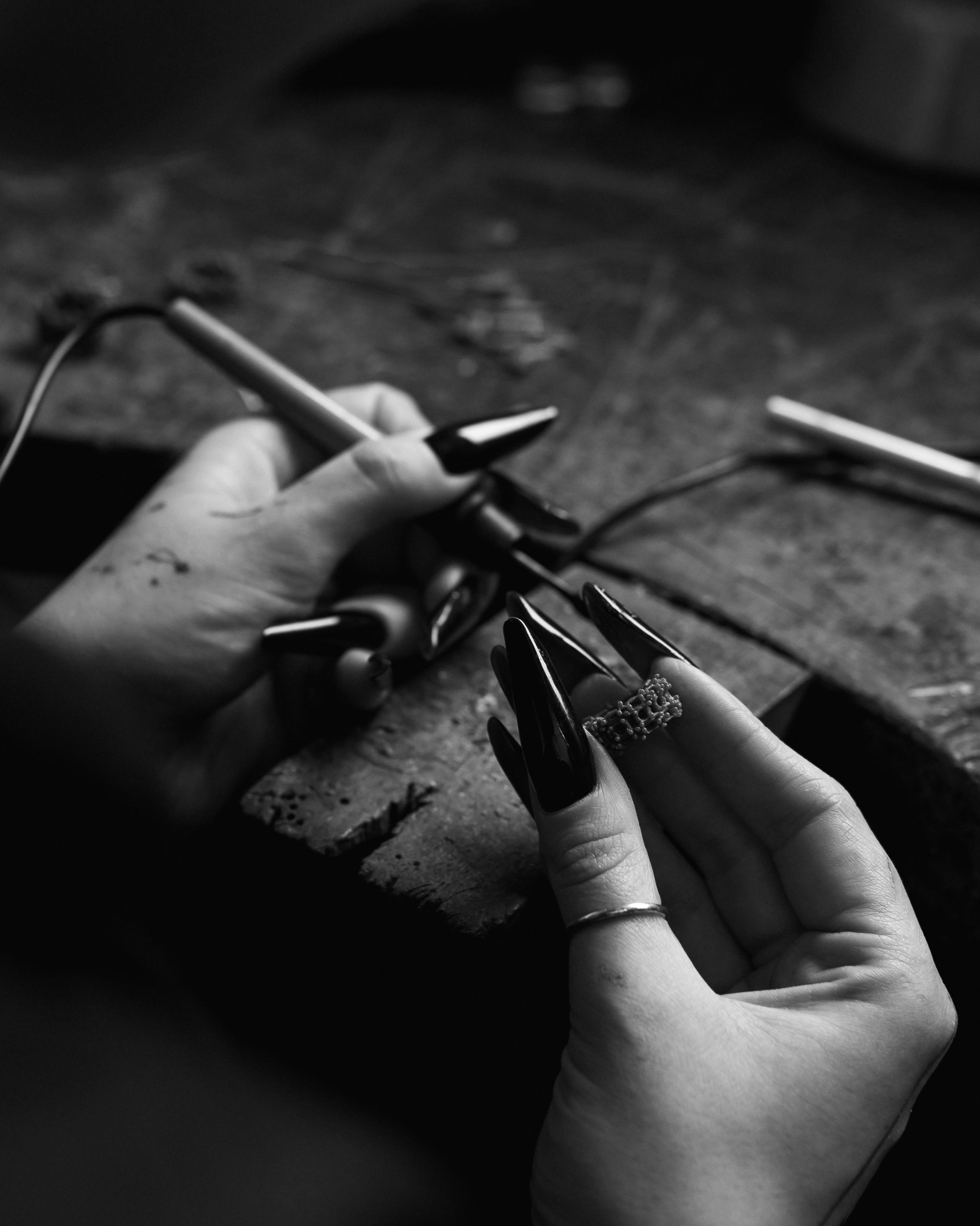Ellis then went on to learn technical skills through a BA in Jewellery & Silversmithing at The Glasgow School of Art, before moving to London in 2015, to study for a Masters in Jewellery Design at Central Saint Martins. Ellis launched her brand in 2018, with a desire to create jewellery inspired by her heritage, a belief in the beauty of imperfections, hand craftsmanship and to provide clients with jewellery to be handed down the generations.